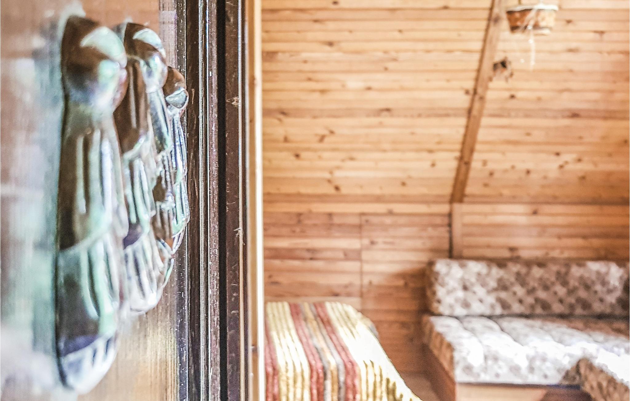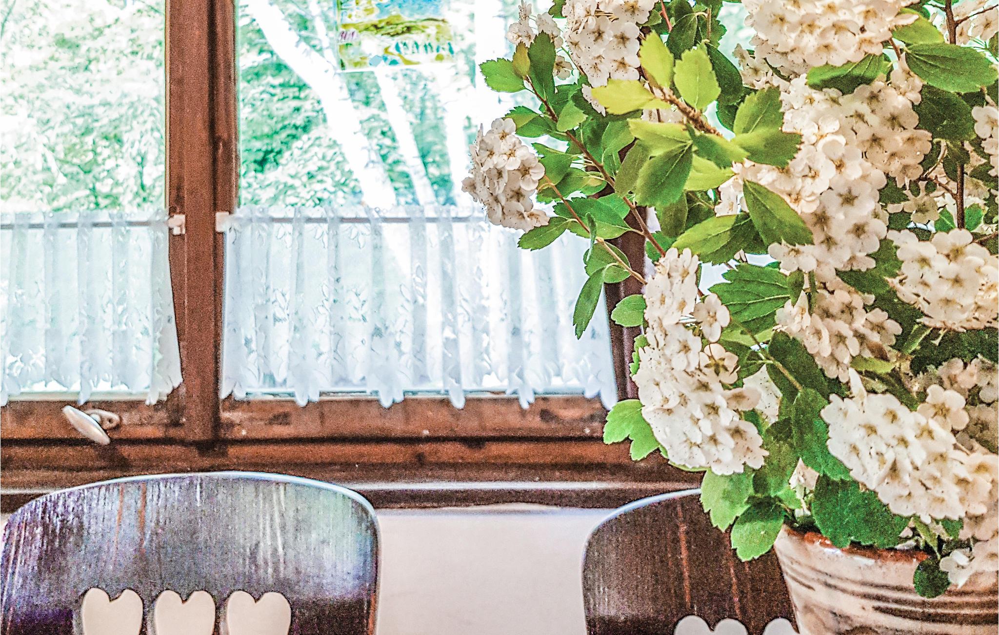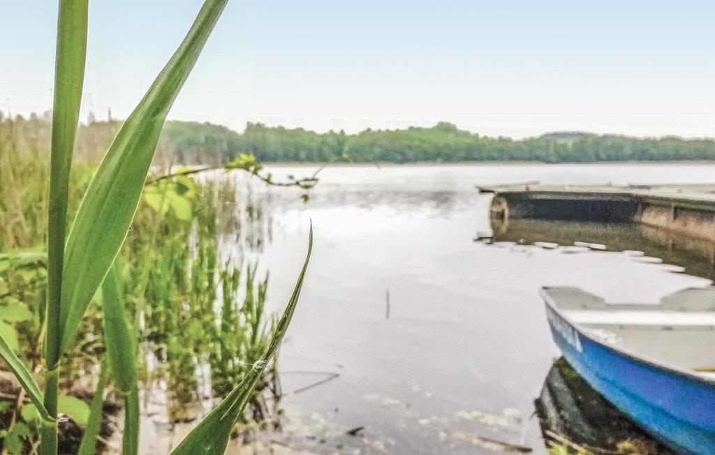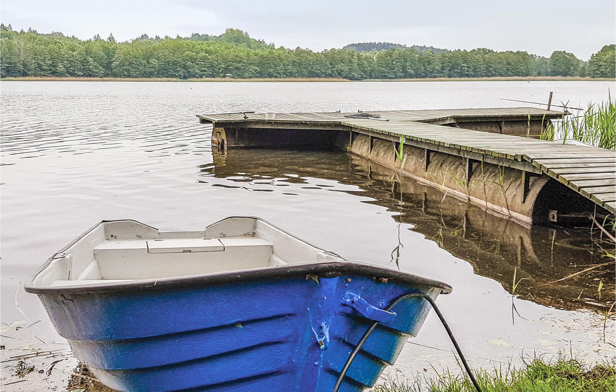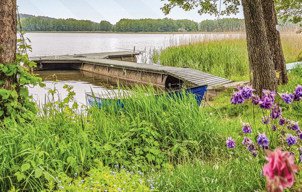 Jeres enkle træhus ligger lige ud til søen og tilbyder fredelig indkvartering midt i det masuriske landskab. Her vil I tilbringe en ukompliceret ferie med fokus på afslapning og nærhed til vandet. Nyd den varme atmosfære i opholdsstuen med dens enkle møblering og brug siddeområdet til afslappende aftener. Det store spisebord lægger op til at samles, mens de store vinduer lukker masser af lys ind og tilbyder udsigt over de omkringliggende grønne områder.