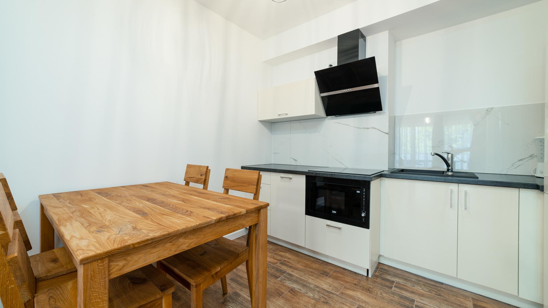 Alle angebotenen Apartments verfügen über eine voll ausgestattete Küchenzeile und ein elegantes Badezimmer mit Dusche.