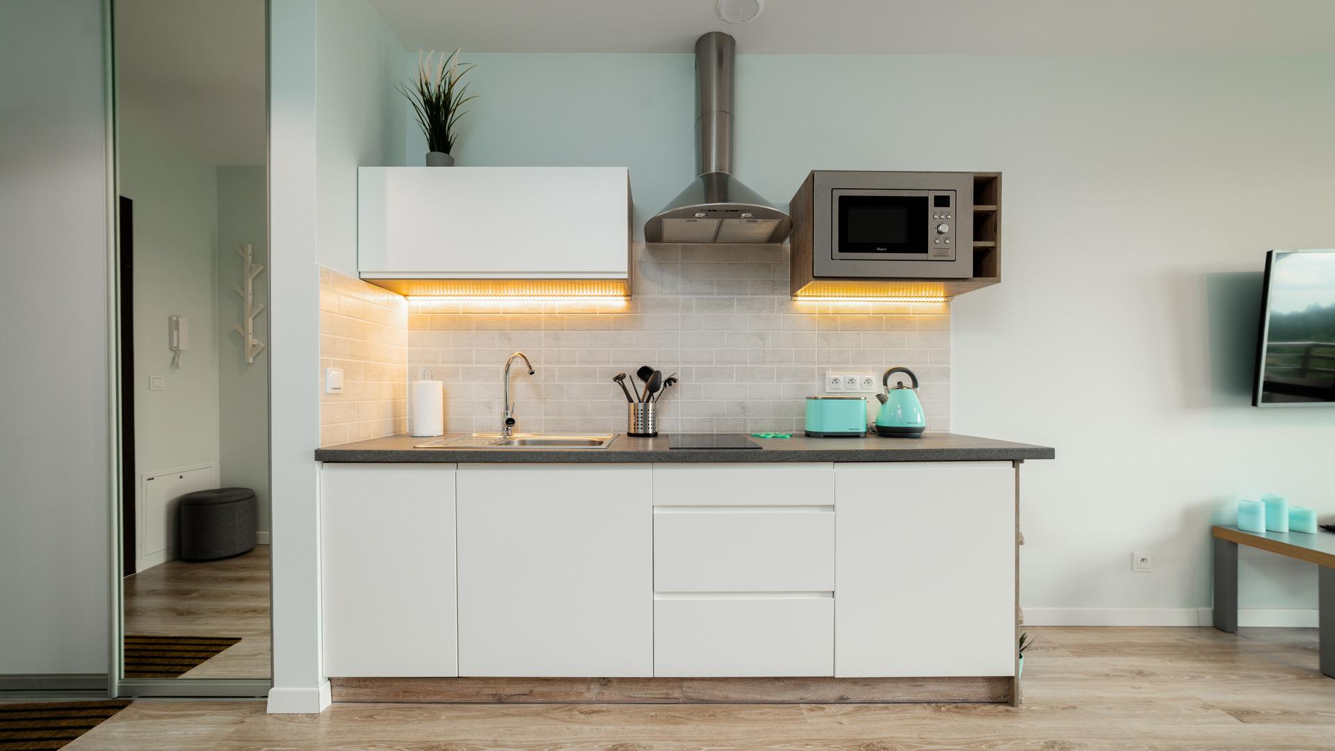 Alle angebotenen Apartments verfügen über eine voll ausgestattete Küchenzeile und ein elegantes Badezimmer mit Dusche.