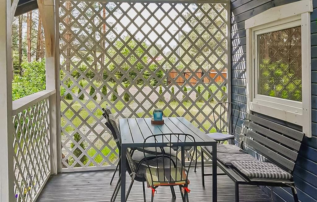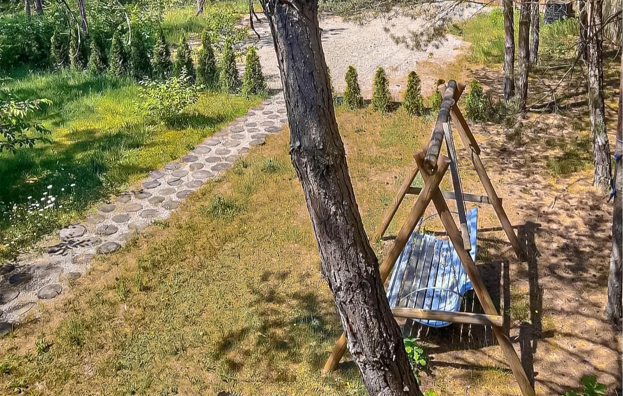 Udeområdet er oplagt til socialt samvær. Sid på den overdækkede terrasse med spisebord eller slap af på loungemøblerne. Til hyggelige aftener omkring bålet er der et bålsted med bænke i den skyggefulde del af haven. Børnene vil nyde en gynge, en hængekøje og den store fælles legeplads med rutsjebane, gynger og klatrestativ på den nærliggende grund. En tøndesauna og et spabad, begge fælles, sikrer afslappende øjeblikke.