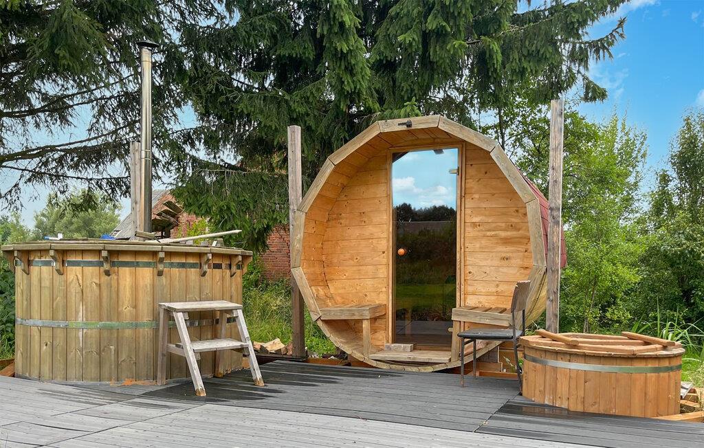 Ren idyl har dette smukke træhus med tøndesauna og spabad.