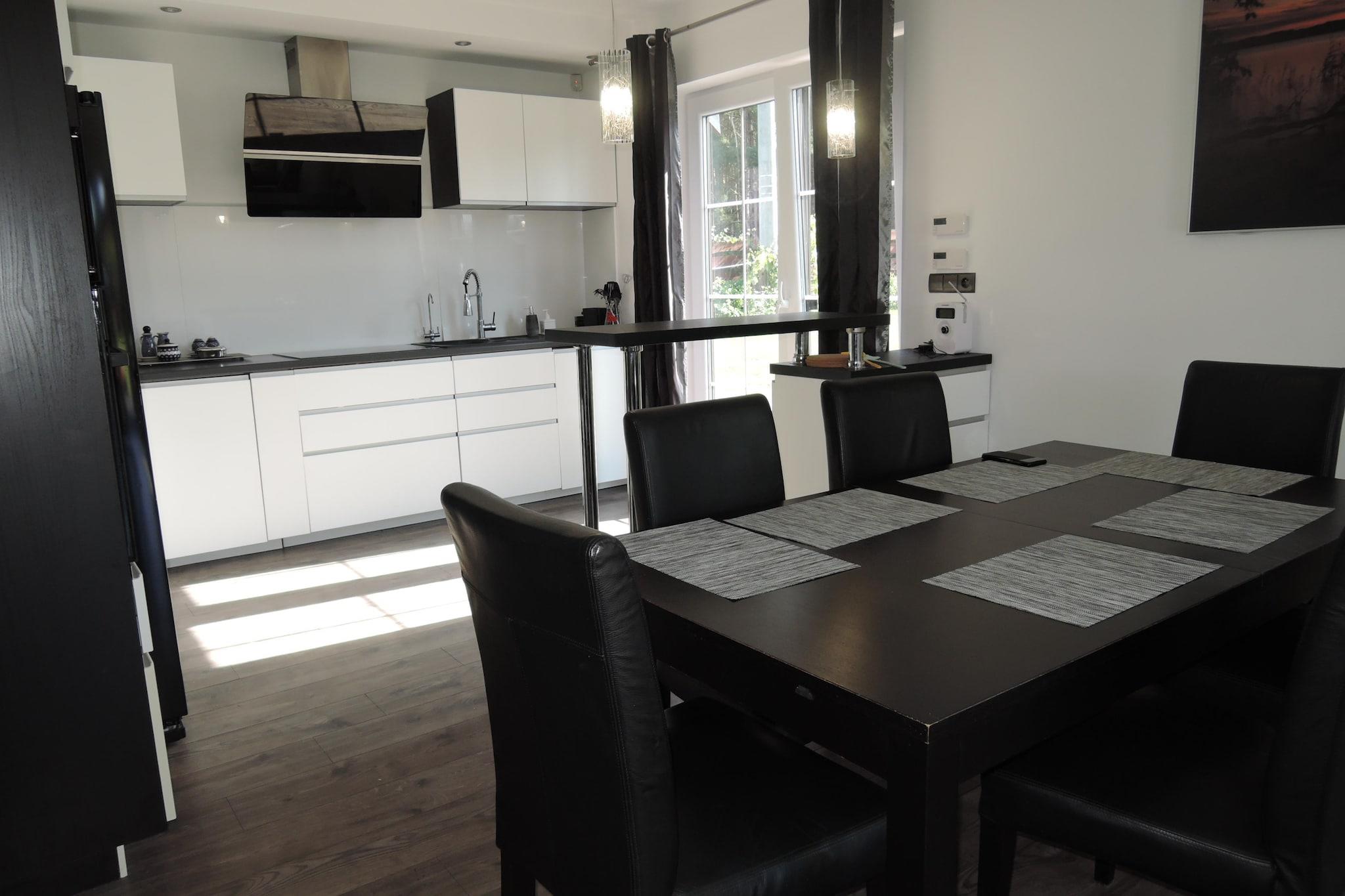 Stueetage: (åbent køkken(elkedel, cooker, brødrister, komfur(Komfur med fire kogeplader, induktion), espressomaskine, ovn, mikrobølgeovn, opvaskemaskine , køle-fryseskab), stue / spisestue(Fjernsyn(Tyske TV-kanaler), spisebord, pejs, sofahjørne), soveværelse(dobbelt-foldeseng), badeværelse(bruser, håndvask, toilet)) På 1. etage: (soveværelse(enkeltseng, enkeltseng), soveværelse(enkeltseng, enkeltseng), soveværelse(enkeltseng, enkeltseng), soveværelse med gennemgang(enkeltsovesofa), badeværelse(bruser, håndvask, toilet), badeværelse(bruser, håndvask, toilet)) opholdsrum, grill, Bubble bath, terrasse, have, havemøbler, grill, parkering, swimmingpool(deles med andre gæster, udendørs, 3 x 3 m.), bordtennisbord, barneseng, barnestol, baby crib(free)