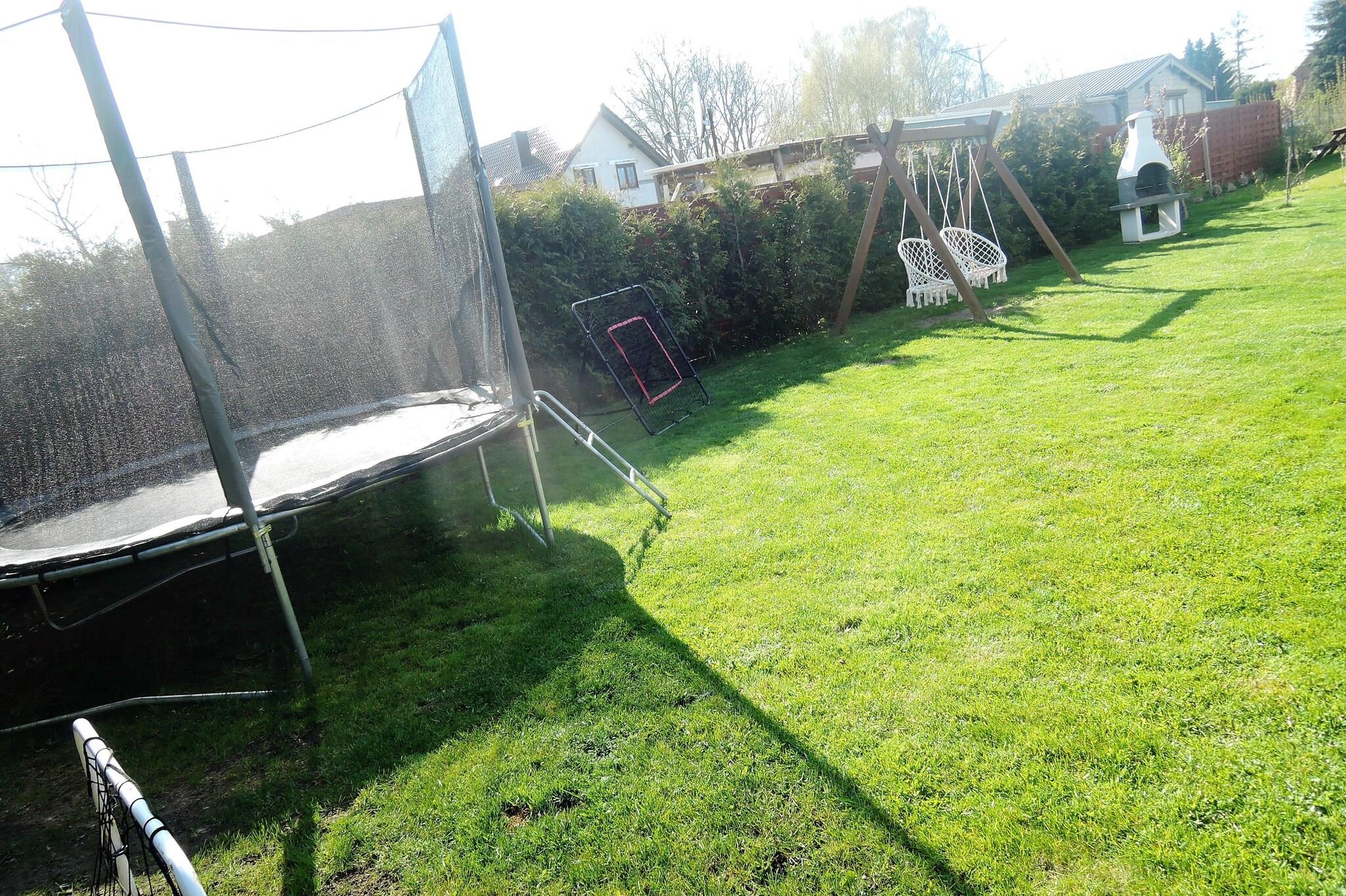 Stueetage: (åbent køkken(spisebord, elkedel, cooker, brødrister, komfur(Komfur med fire kogeplader, elektrisk), emhætte, espressomaskine, køle-fryseskab), Stue/soveværelse(dobbeltsovesofa, Fjernsyn), soveværelse(dobbeltseng), soveværelse(enkeltseng, enkeltseng), badeværelse(bruser, håndvask, toilet)) terrasse, have(deles med andre gæster, indhegnet, anlagt have), havemøbler, grill, trampolin, Gyngestativ