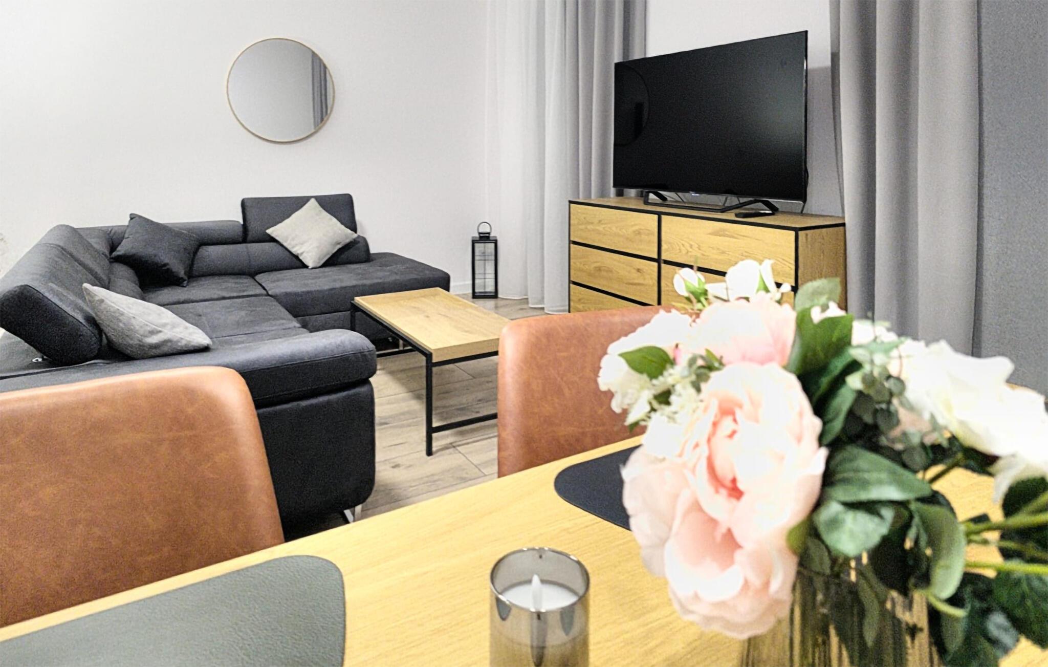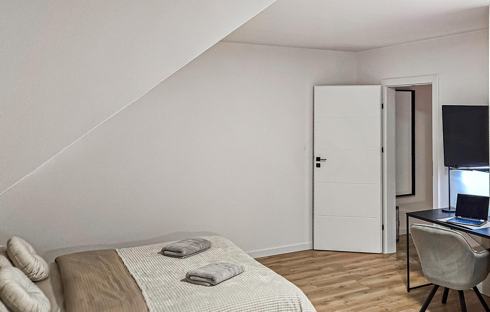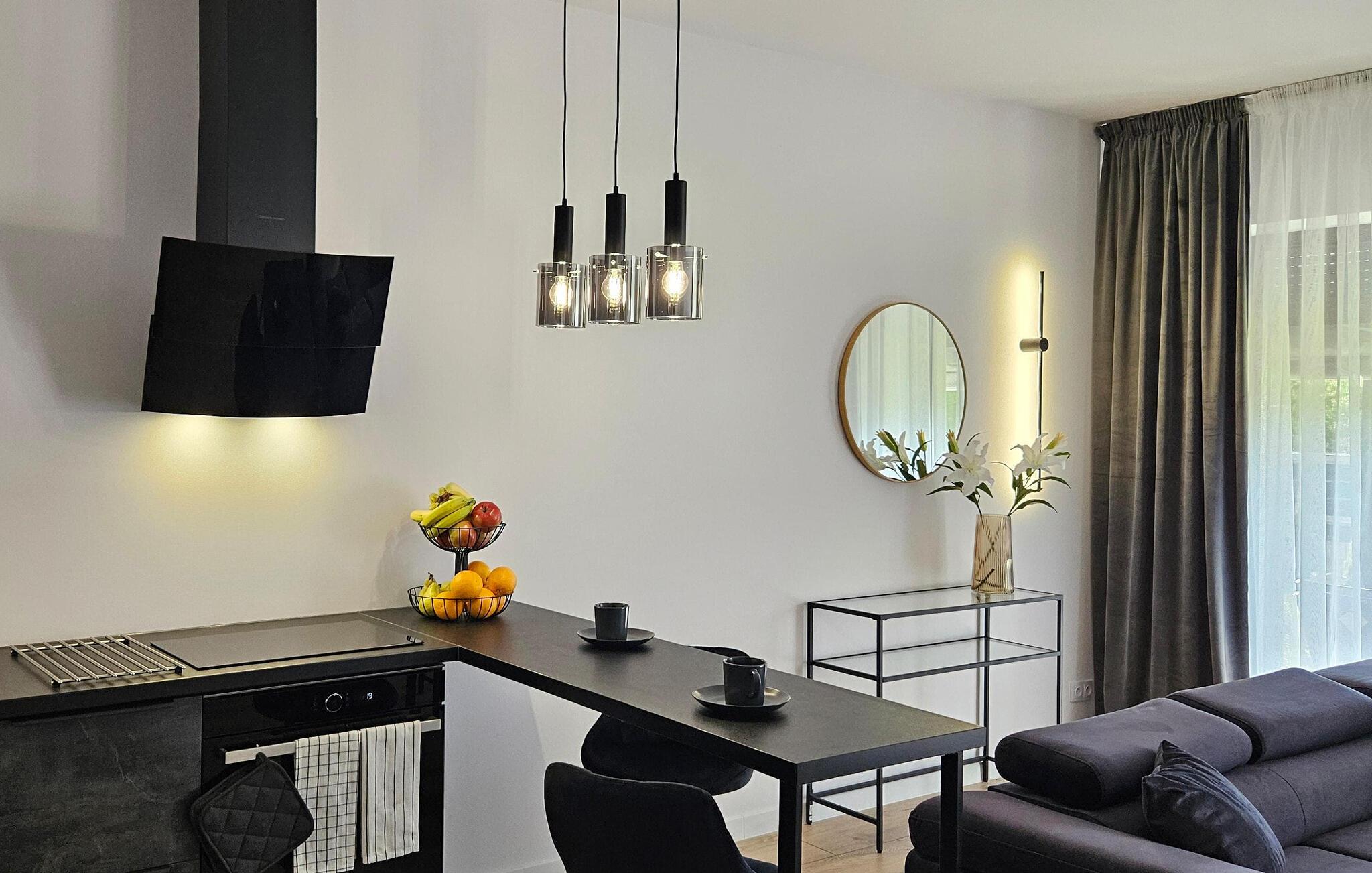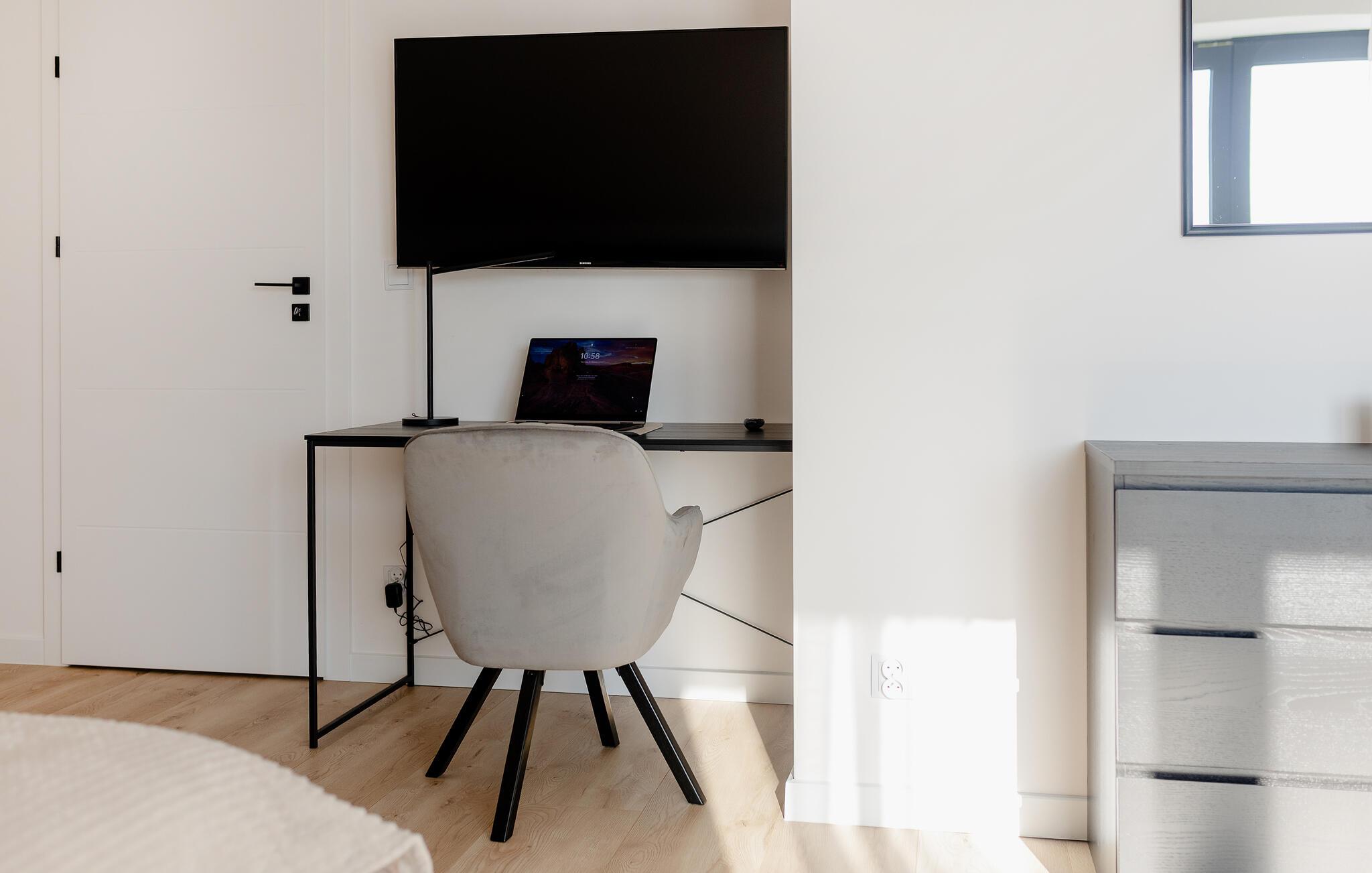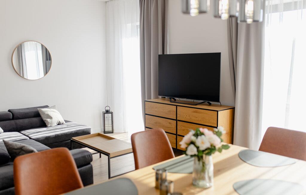 Træd ind i det lyse interiør og nyd det rene, indbydende design med masser af naturligt lys. Læn jer tilbage i den åbne stue og spisestue, der er møbleret med en komfortabel sofa, et fladskærms-tv og et rummeligt spisebord. Tilbered måltider i det moderne køkken, der er udstyret med apparater af høj kvalitet og rigelig bordplads. Lav mad sammen og tilbring kvalitetstid sammen. Om aftenen kan I nyde den rolige atmosfære, der skabes af de stilfulde møbler.