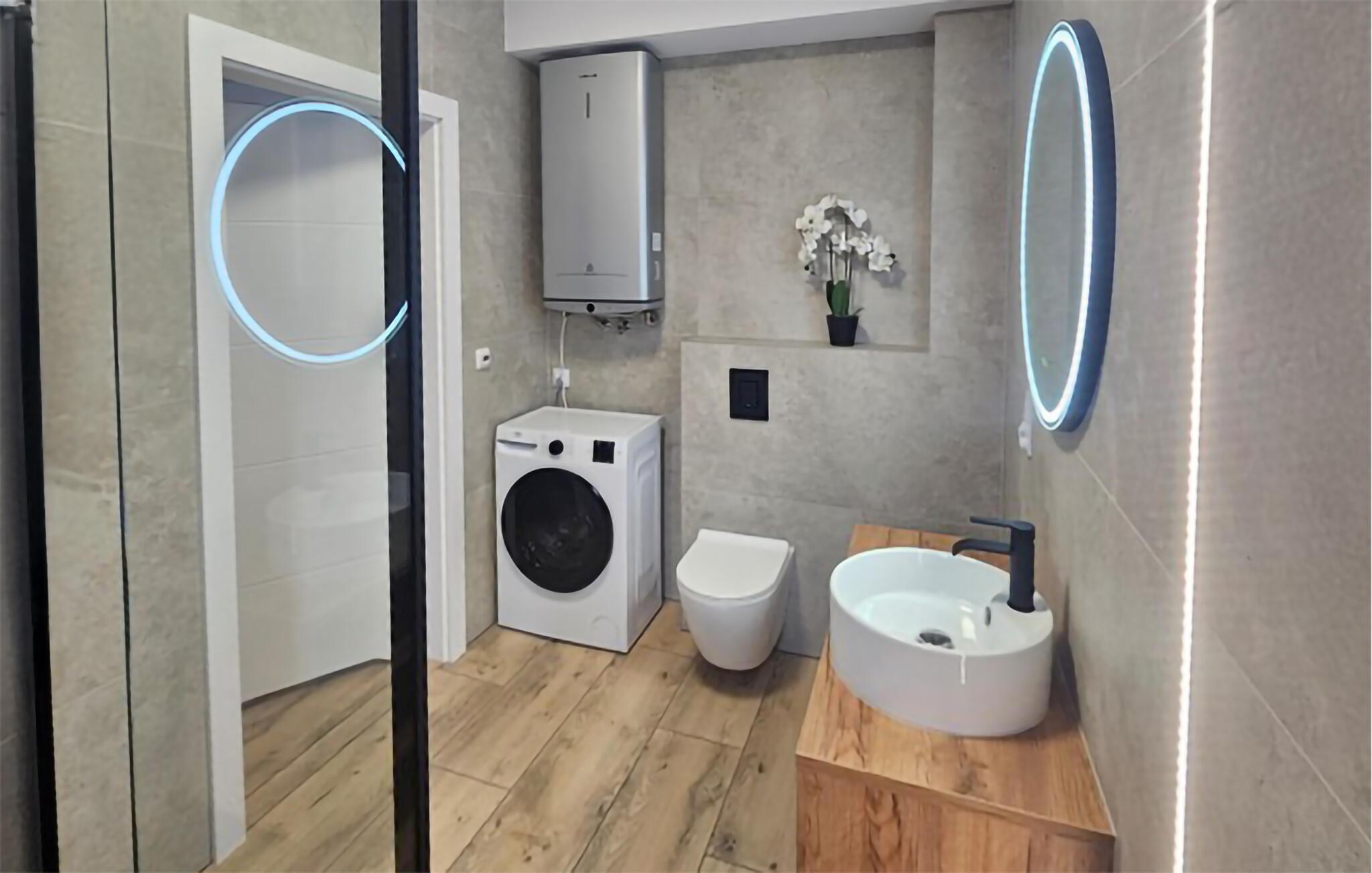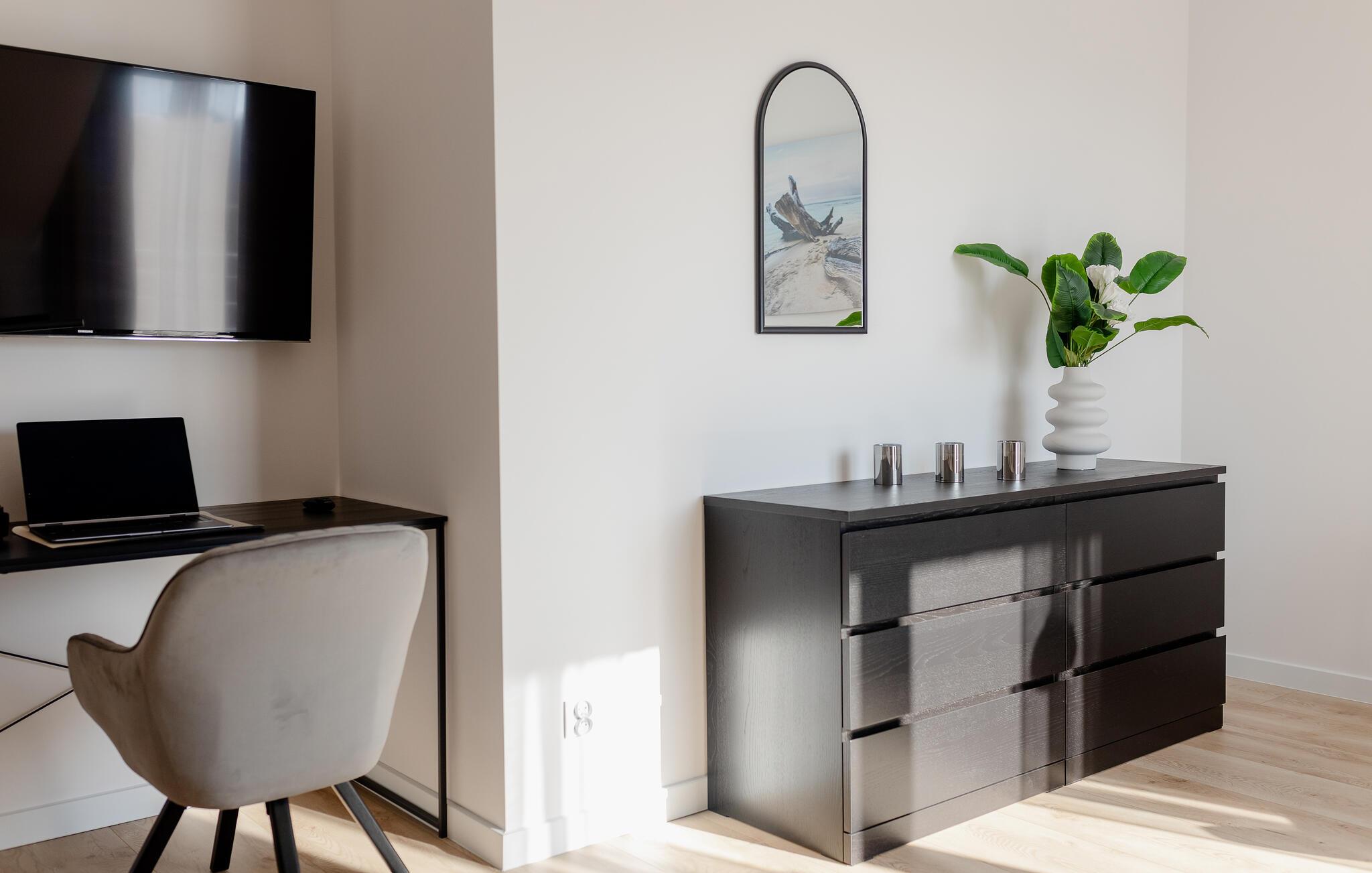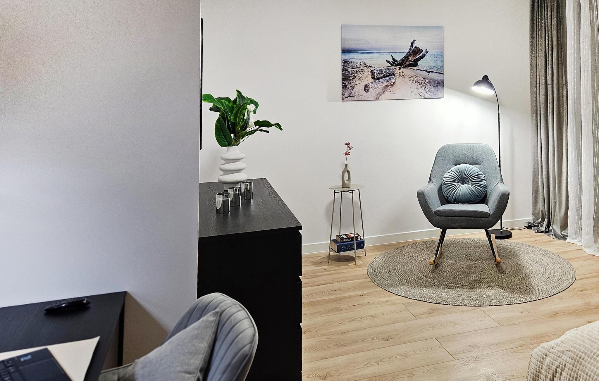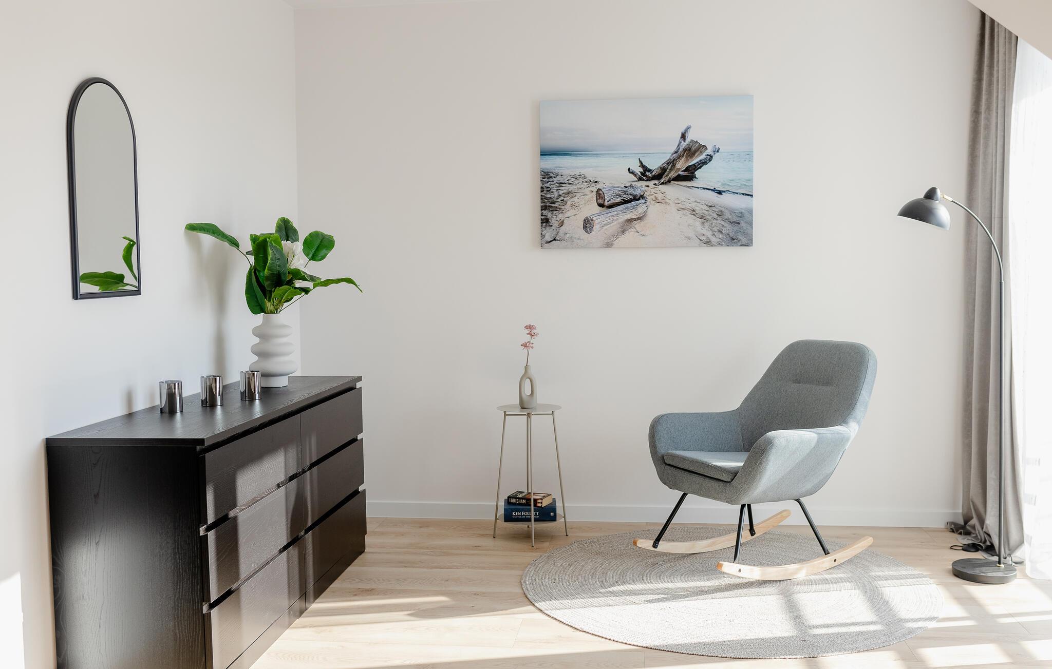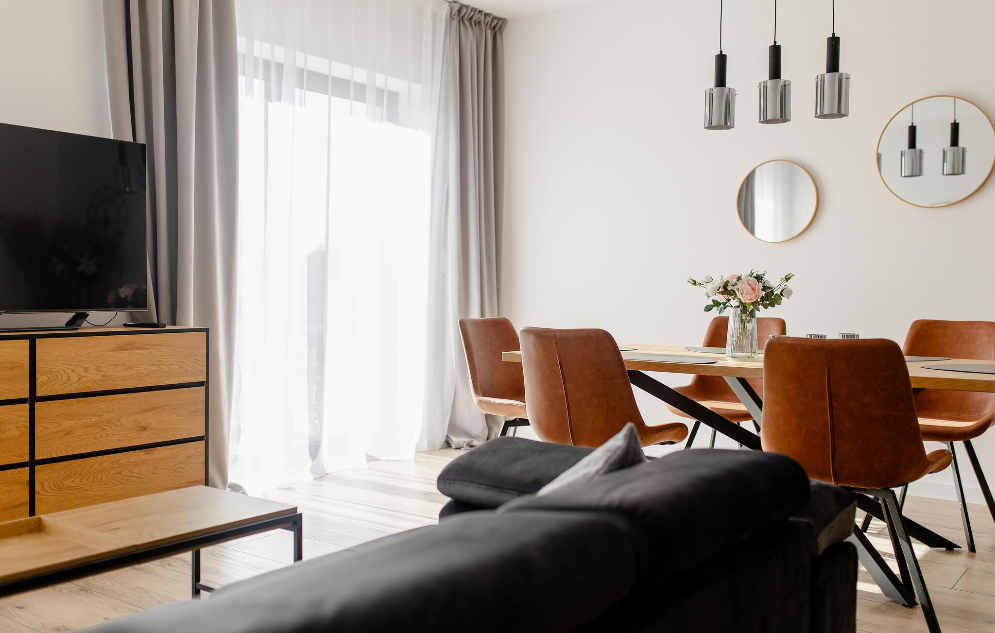 Træd ind i det lyse interiør og nyd det rene, indbydende design med masser af naturligt lys. Læn jer tilbage i den åbne stue og spisestue, der er møbleret med en komfortabel sofa, et fladskærms-tv og et rummeligt spisebord. Tilbered måltider i det moderne køkken, der er udstyret med apparater af høj kvalitet og rigelig bordplads. Lav mad sammen og tilbring kvalitetstid sammen. Om aftenen kan I nyde den rolige atmosfære, der skabes af de stilfulde møbler.