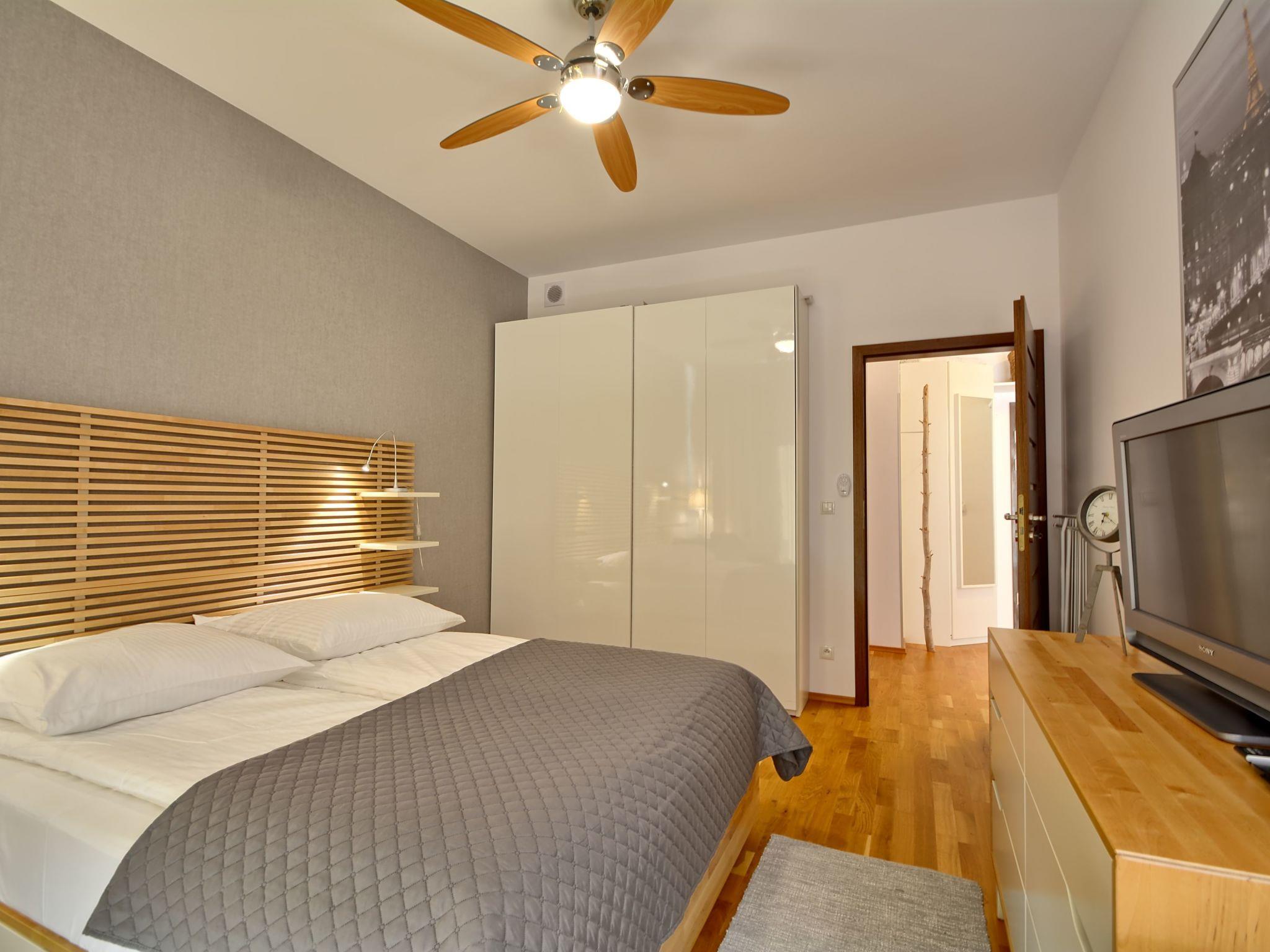 - a bedroom with a large double bed (160cmx200cm) with a set of professional hotel damask bedding, a chest of drawers, a wardrobe, a desk, an LCD TV; in the Bedroom there is a remote-controlled ceiling fan;