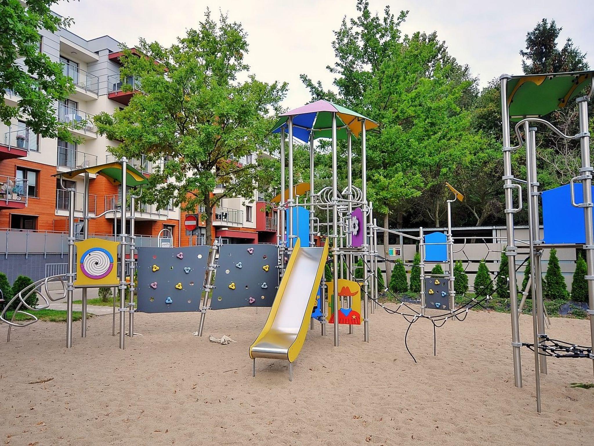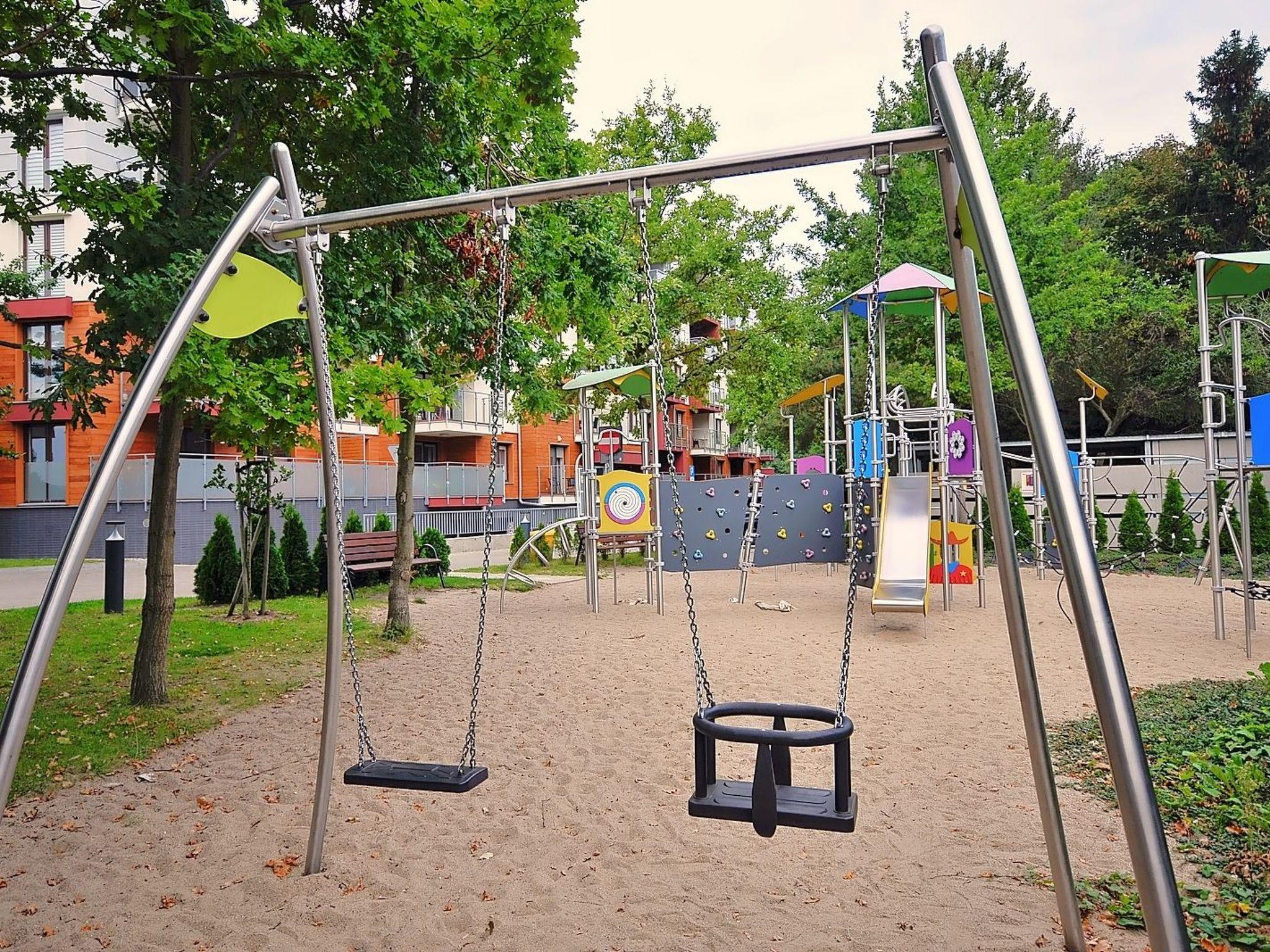 - two playgrounds - equipped with, among other things, a slide with a platform, swings, ladders, climbing ropes. One for younger children, which is located in the wind-protected inner courtyard. A second, larger one for older children - with a completely different type of play equipment - is located on the other side of the building.
