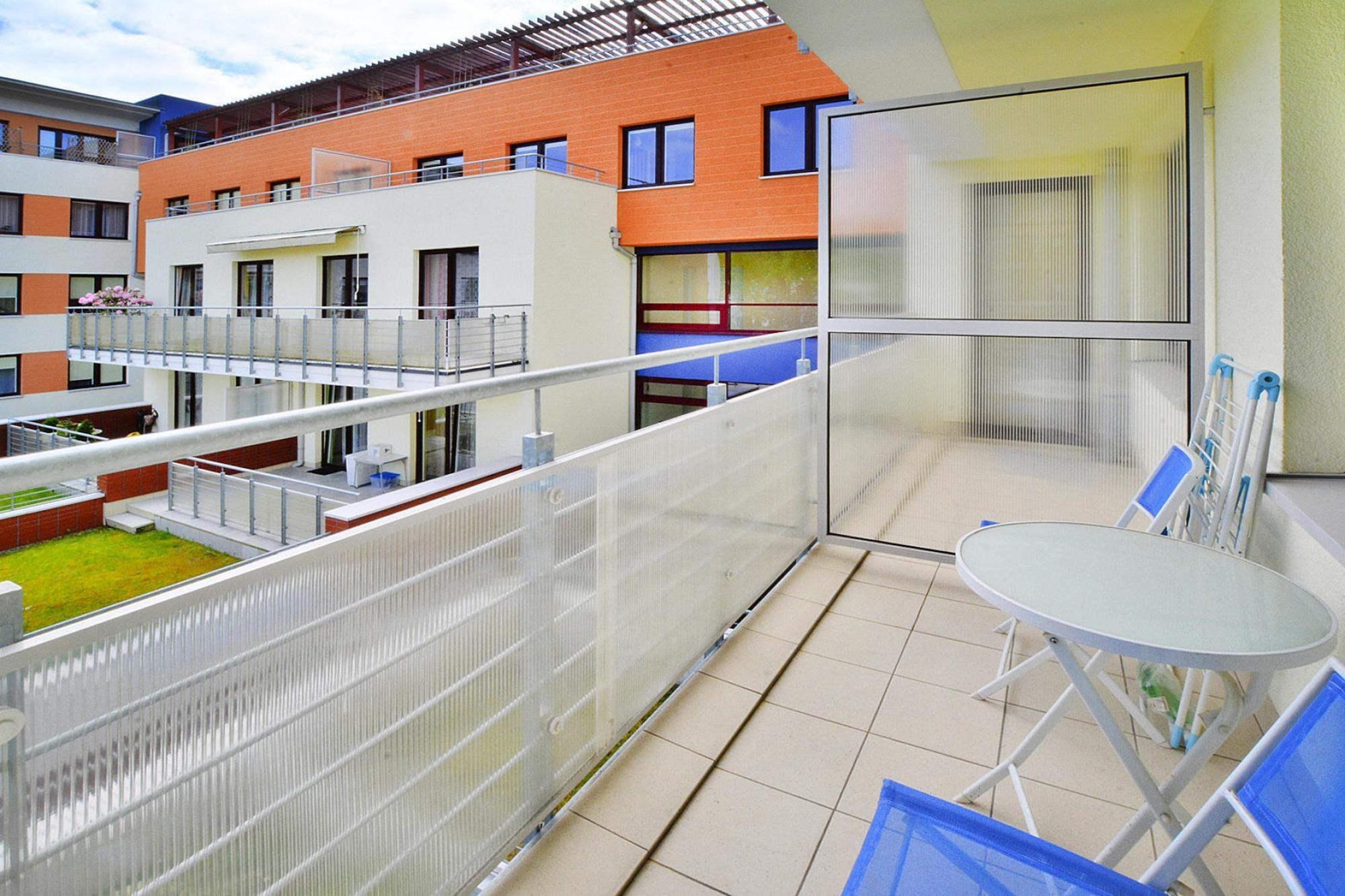 På 1. etage: (åbent køkken(kogeplade(Komfur med fire kogeplader, induktion), elkedel, brødrister, kaffemaskine, ovn, mikrobølgeovn, opvaskemaskine , køle-fryseskab), stue / spisestue(dobbeltsovesofa, Fjernsyn(parabol, Tyske TV-kanaler), spisebord(4 personer), radio), soveværelse(dobbeltseng), badeværelse(bruser, håndvask, toilet, vaskemaskine), pulterkammer) Internetadgang, balkon, varme(central), terrasse(deles med andre gæster), havemøbler, solstole, parking lot(public), fitnessapparater(deles med andre gæster), barnestol, baby crib(free)