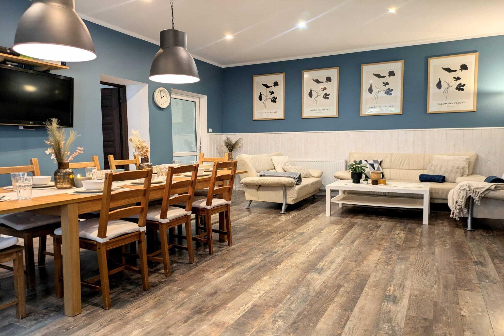 Et intimt fritidscenter i umiddelbar nærhed af Parseta-flodens bred. Området er roligt, få skridt fra centrum af feriestedet. 650 m til stranden. Tæt på fiskemarkedet, hvor du kan købe frisk fisk direkte fra kutteren. En komfortabel og meget rummelig lejlighed har plads til en gruppe på op til 14 personer. Den består af en stue (stort bord, TV, spillekonsol) forbundet med et veludstyret køkken. Der er 4 separate soveværelser, 2 badeværelser med brusere (der er vaskemaskine) og et separat toilet. Der er en overdækket terrasse med havemøbler og liggestole. Der er en legeplads med trampolin. Der er trådløst internet. På det indhegnede område er der en sauna (inkluderet i prisen for dit ophold) med et badekar, hvor du kan køle af, et sommerkøkken, parkering og en dejlig grillpavillon med grilludstyr og et røgeri. Ejendommen har direkte adgang til flodbredden, hvor du kan slappe af på liggestole eller fiske. Der er også en robåd til rådighed for alle gæster på stedet (gratis). Det er muligt at købe morgenmad på stedet. Prisen for dit ophold inkluderer: sengelinned, håndklæder, el- og vandforbrug, sauna, slutrengøring, internet, parkering, barneseng og højstol (forudgående booking påkrævet), robåd. Den største attraktion ved kurstedet Kolobrzeg er den brede sandstrand ved havet. Der er også mange vandreruter i kystparken, langs strandpromenaden, på den historiske mole og i den gamle bydel. Det er værd at besøge det lokale fyrtårn, oceanariet, havnen og katedralen. For børnefamilier anbefaler vi et besøg i Pomerania Fun Park. Det er en park, der er åben året rundt, og som ligger i landsbyen Dygowo (ca. 15 km fra Kolobrzeg).