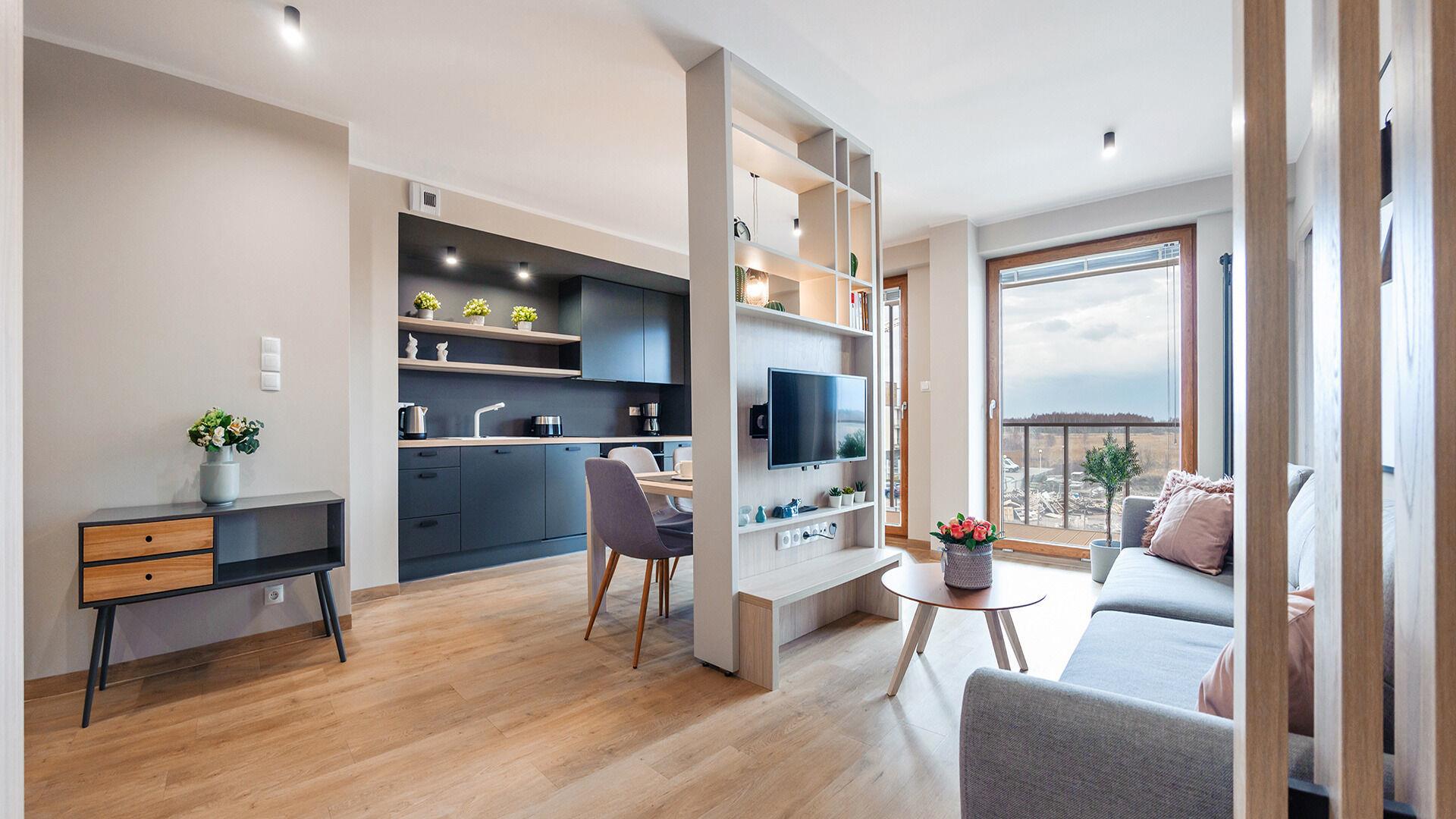 Die Apartments im Objekt Resorts Kolobrzeg befinden sich im westlichen Teil von Kolobrzeg, abseits des städtischen Trubels, umgeben vom Grün des NATURA-2000-Parks. Diese Lage garantiert saubere Luft, malerische Ausblicke und direkten Kontakt zur Natur. Die Plazowa-Straße mit ihren breiten Gehwegen und Radwegen ist ein Teil der R10-Fahrradroute. Ein fünfminütiger Spaziergang über einen direkten Zugang zum Meer reicht aus, um den breiten, sandigen „Weststrand” zu erreichen; ganz in der Nähe befindet sich auch ein Hundestrand. Alle Apartments sind hochwertig ausgestattet und verfügen über funktionale, voll ausgestattete Küchenzeilen sowie geräumige Terrassen mit Blick auf den Innenhof oder das Grün des NATURA-2000-Parks. Vor dem Gebäude gibt es einen öffentlichen, kostenpflichtigen Stadtparkplatz (begrenzte Anzahl an Stellplätzen). Auf dem Gelände stehen ein nummerierter Außenparkplatz sowie Parkplätze in der Tiefgarage zur Verfügung, die den meisten Apartments zugeordnet sind und gegen Aufpreis genutzt werden können. Im Objekt befindet sich ein Schwimmbad, das täglich von 10:00 bis 21:00 Uhr geöffnet ist, sowie eine Sauna, die täglich von 16:00 bis 21:00 Uhr geöffnet ist. Der Pool befindet sich im Gebäude A; aus Gebäude B gibt es keinen direkten Zugang zu Gebäude A.