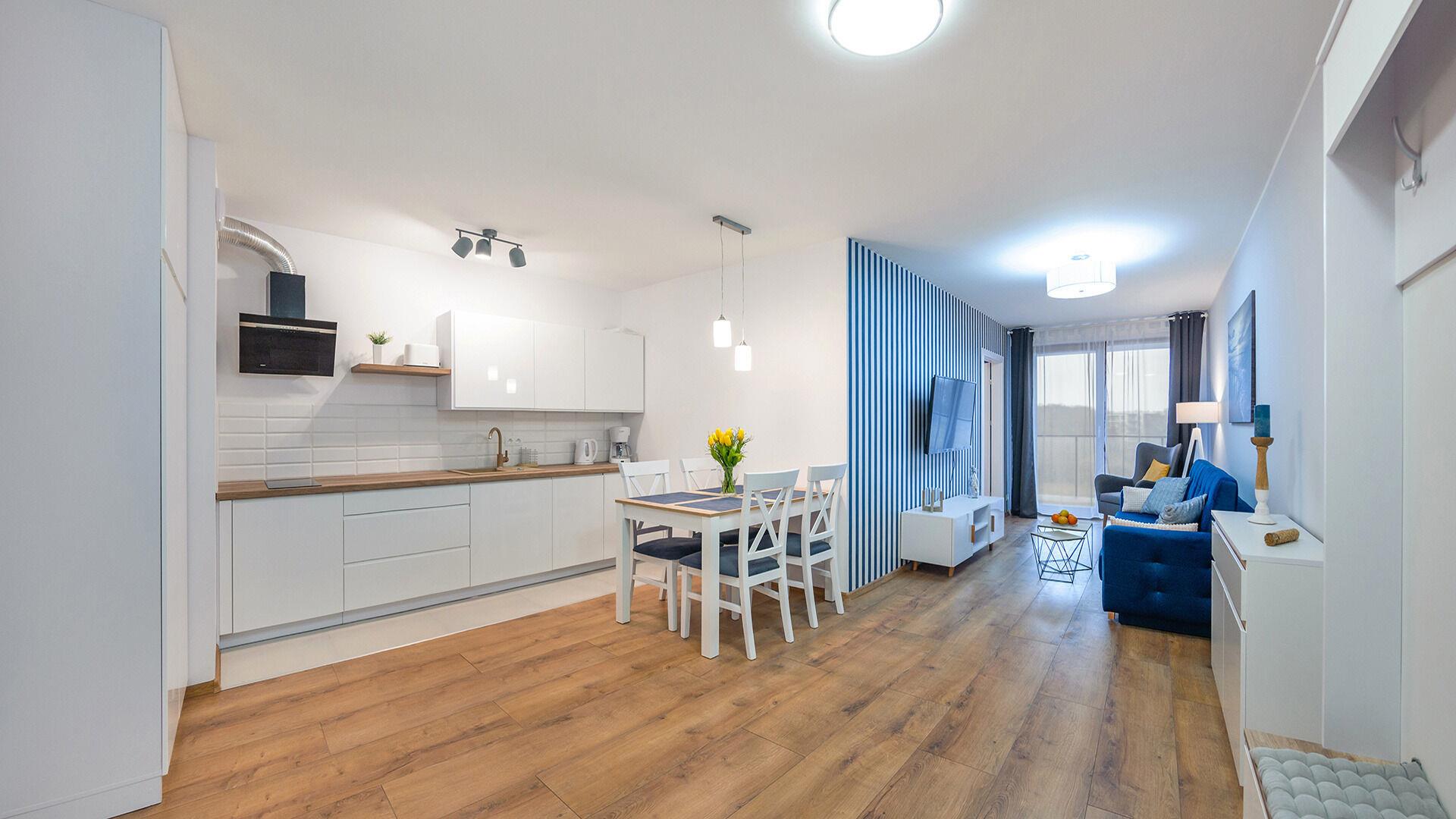 Die Apartments im Resorts Kolobrzeg liegen im ruhigen, westlichen Teil der Stadt, umgeben vom NATURA-2000-Park und nur wenige Minuten vom breiten Weststrand sowie einem Hundestrand entfernt. Die Lage bietet saubere Luft, direkten Kontakt zur Natur und Zugang zu Rad- und Spazierwegen. Die Apartments sind hochwertig ausgestattet und verfügen über voll ausgestattete Küchenzeilen sowie große Terrassen. Auf dem Gelände stehen nummerierte Außenparkplätze und Tiefgaragenplätze gegen Aufpreis zur Verfügung, zudem gibt es einen öffentlichen, kostenpflichtigen Parkplatz vor dem Gebäude. Gästen stehen ein täglich geöffneter Pool sowie eine Sauna zur Verfügung. Kolobrzeg bietet das ganze Jahr über zahlreiche Freizeit- und Kulturangebote sowie eine vielfältige Gastronomie.
