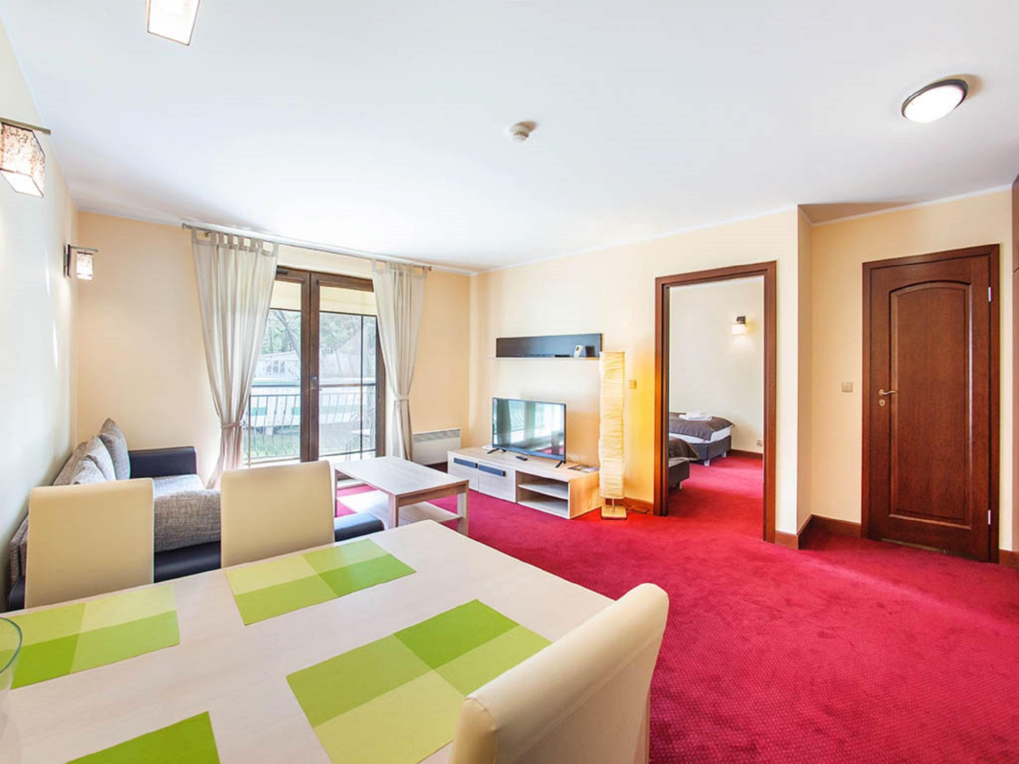 "Sun & Snow 4 people", 2-room apartment 31 to 43 m2. Living/sleeping room with 1 sofabed, satellite TV and DVD. 1 room with 1 double bed. Open kitchen (1 induction hot plates, kettle, microwave). Shower/WC. Heating, electric heating. Balcony. Facilities: iron. Internet (WiFi). Please note: smoke alarm.