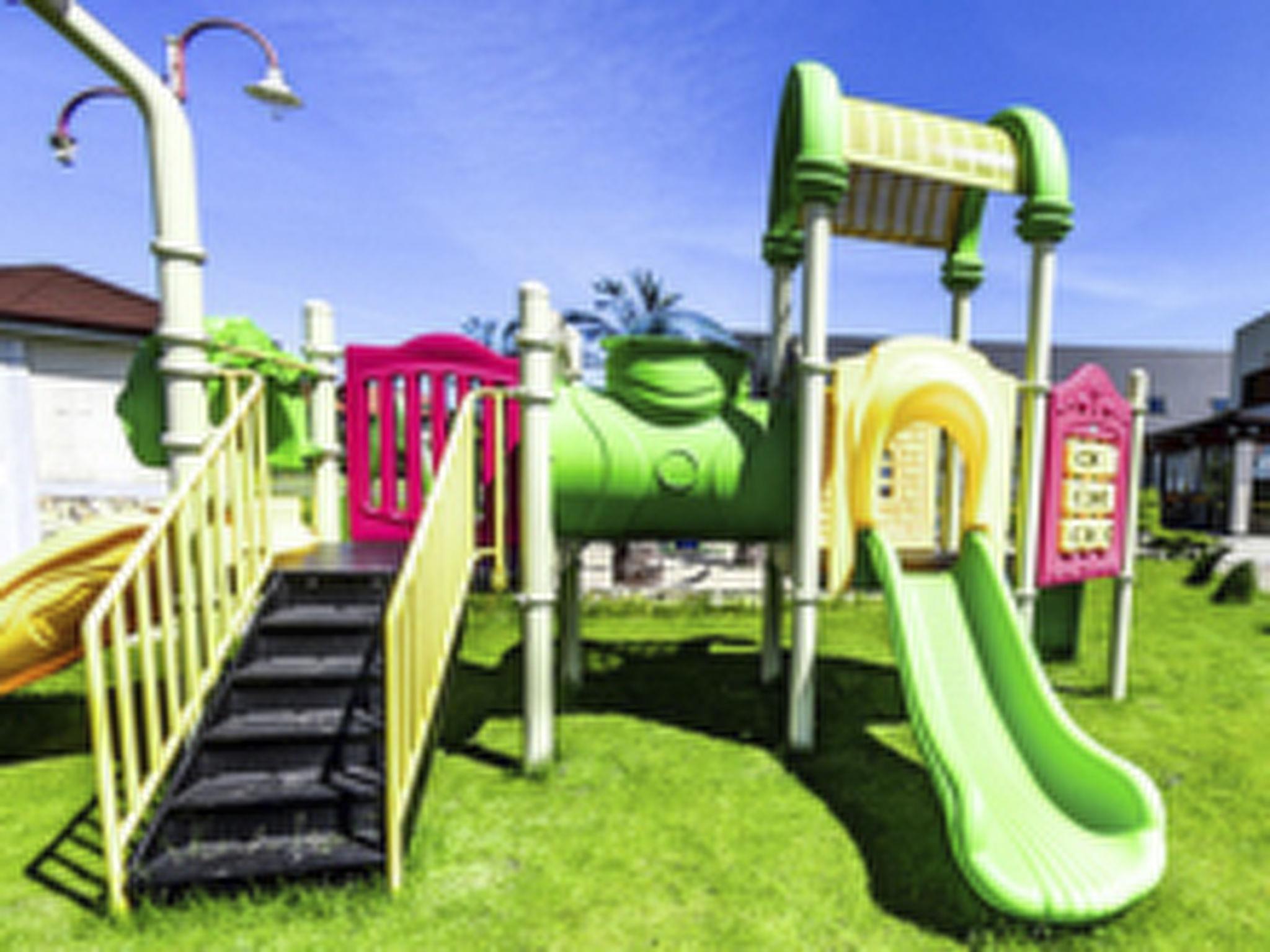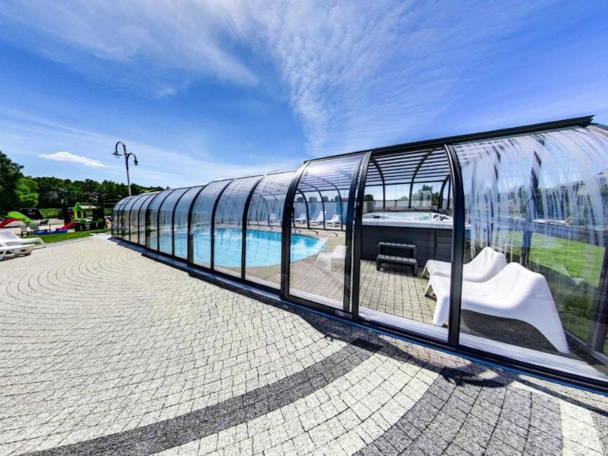 A covered heated swimming pool, sauna, jacuzzi, children's playground, large sandpit with hammocks and a barbecue area are available for guests.