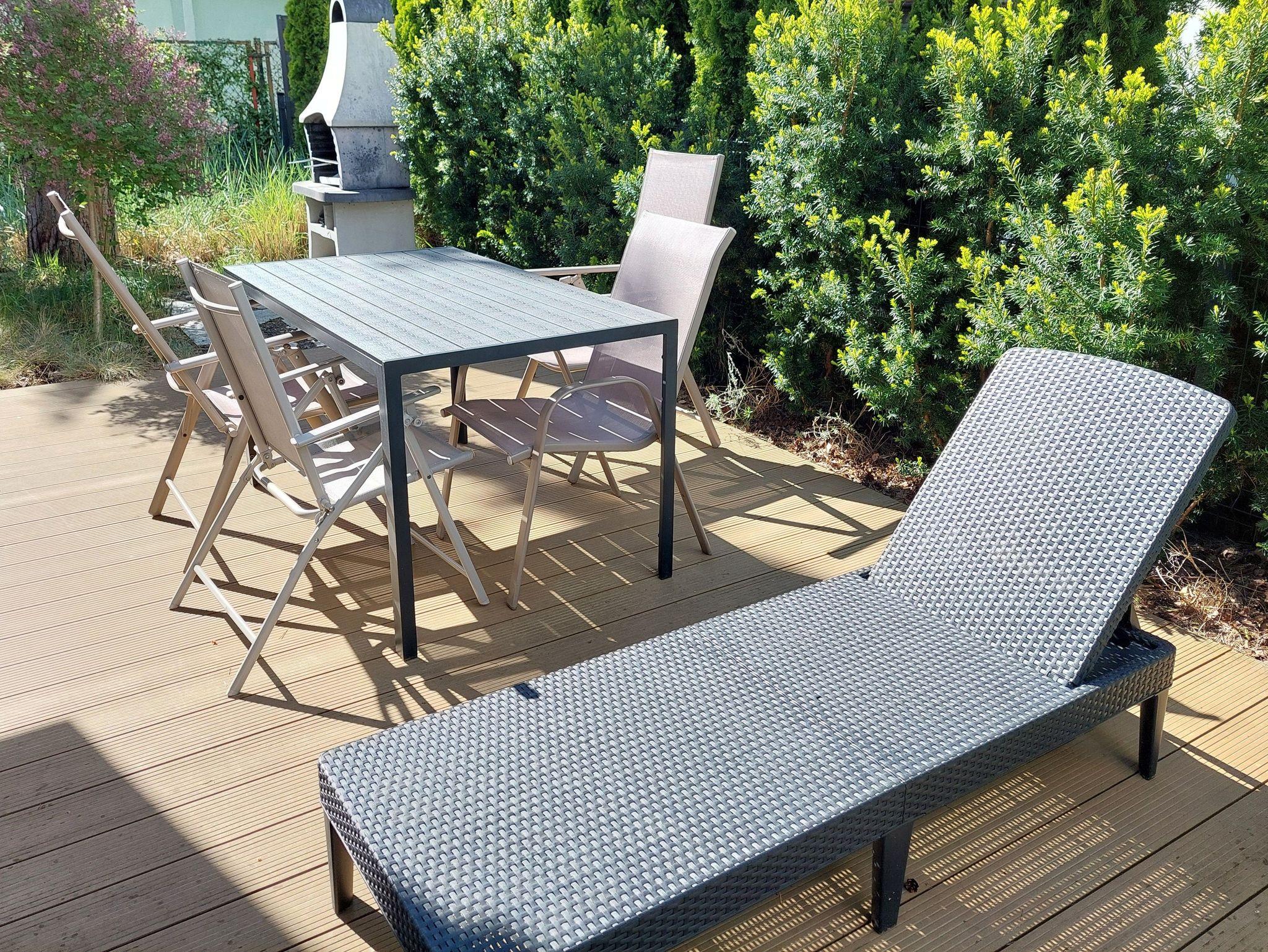 Die Wohnung verfügt sowohl über einen Balkon als auch über einen eigenen Garten (zur alleinigen Verfügung unserer Gäste) mit einer Fläche von 55 qm mit Terrasse und Grill. Sowohl auf dem Balkon als auch im Garten stehen Ihnen Gartenmöbel (Tische, Stühle, Sessel, Liege) zur Verfügung.