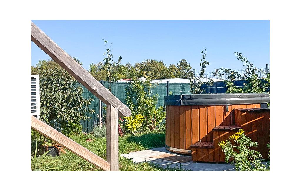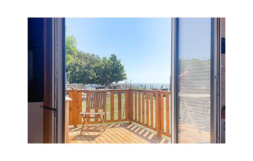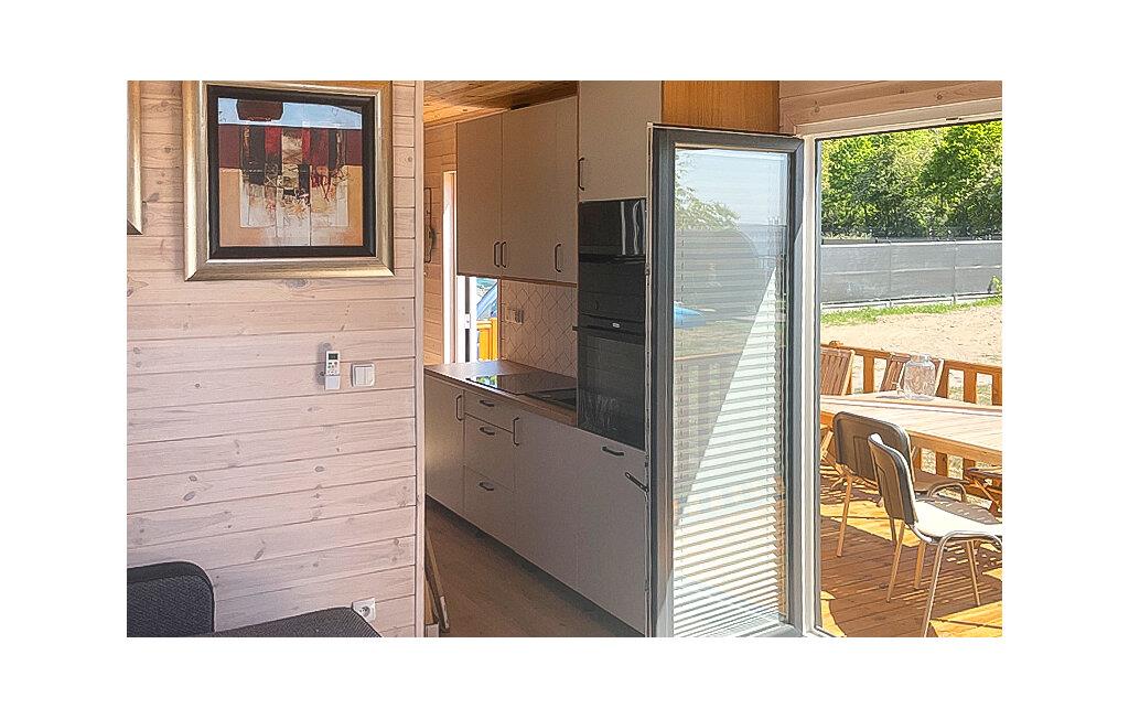 Nyd den unikke atmosfære i dette moderne tiny house med en rummelig terrasse og udsigt over Wicko Wielkie-søen. Den stilfulde indretning sikrer både komfort og hygge, og takket være den smarte rumopdeling udnyttes pladsen i den kompakte bolig optimalt. Et veludstyret tekøkken gør det nemt at tilberede lækre måltider, og den lille opholdsstue giver plads til afslappende stunder med familien.