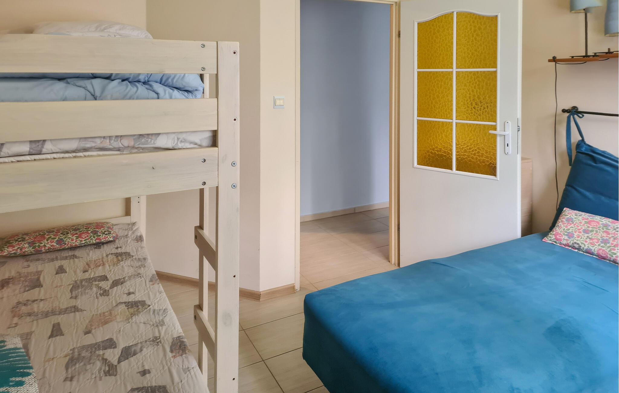 Tilbring en hyggelig familieferie i denne lejlighed med plads til hele familien, inkl. op til to kæledyr. Den er praktisk indrettet og har en hjemlig atmosfære over sig. I har adgang til en altan, hvor I kan nyde morgenkaffen, og en fælles grund med plads til udeaktiviteter.