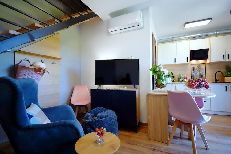 Stueetage: (åbent køkken(kogeplade(induktion), elkedel, emhætte, kaffemaskine, mikrobølgeovn, køle-fryseskab), stue / spisestue(dobbeltsovesofa(160 x 200 cm), Fjernsyn(fladskærm), spisebord), badeværelse(bruser, håndvask, toilet)) På 1. etage: (soveværelse(dobbeltseng), soveværelse(dobbeltsovesofa(140 x 190 cm))) Internetadgang, Parkering, Legeområde, Græsplæne, klimaanlæg, terrasse, have(deles med andre gæster, indhegnet), havemøbler, solstole, grill(trækul), trampolin, rutsjebane(deles med andre gæster), Solcreme, Gyngestativ