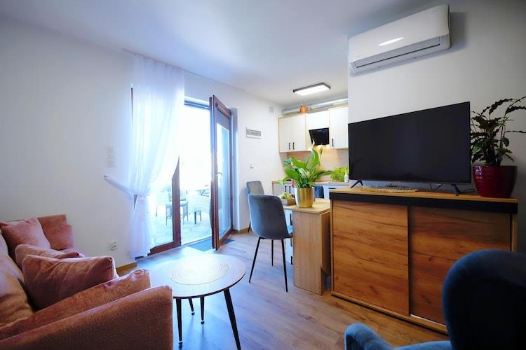 Stueetage: (åbent køkken(kogeplade(induktion), elkedel, emhætte, kaffemaskine, mikrobølgeovn, køle-fryseskab), stue / spisestue(dobbeltsovesofa(160 x 200 cm), Fjernsyn(fladskærm), spisebord), badeværelse(bruser, håndvask, toilet)) På 1. etage: (soveværelse(dobbeltseng), soveværelse(dobbeltsovesofa(140 x 190 cm))) Internetadgang, Parkering, Legeområde, Græsplæne, klimaanlæg, terrasse, have(deles med andre gæster, indhegnet), havemøbler, solstole, grill(trækul), trampolin, rutsjebane(deles med andre gæster), Solcreme, Gyngestativ
