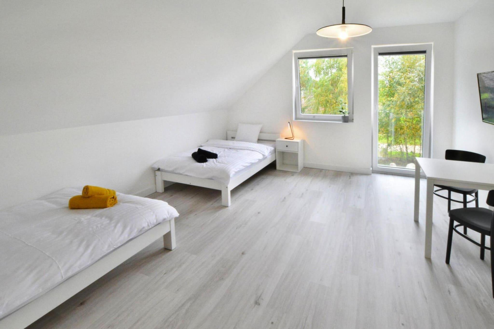 Beliggende i et indhegnet område, i et roligt område, 500 m fra havet, en moderne og komfortabelt indrettet ferievilla med egen sauna. Der er så mange som fem soveværelser (hver udstyret med et tv). Derudover to elegante badeværelser og et ekstra toilet. Husets stueetage er optaget af en kæmpe stue og et rummeligt og veludstyret køkken. Huset er udstyret med en 6-personers tør sauna til gæsternes brug (inkluderet i prisen for opholdet). Centralvarme. Foran huset er der en terrasse med havemøbler, liggestole og grilludstyr. Ejendommen byder gæster velkommen med kæledyr (mod et ekstra gebyr). Trådløst internet er tilgængeligt. Prisen for opholdet inkluderer: sauna, sengelinned, håndklæder, vandforbrug, parkering, barneseng og høj stol, slutrengøring. Du kan hurtigt nå den smukke strand ved havet til fods eller på cykel (kun 850 m på en stille sneboldtur). Mielenko er en lille bygd i udkanten af ??Mielno, en populær badeby. Der vil du finde mange rekreative faciliteter, restauranter og caféer. Der er også flere butikker og barer i nærheden af ??feriestedet. I nærheden af ??centrum er der den internationale cykelrute R-10, som giver dig mulighed for nemt og bekvemt at komme på cykel til andre nærliggende kystbyer: Mielno (et større feriested med mange attraktioner, restauranter, større butikker), Chlopy (en lille, historisk fiskerby), Lazy, Sarbinowo, Gaski. 3 km fra centrum er der søen Jamno med marina og udlejning af vandudstyr (pedalbåde, kajakker, robåde). Her er også fiskepladser. Dette er måske ikke et særligt attraktivt område for svømmeentusiaster, men det er et ideelt sted til vandsport (windsurfing, kitesurfing - udlejning og skole) og til fiskeri.