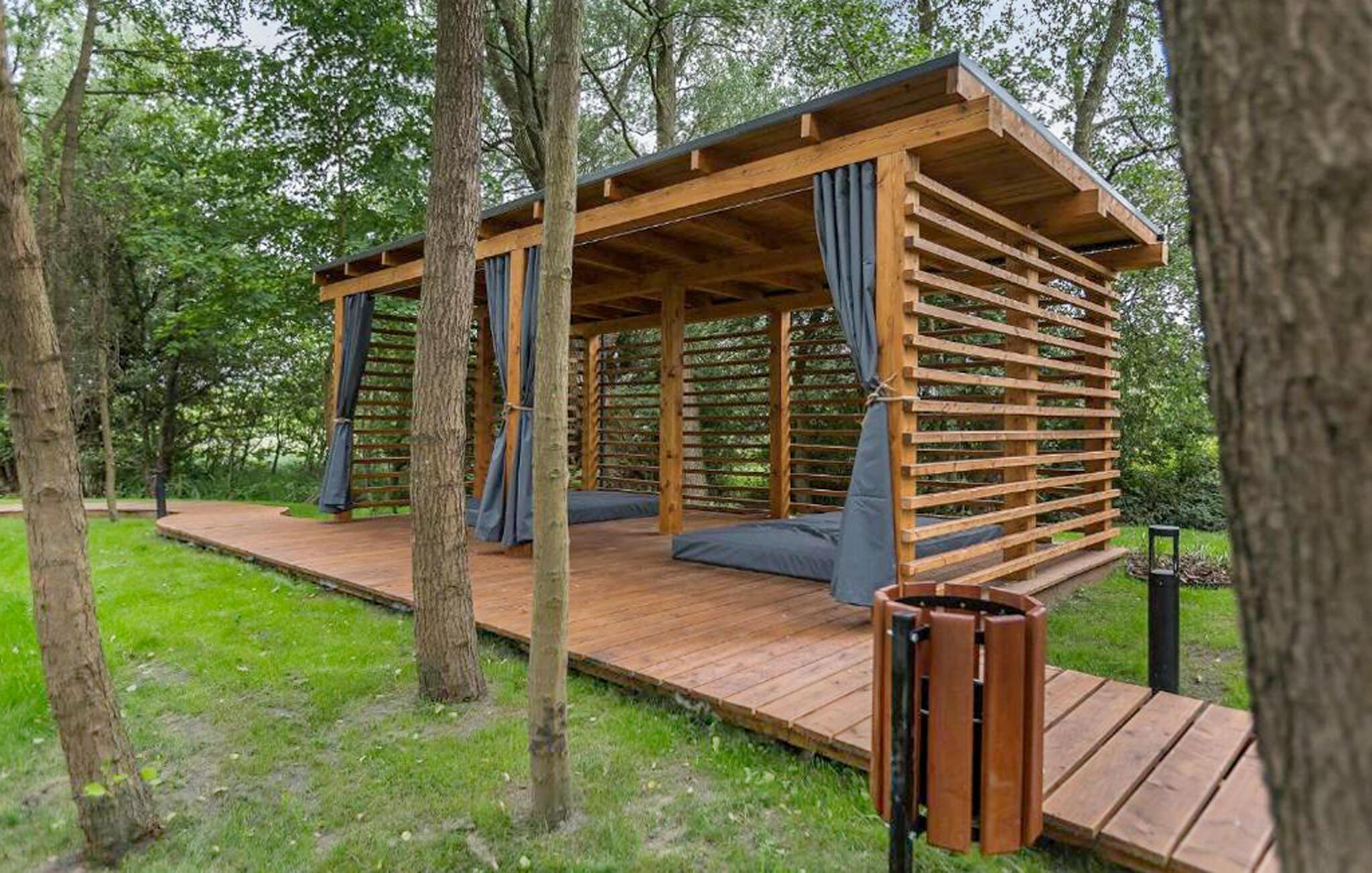 Udenfor kan I nyde et rummeligt, flot designet område. Lad jer udfordre til et spil skak ved et unikt naturstensbord eller slap af på den møblerede terrasse. Svøm i den private udendørs pool eller slap af i det udendørs spabad. En fælles sauna fuldender wellness-tilbuddet. Om aftenen kan I mødes ved det idylliske bålplads med rustikke træstammepladser til musik og samvær.
