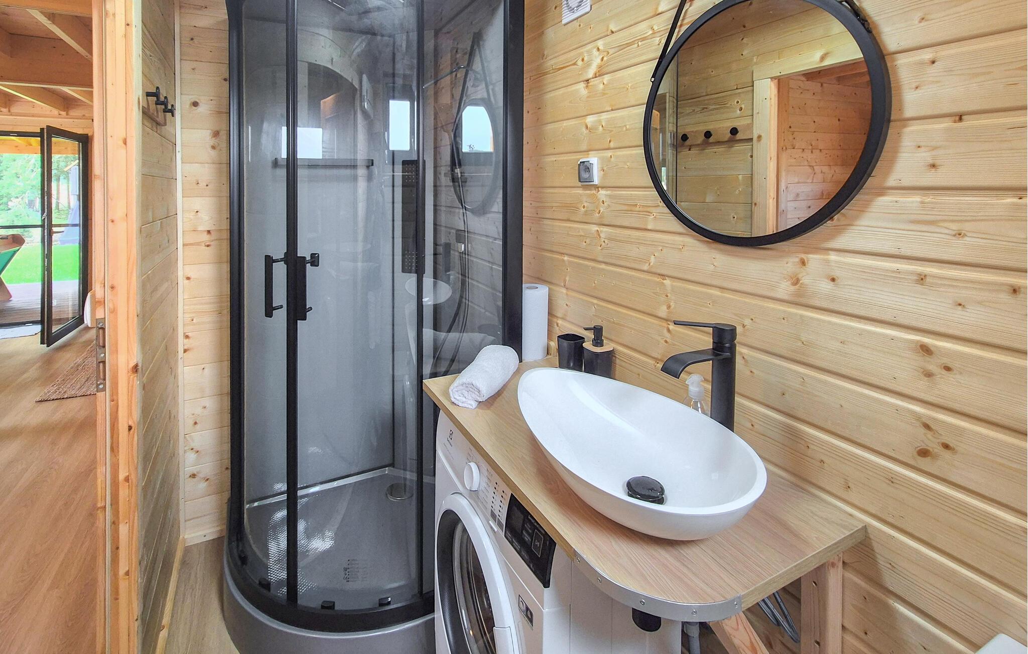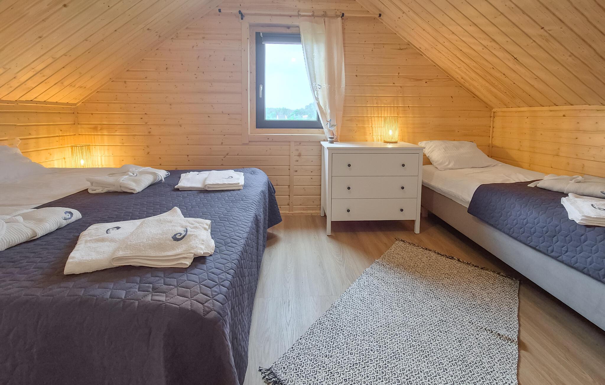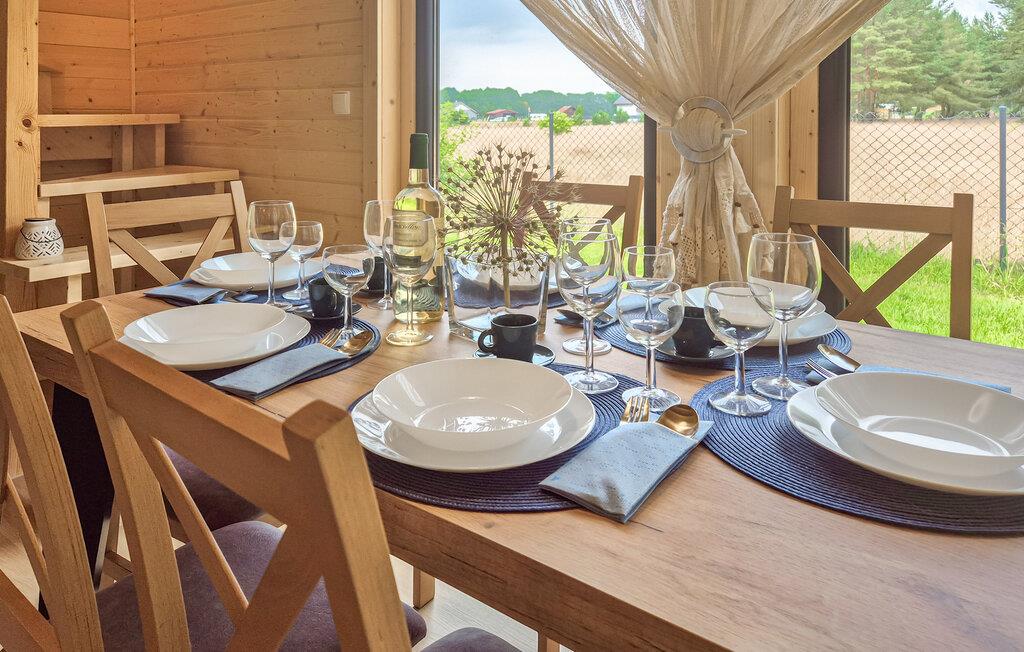 Velkommen til en ferie i dette feriehus i Nowe Warpno, som er ideelt for familier eller grupper, der søger afslapning og en livlig ferie i lige grad. Nyd roen i den omkringliggende natur, mens I slapper af på den hyggelige veranda. Find jer godt til rette i den komfortable sofa eller dyster med venner eller familie ved bordfodboldbordet. Sjov og underholdning er garanteret her. Der er mange spilmuligheder som petanque eller badminton. Og der er en række forskellige legeredskaber til rådighed for de små feriegæster. Alle kan slappe af i den beroligende tøndesauna.