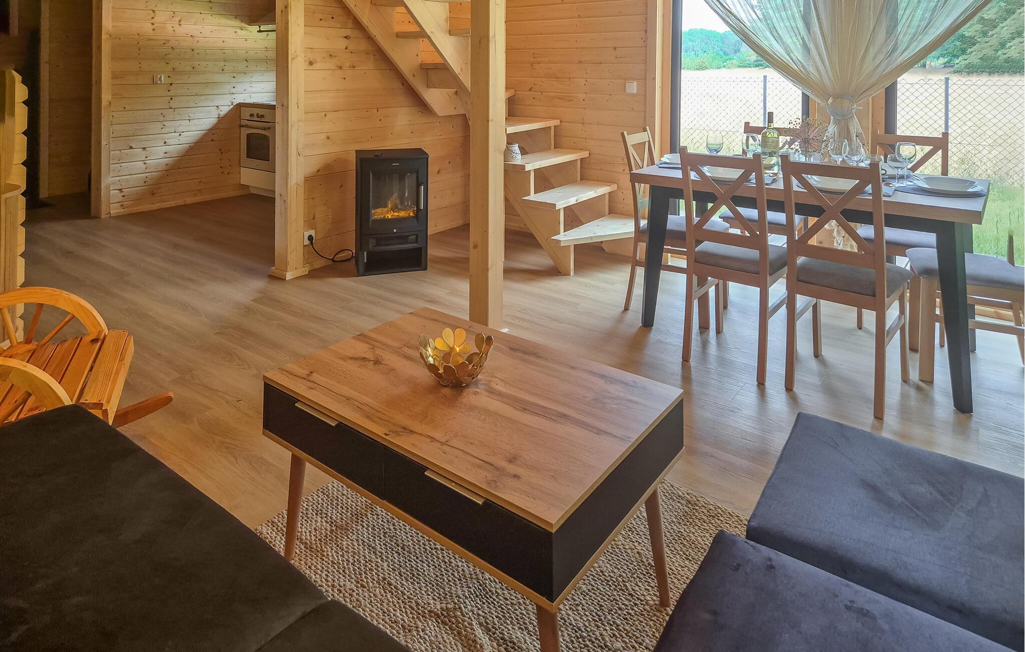 Inde i ferieboligen finder I en rummelig opholdsstue med en varm og indbydende atmosfære. Det åbne køkken er moderne og giver jer mulighed for at tilberede lækre måltider sammen. Sæt jer ved det smukke spisebord i træ og nyd jeres retter i en hyggelig atmosfære.