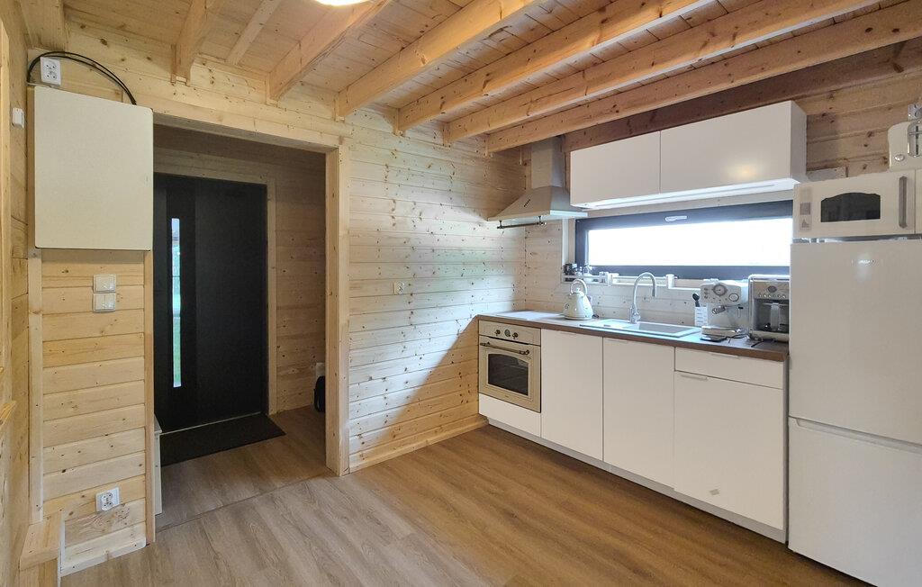 Efter en aktiv dag udendørs er tøndesaunaen det ideelle sted at slappe af i krop og sind. Inde i ferieboligen finder I en rummelig opholdsstue, der formidler en følelse af tryghed med sine varme træmøbler. Det fuldt udstyrede køkken mangler ikke noget. Tilbered jeres yndlingsretter sammen og nyd dem ved spisebordet med udsigt over haven.