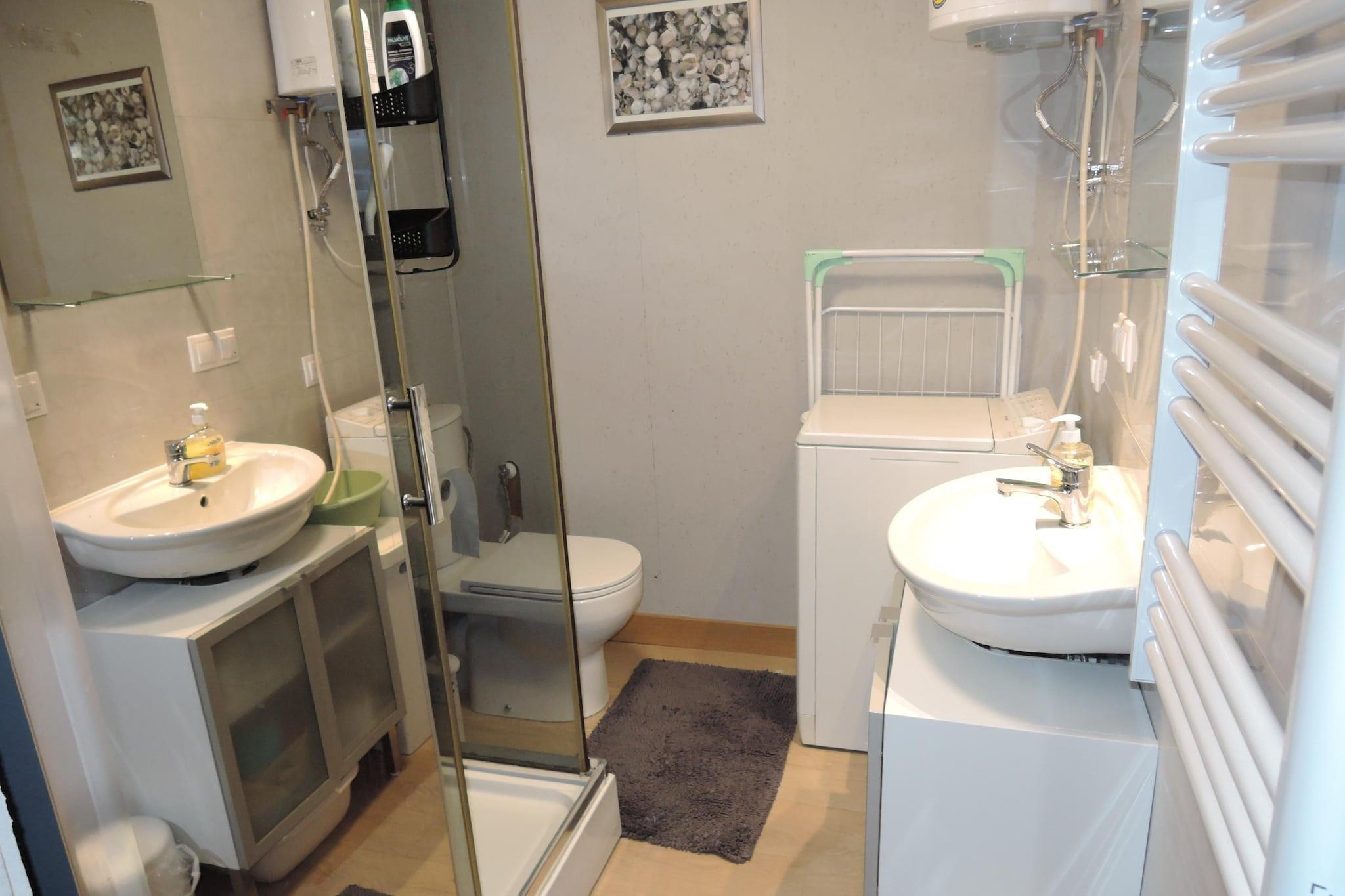 Stueetage: (åbent køkken(elkedel, cooker, komfur(Komfur med to kogeplader, elektrisk), espressomaskine, mikrobølgeovn, opvaskemaskine , køle-fryseskab), Stue/soveværelse(dobbeltsovesofa, Fjernsyn, spisebord, pejs), soveværelse(enkeltseng, enkeltseng), badeværelse(bruser, håndvask, toilet, vaskemaskine)) terrasse, have(privat), havemøbler, grill, parkering