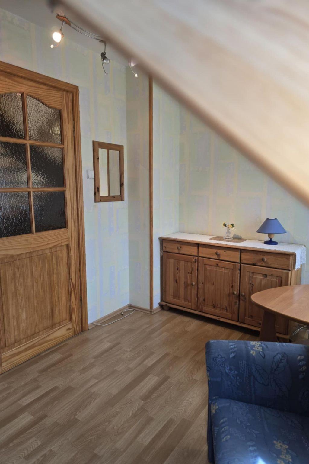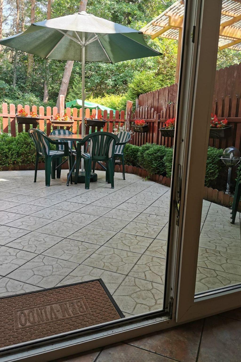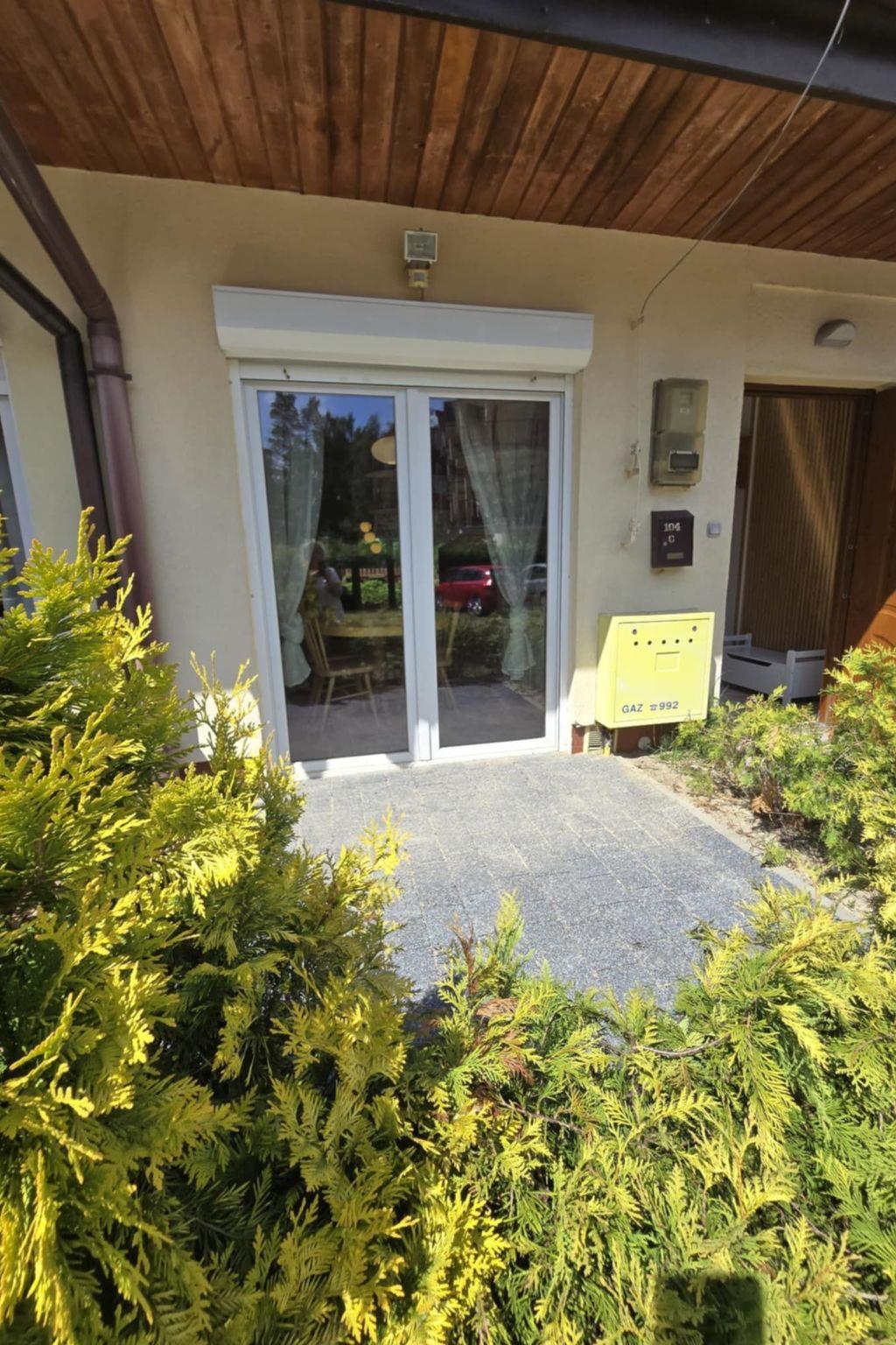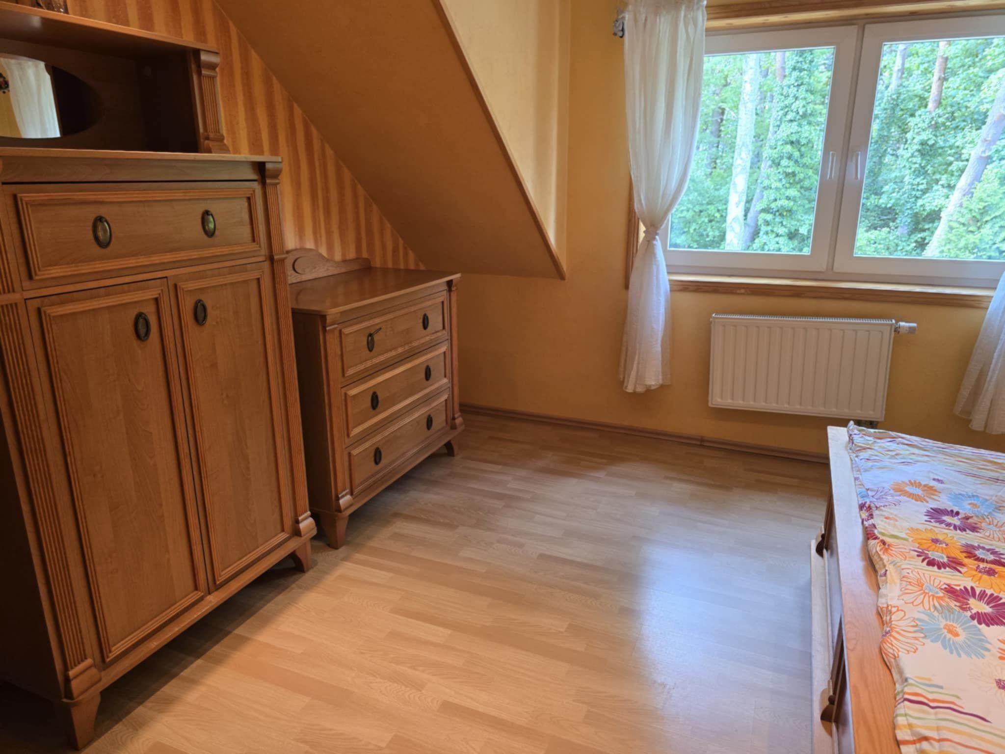 The house is distributed on 3 levels: ground floor open from a large, balcony window in the kitchen to a large panoramic window with access to the terrace in the living room about 55m2 - dining room, kitchen (fully equipped: cooker - 4 burners, electric hot plate, oven, fridge, dishwasher, toaster, electric kettle, coffee maker, pots, pans, cutlery, tableware, dessertware, living room is a wide sofa, 2 armchairs, bench, chest of drawers, TV ( programs only in Polish, no German language channels! ), CD, books, fireplace, terrace - garden furniture - table, 8 chairs, umbrella, 4 deck chairs with table, grill. Separate corridor with entrance door to the house and newly built toilet, all completely renovated. The entire downstairs area of the house has been completely renovated, walls and ceilings repainted, new tiles in the kitchen, new toilet, all the lights on the ground floor replaced, electrical wiring on the ground floor replaced, new tiles on the terrace on the estate side. The first floor consists of 2 bedrooms: master bedroom with a 220 x 220 bed with bedside tables, wardrobe and chest of drawers, children's room with a bunk bed for children, 2-seater sofa, armchair, bench with rounded child-safe corners, chest of drawers and a bathroom with bathtub, washer-dryer, washbasin and dirty linen basket.