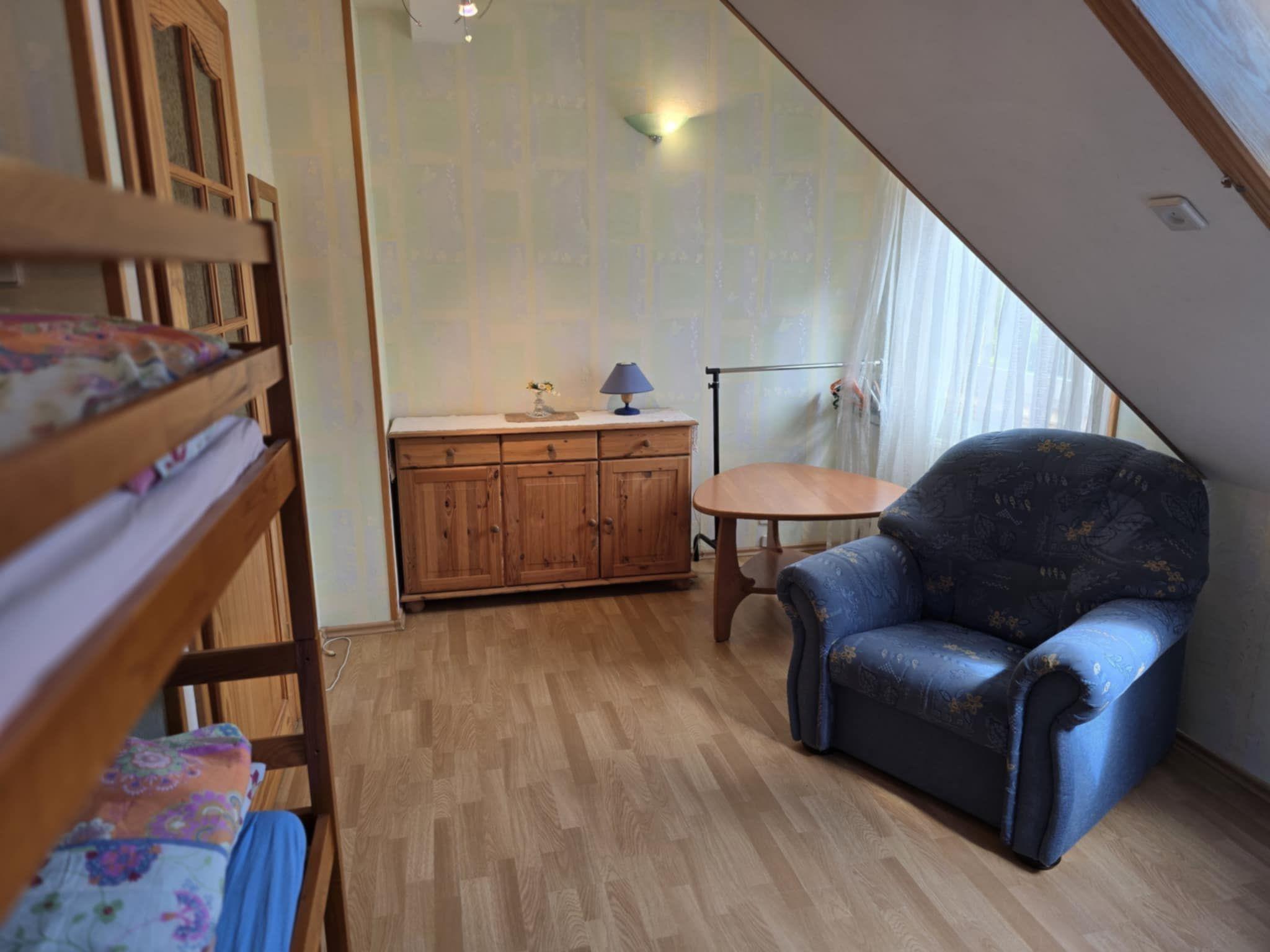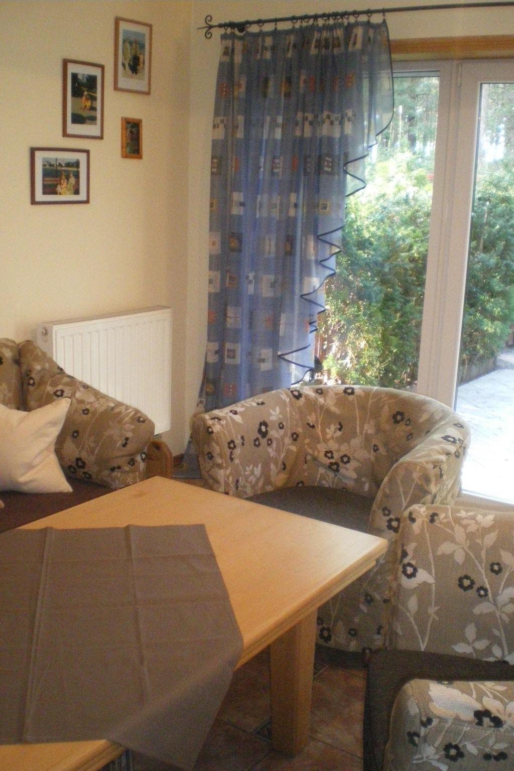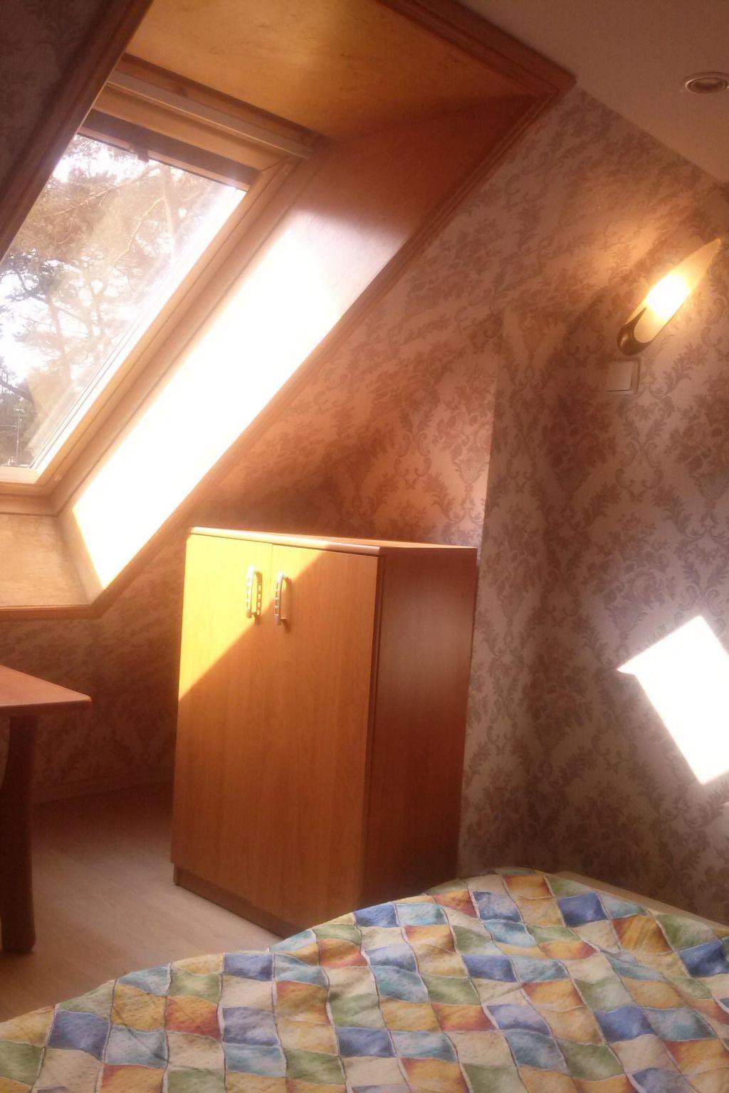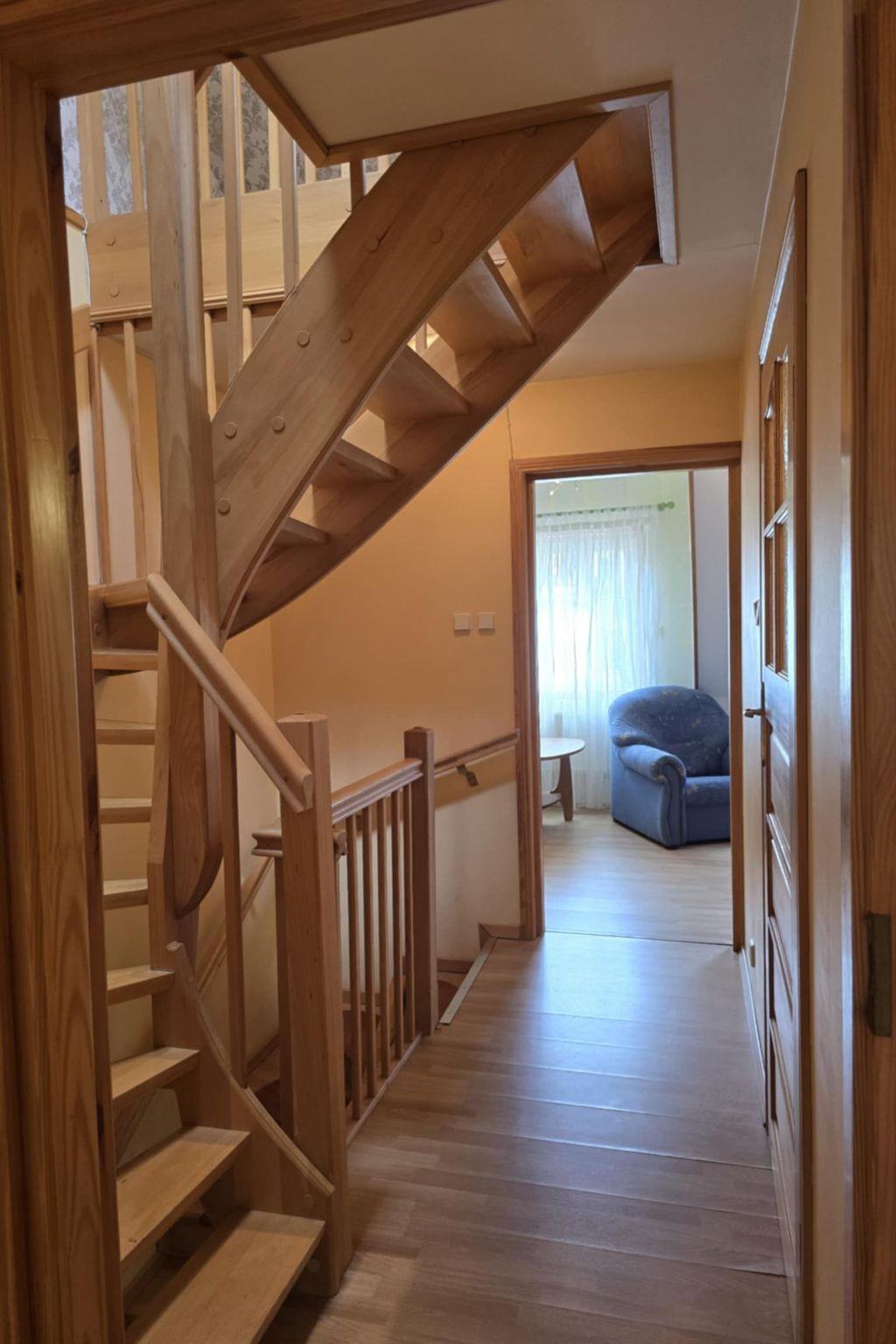 The house is distributed on 3 levels: ground floor open from a large, balcony window in the kitchen to a large panoramic window with access to the terrace in the living room about 55m2 - dining room, kitchen (fully equipped: cooker - 4 burners, electric hot plate, oven, fridge, dishwasher, toaster, electric kettle, coffee maker, pots, pans, cutlery, tableware, dessertware, living room is a wide sofa, 2 armchairs, bench, chest of drawers, TV ( programs only in Polish, no German language channels! ), CD, books, fireplace, terrace - garden furniture - table, 8 chairs, umbrella, 4 deck chairs with table, grill. Separate corridor with entrance door to the house and newly built toilet, all completely renovated. The entire downstairs area of the house has been completely renovated, walls and ceilings repainted, new tiles in the kitchen, new toilet, all the lights on the ground floor replaced, electrical wiring on the ground floor replaced, new tiles on the terrace on the estate side. The first floor consists of 2 bedrooms: master bedroom with a 220 x 220 bed with bedside tables, wardrobe and chest of drawers, children's room with a bunk bed for children, 2-seater sofa, armchair, bench with rounded child-safe corners, chest of drawers and a bathroom with bathtub, washer-dryer, washbasin and dirty linen basket.