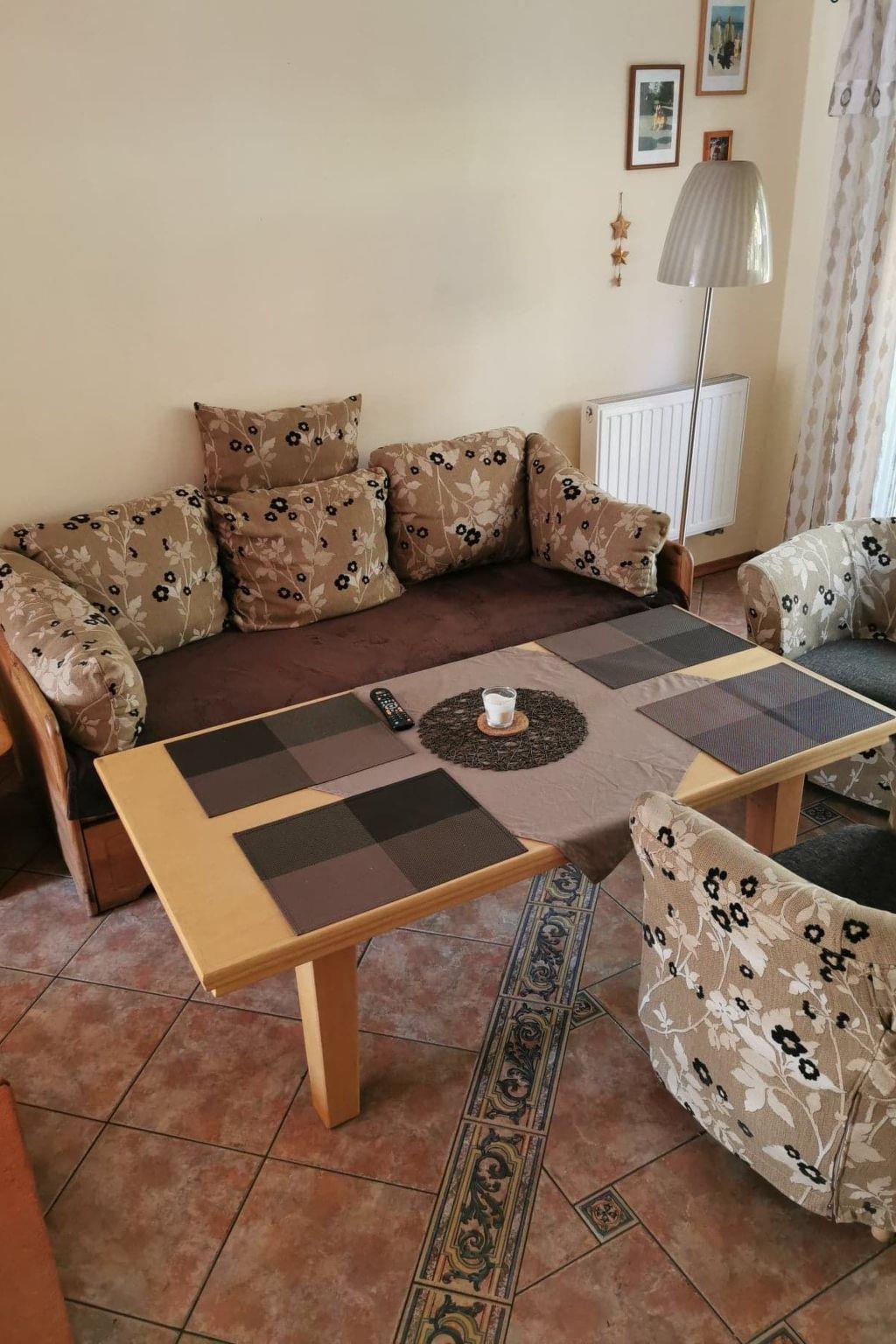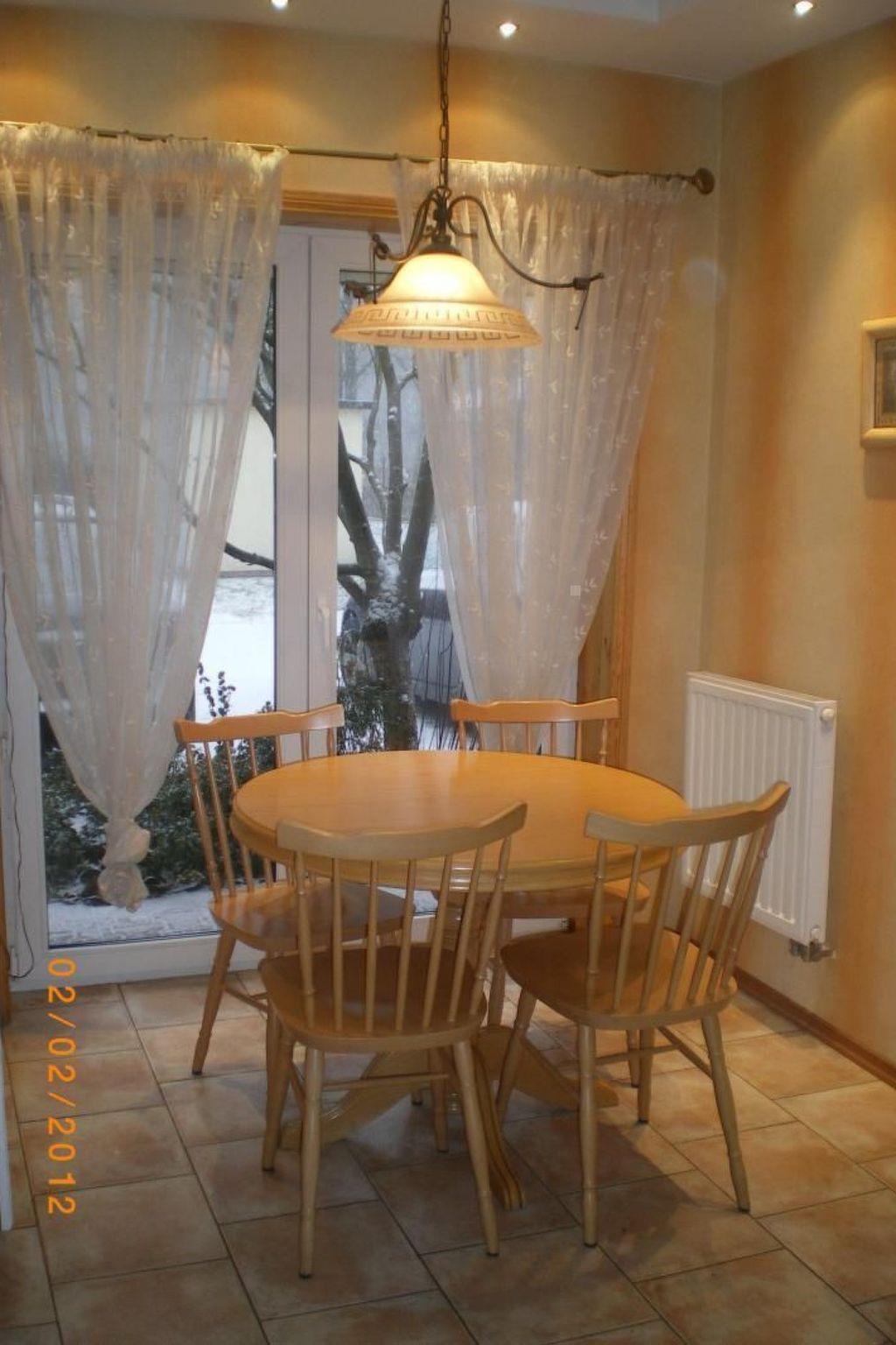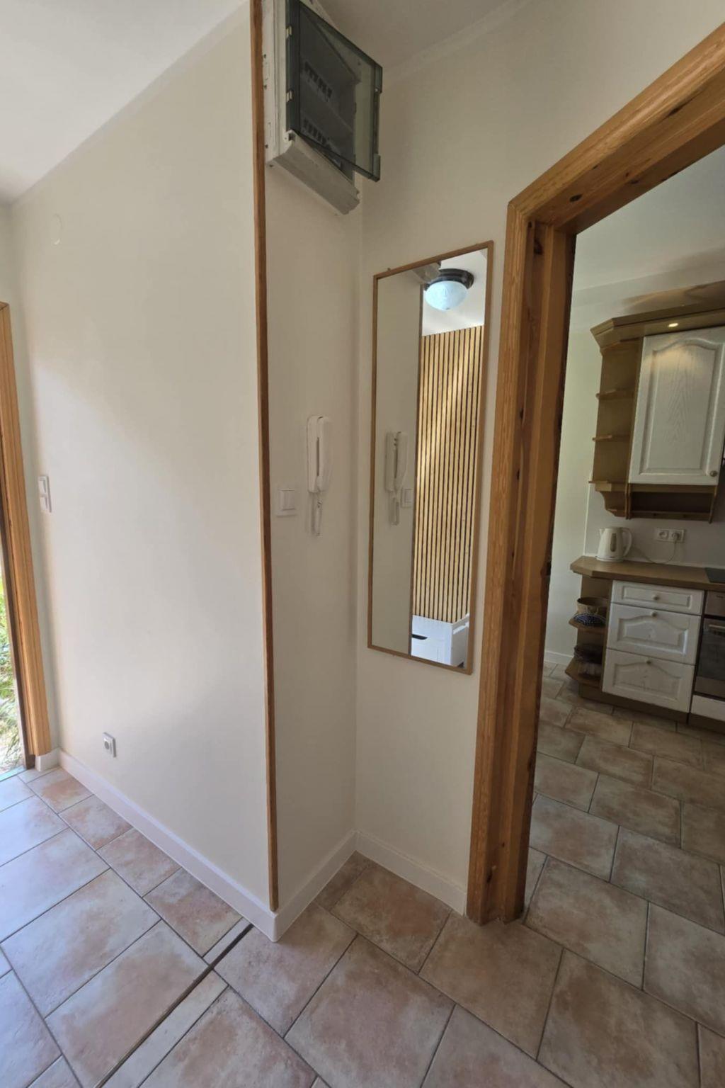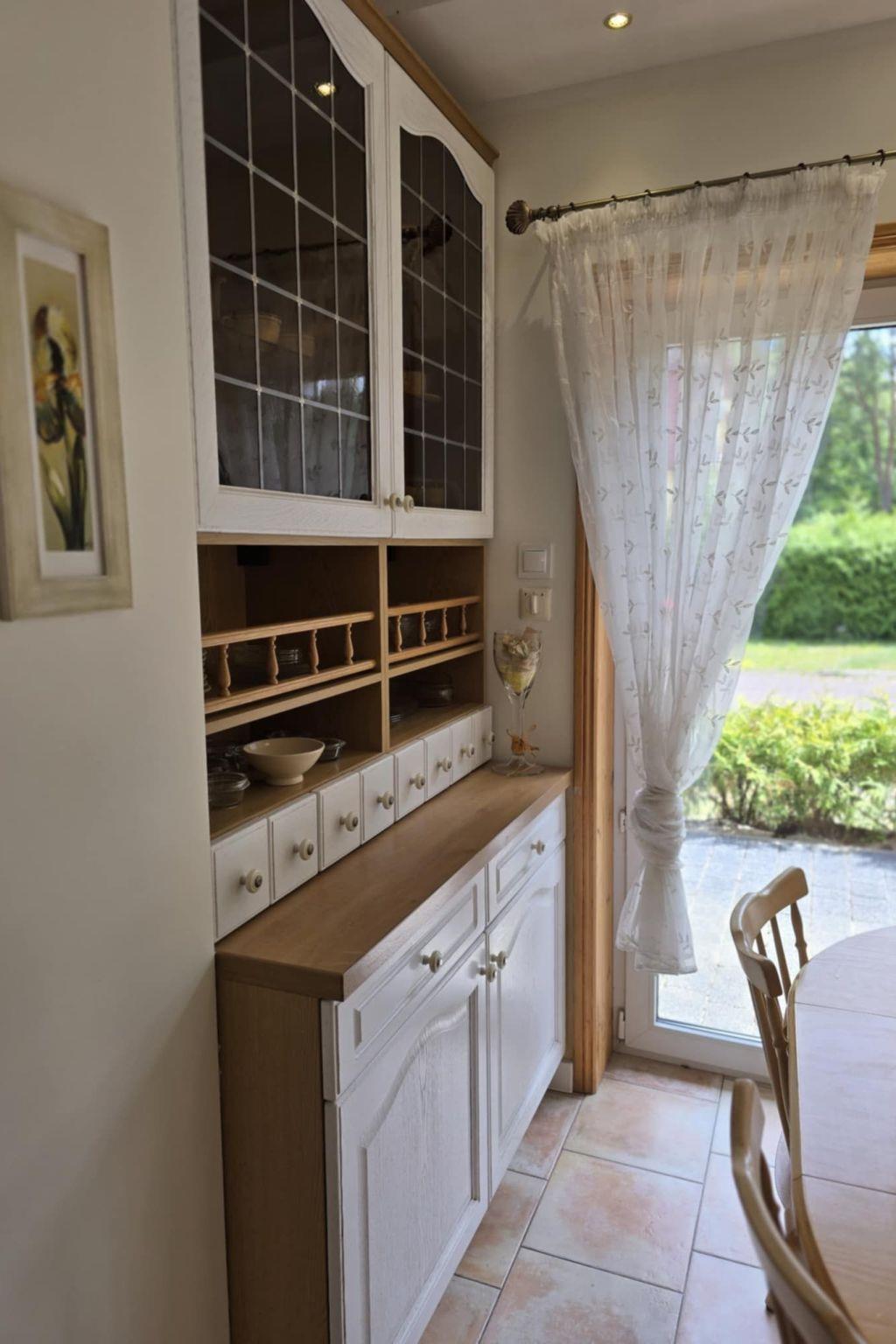 The house is distributed on 3 levels: ground floor open from a large, balcony window in the kitchen to a large panoramic window with access to the terrace in the living room about 55m2 - dining room, kitchen (fully equipped: cooker - 4 burners, electric hot plate, oven, fridge, dishwasher, toaster, electric kettle, coffee maker, pots, pans, cutlery, tableware, dessertware, living room is a wide sofa, 2 armchairs, bench, chest of drawers, TV ( programs only in Polish, no German language channels! ), CD, books, fireplace, terrace - garden furniture - table, 8 chairs, umbrella, 4 deck chairs with table, grill. Separate corridor with entrance door to the house and newly built toilet, all completely renovated. The entire downstairs area of the house has been completely renovated, walls and ceilings repainted, new tiles in the kitchen, new toilet, all the lights on the ground floor replaced, electrical wiring on the ground floor replaced, new tiles on the terrace on the estate side. The first floor consists of 2 bedrooms: master bedroom with a 220 x 220 bed with bedside tables, wardrobe and chest of drawers, children's room with a bunk bed for children, 2-seater sofa, armchair, bench with rounded child-safe corners, chest of drawers and a bathroom with bathtub, washer-dryer, washbasin and dirty linen basket.