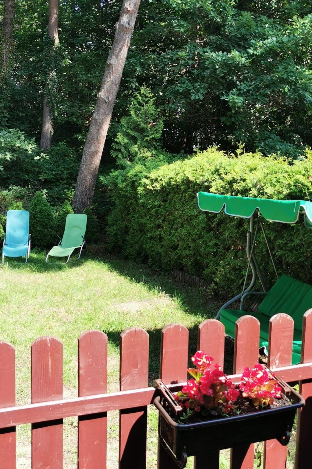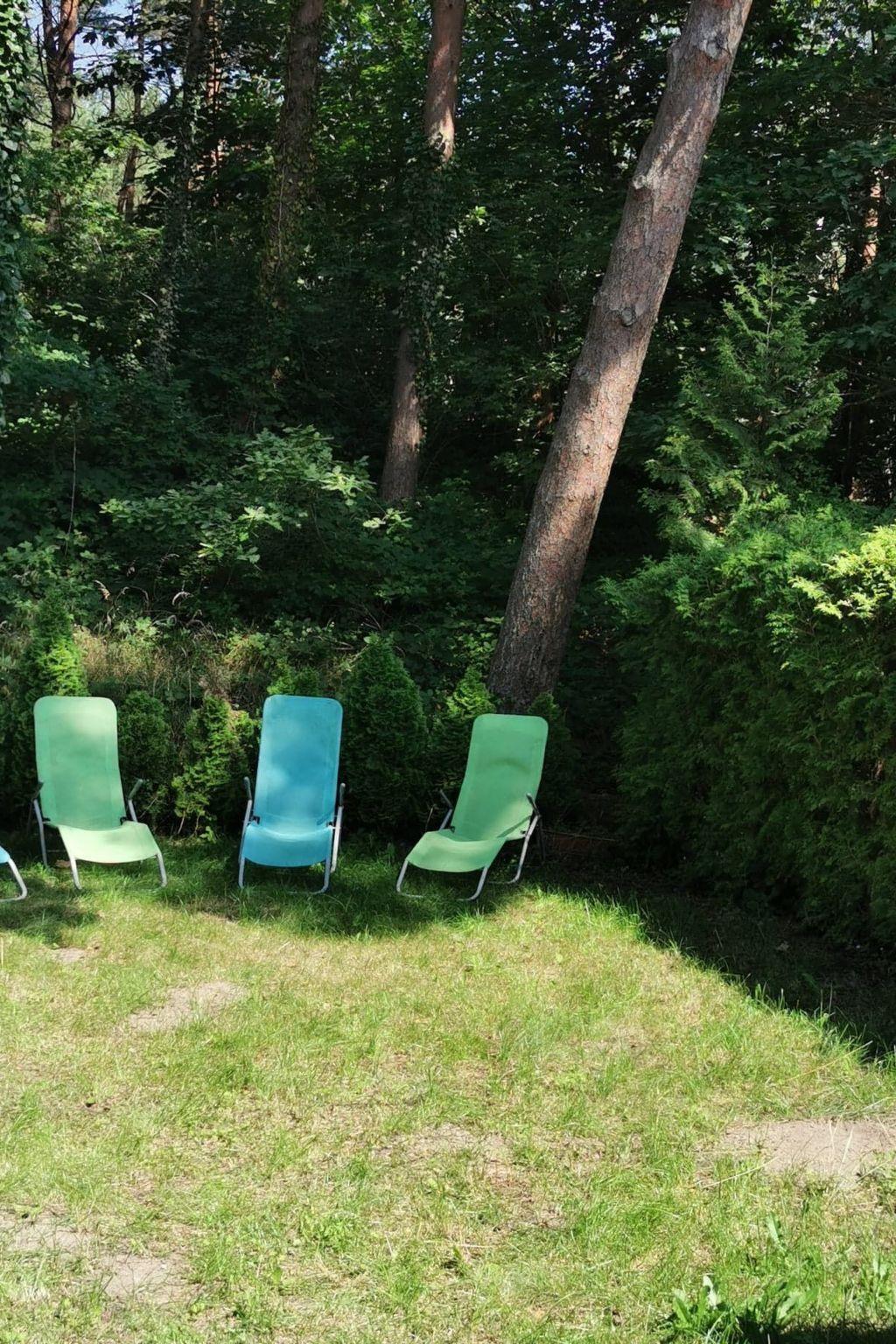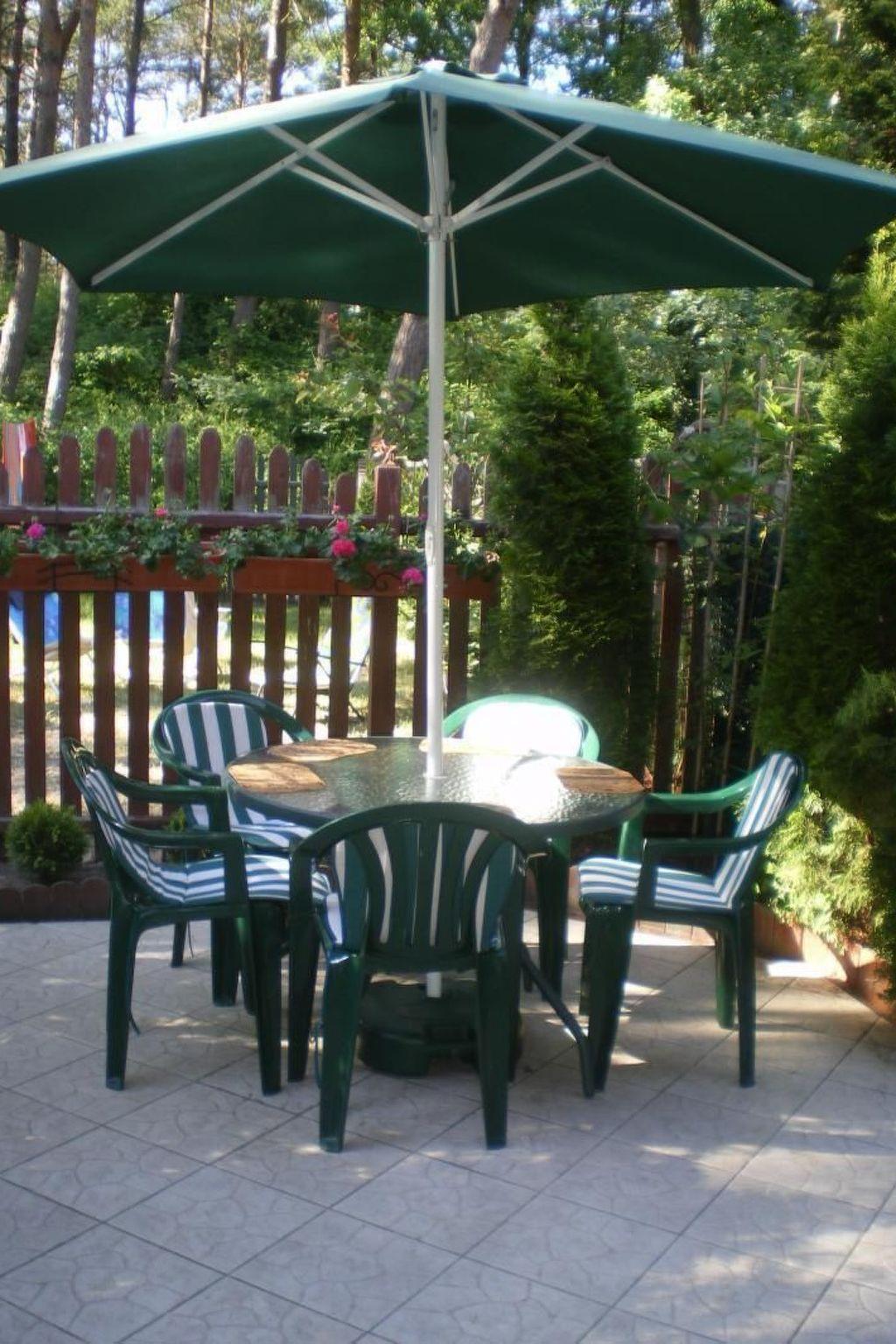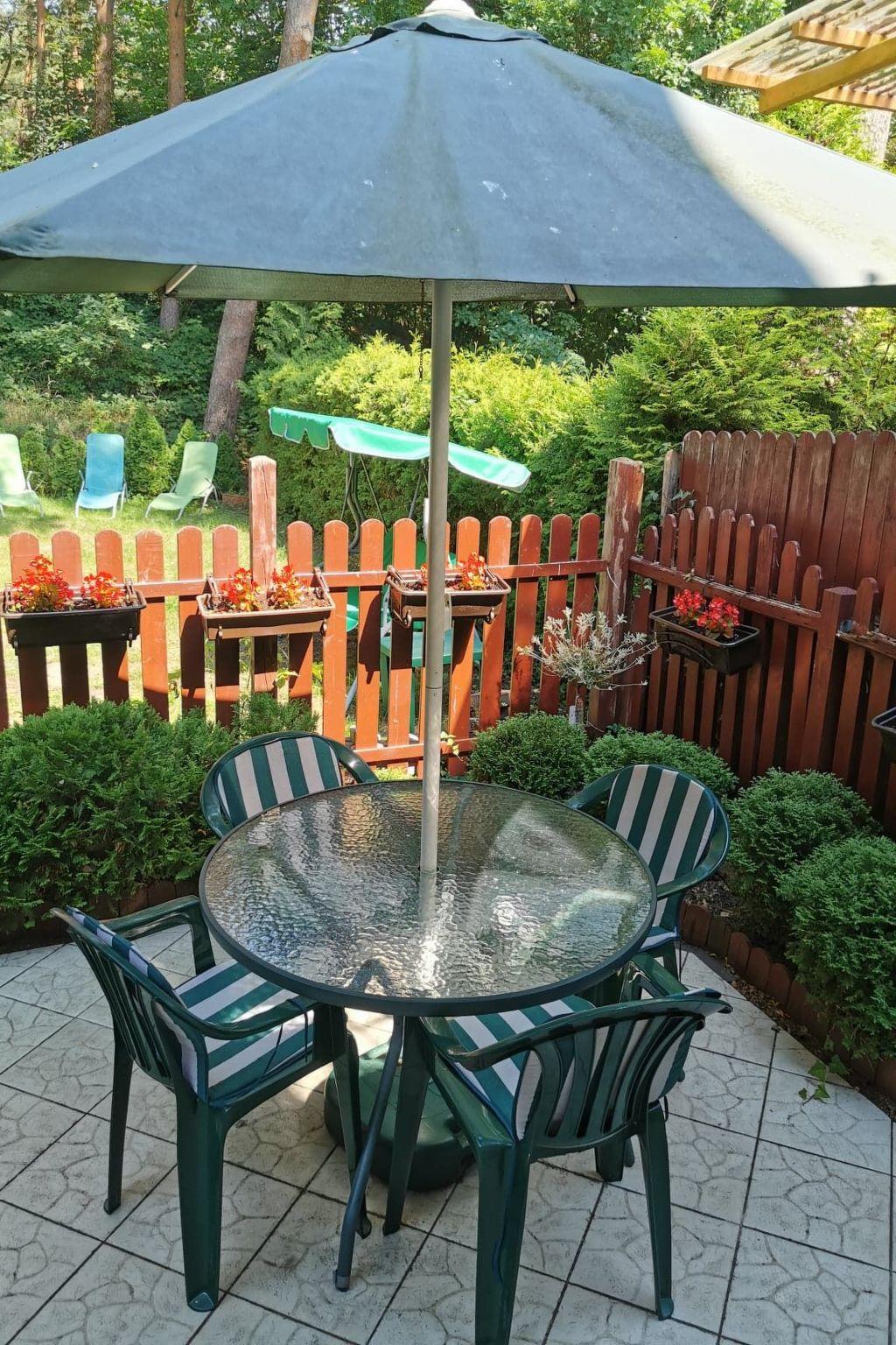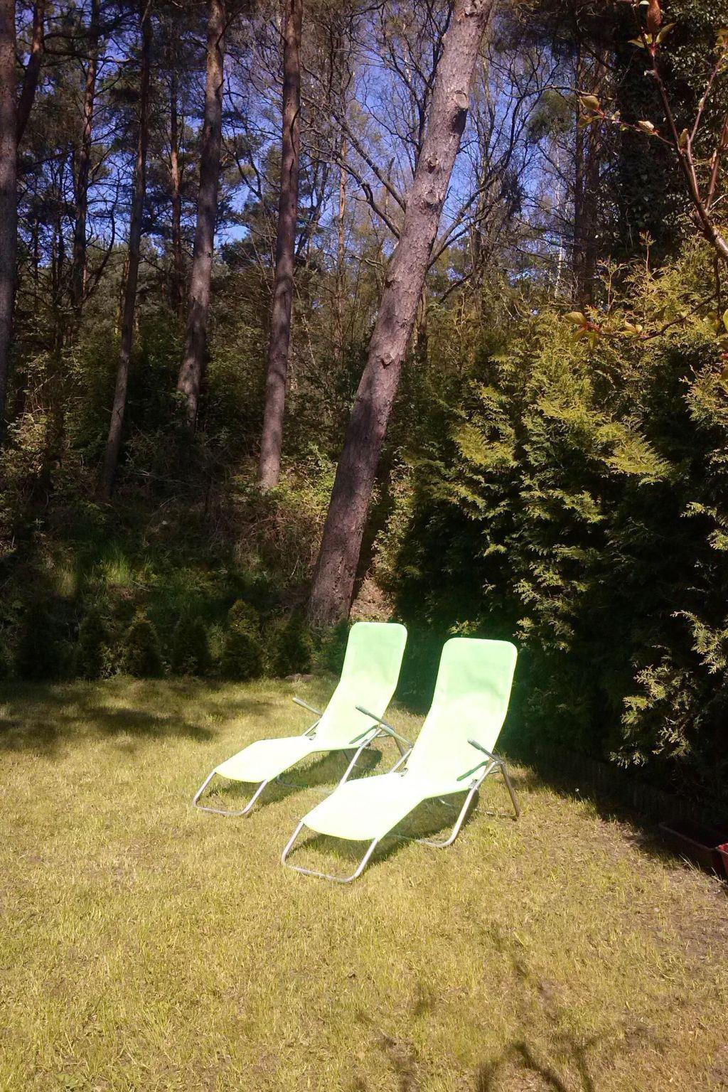 From the living room you exit to the terrace, large, fenced, with a table with 6 chairs, portable barbecue. From the terrace there is access to the garden, planted along the contour with conifers - unfenced. Behind the garden there is a forest separating the property from the dunes on the beach. In the garden, 6 deckchairs and a small coffee table. On the estate side, a tiny terrace in front of the house, planted with conifers, a parking space for a car, a rubbish bin. Rubbish is collected twice a week during the season on Wednesday and Saturday mornings, so the bin must be dragged in front of the resort gate in the evening of the previous day and taken away empty the following day. A rack for separate rubbish is located in the garden. It is imperative that you separate your rubbish thoroughly.