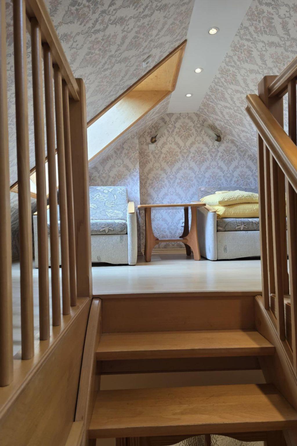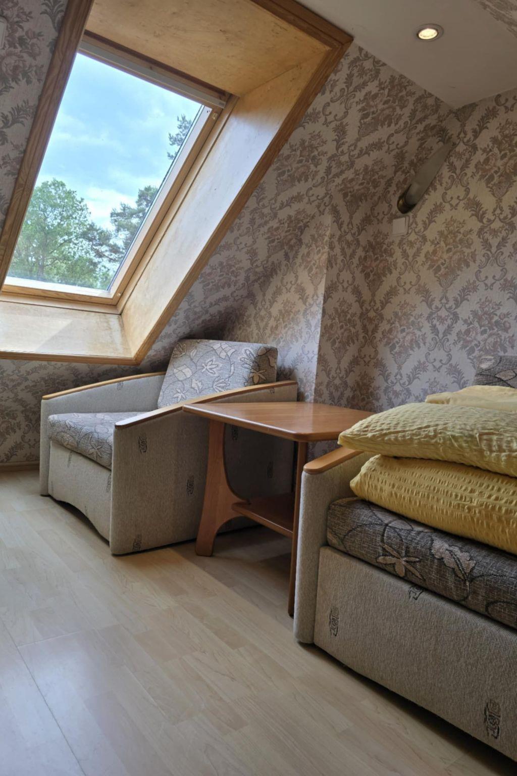 Attic bedroom with a 2-seater sofa bed (2-seater, but narrow), fold-out armchair, bench, chest of drawers and space for suitcases or other luggage - a small, open attic, just for sleeping or reading a book in an armchair.