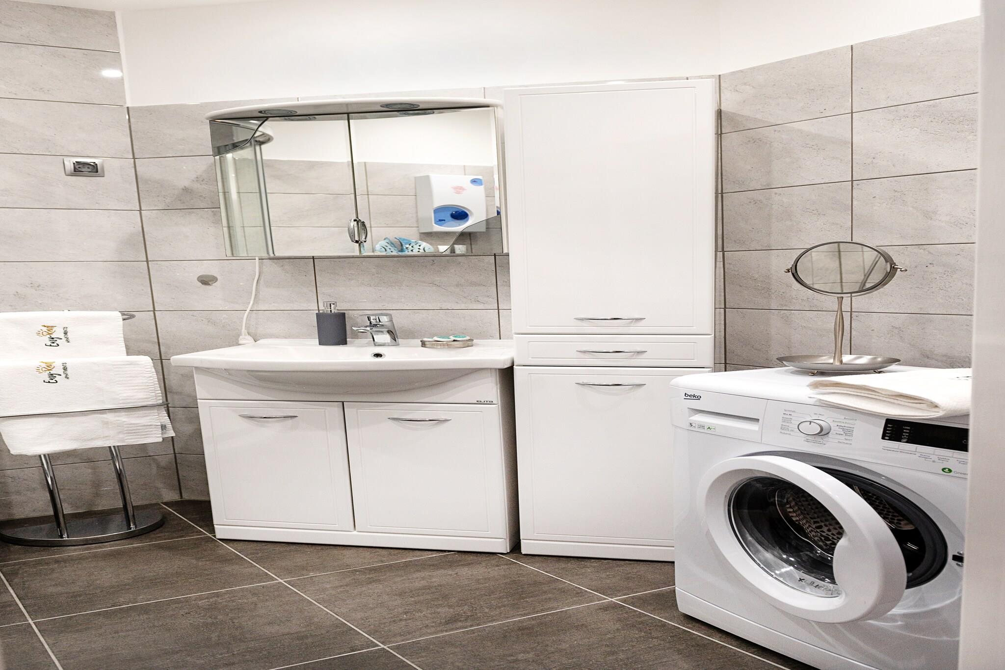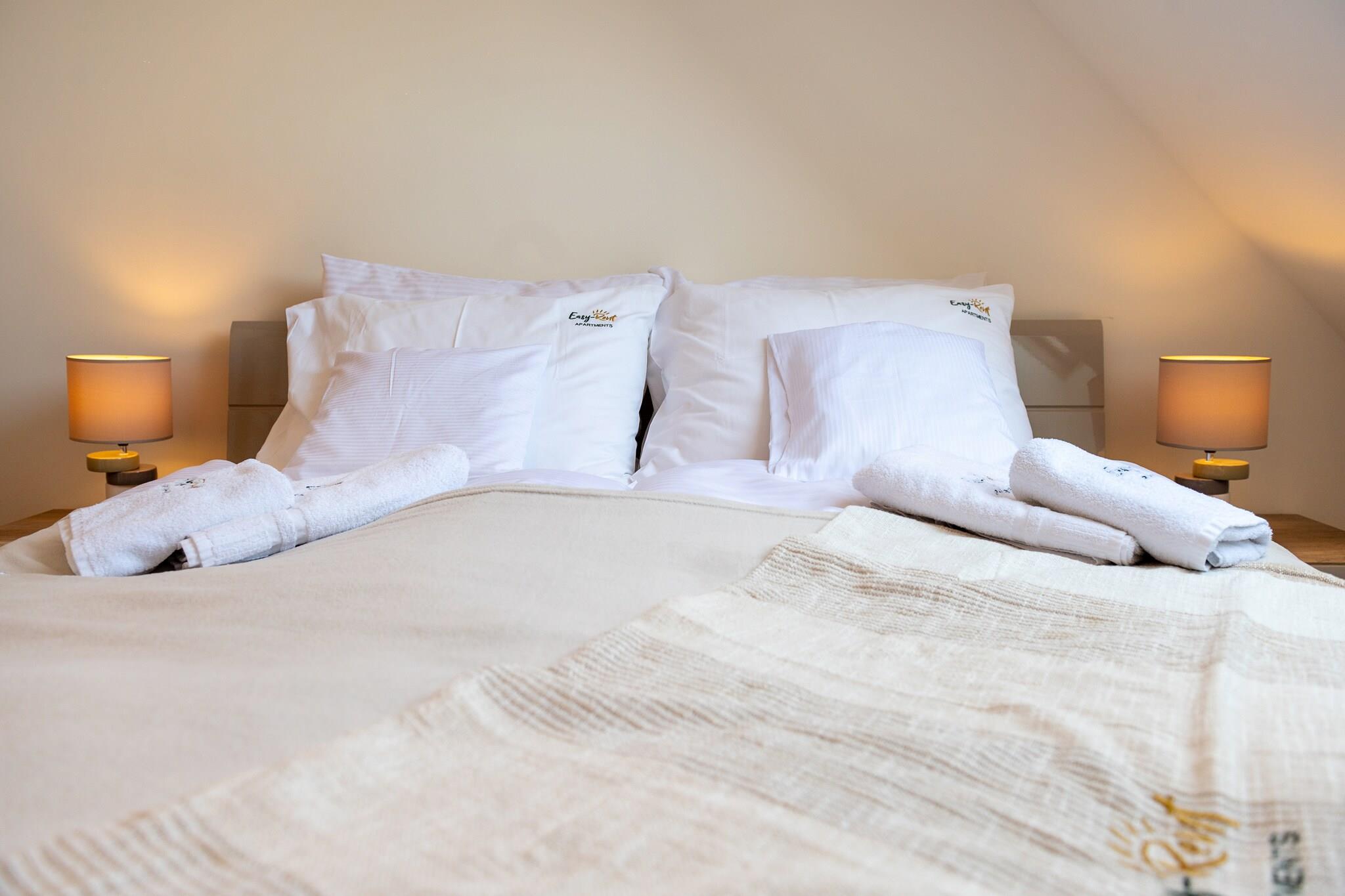 På 3. etage: (åbent køkken(spisebord, kogeplade, elkedel, kaffemaskine, mikrobølgeovn, opvaskemaskine , køle-fryseskab), stue / spisestue(dobbeltsovesofa, Fjernsyn(fladskærm, Tyske TV-kanaler)), badeværelse(bruser, håndvask, toilet, vaskemaskine, føntørrer)) På 4. etage: (soveværelse(enkeltseng, enkeltseng, dobbeltseng), soveværelse(dobbeltseng)) Internetadgang, Parkering, tremmeseng, varme(central), terrasse, havemøbler, solstole, barnestol