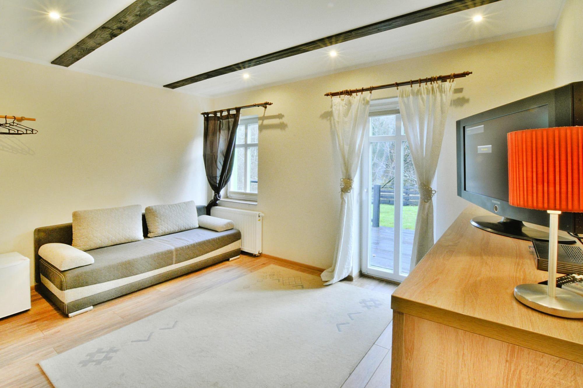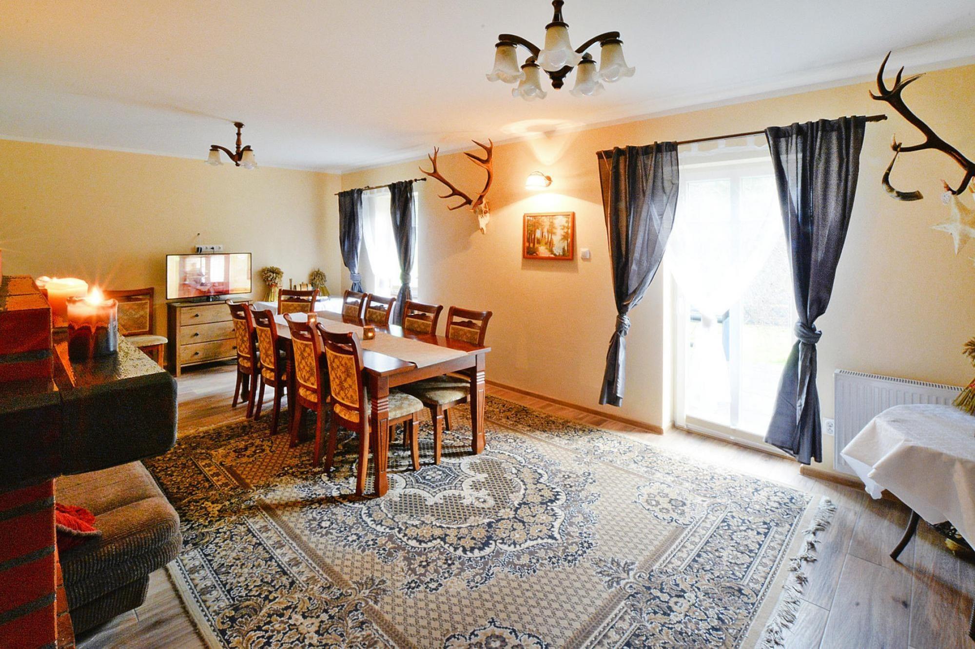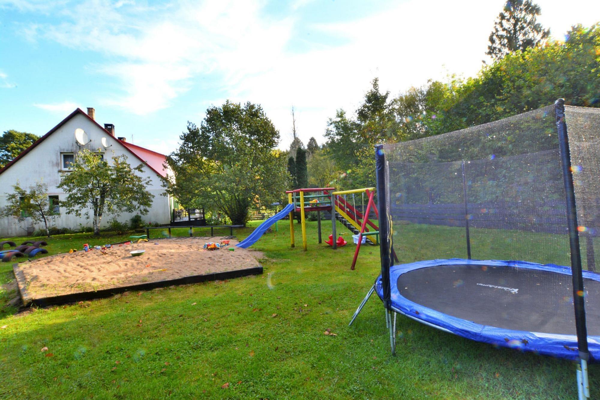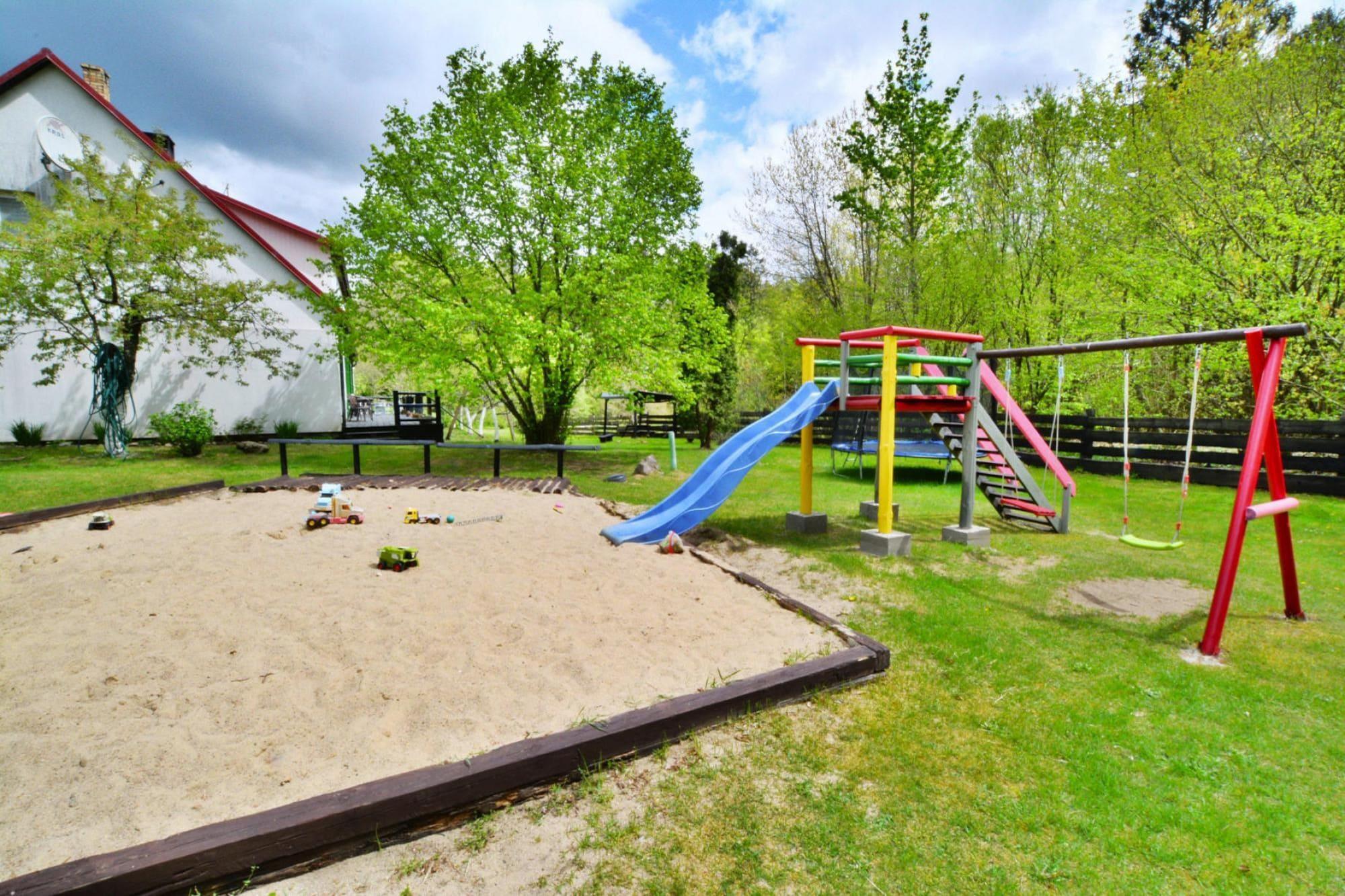 Midt i skoven, i en oase af fred og ro, ligger et komfortabelt feriehus i en restaureret skovfogedhytte. Gæsterne råder over hele 10.000 m2 privat areal - en ideel ramme for alle former for familiespil og underholdning. Feriehuset er i 2 etager. I stueetagen er der en rummelig stue med stort bord, pejs og TV. Fra stuen er der direkte udgang til terrassen med udsigt over den private dam. I stueetagen er der 3 separate soveværelser, 4 badeværelser (3 med bruser, 1 med badekar) og et veludstyret køkken (inklusive komfur, ovn, kaffemaskine, mikroovn, opvaskemaskine). På første sal er der yderligere 5 soveværelser og 3 badeværelser (2 med badekar, 1 med bruser). Der er også et ekstra tekøkken ovenpå. Centralvarme. Huset er udstyret med vaskemaskine. Trådløst internet er tilgængeligt. I det velholdte område kan gæsterne nyde en sommer swimmingpool (vandet er ikke opvarmet, åbent fra 15. juni til 15. september), en parkeringsplads, en legeplads, haven shelters, bålplads og grilludstyr. Der er også en charmerende dam med en romantisk bro. Ejeren af ??anlægget tilbyder lokale produkter, som hun personligt tilbereder: hjemmebagt brød, syltetøj og andre konserves. Prisen for opholdet inkluderer: sengelinned, håndklæder, el- og vandforbrug, ophold med hund (max 1), slutrengøring, parkering, internet. Attraktioner i området: Denne placering er ikke kun hvile og afslapning, men også svampeplukning, skovvandring, cykling og bærplukning. Den fred og ro, der hersker her, giver dig mulighed for at bryde væk fra hverdagen, fra livets høje tempo og nyde fuglesangen, frøernes kvækken og frem for alt ren luft. Der er cirka 20 km til den store provinsby (Koszalin), hvor der er talrige restauranter, caféer, butikker og store indkøbscentre. Der er også et stort, attraktivt vandland i Koszalin. Den nærmeste strand ved havet er i Lazy (også Mielno og Dabki i nærheden).