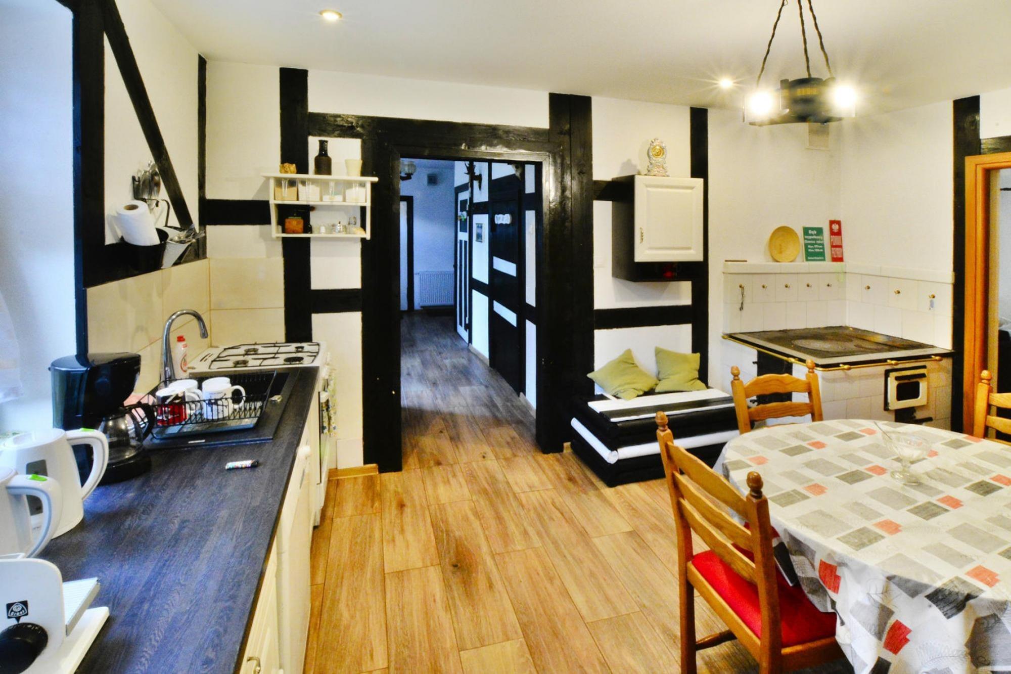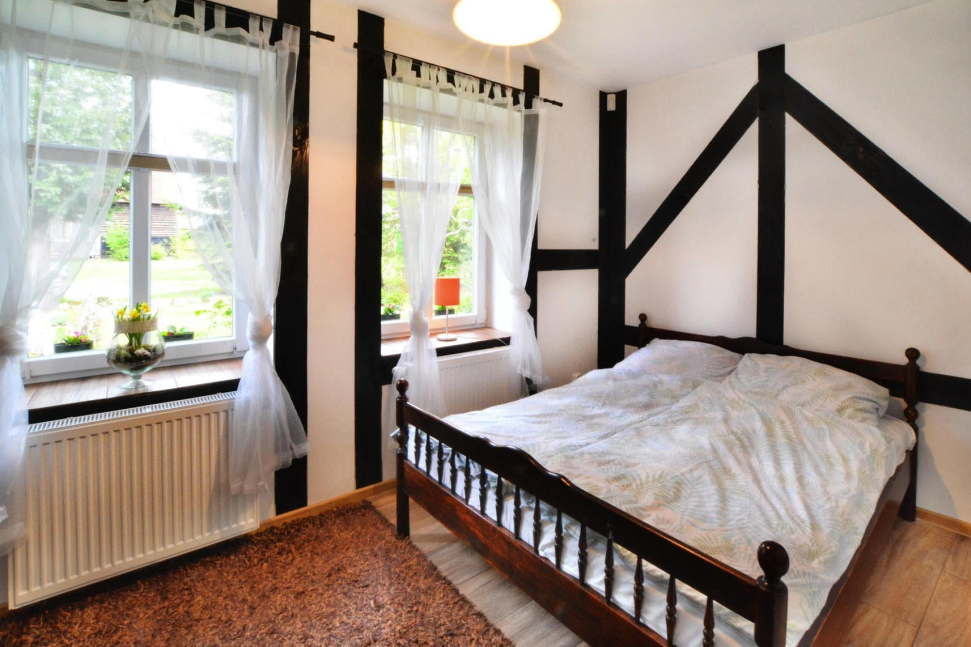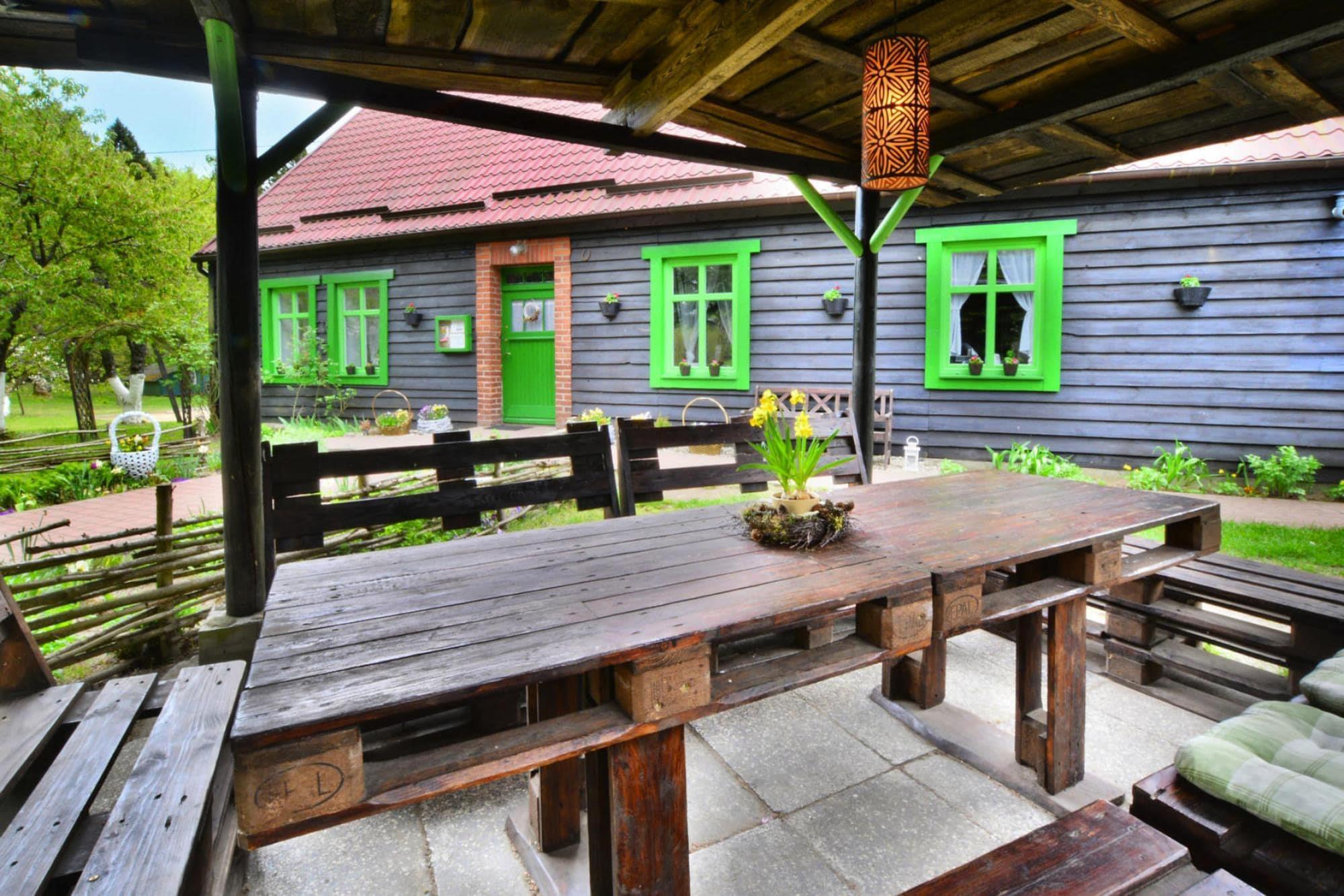 Midt i skoven, i en oase af fred og ro, ligger et komfortabelt feriehus i en restaureret skovfogedhytte. Gæsterne råder over hele 10.000 m2 privat areal - en ideel ramme for alle former for familiespil og underholdning. Feriehuset er i 2 etager. I stueetagen er der en rummelig stue med stort bord, pejs og TV. Fra stuen er der direkte udgang til terrassen med udsigt over den private dam. I stueetagen er der 3 separate soveværelser, 4 badeværelser (3 med bruser, 1 med badekar) og et veludstyret køkken (inklusive komfur, ovn, kaffemaskine, mikroovn, opvaskemaskine). På første sal er der yderligere 5 soveværelser og 3 badeværelser (2 med badekar, 1 med bruser). Der er også et ekstra tekøkken ovenpå. Centralvarme. Huset er udstyret med vaskemaskine. Trådløst internet er tilgængeligt. I det velholdte område kan gæsterne nyde en sommer swimmingpool (vandet er ikke opvarmet, åbent fra 15. juni til 15. september), en parkeringsplads, en legeplads, haven shelters, bålplads og grilludstyr. Der er også en charmerende dam med en romantisk bro. Ejeren af ??anlægget tilbyder lokale produkter, som hun personligt tilbereder: hjemmebagt brød, syltetøj og andre konserves. Prisen for opholdet inkluderer: sengelinned, håndklæder, el- og vandforbrug, ophold med hund (max 1), slutrengøring, parkering, internet. Attraktioner i området: Denne placering er ikke kun hvile og afslapning, men også svampeplukning, skovvandring, cykling og bærplukning. Den fred og ro, der hersker her, giver dig mulighed for at bryde væk fra hverdagen, fra livets høje tempo og nyde fuglesangen, frøernes kvækken og frem for alt ren luft. Der er cirka 20 km til den store provinsby (Koszalin), hvor der er talrige restauranter, caféer, butikker og store indkøbscentre. Der er også et stort, attraktivt vandland i Koszalin. Den nærmeste strand ved havet er i Lazy (også Mielno og Dabki i nærheden).