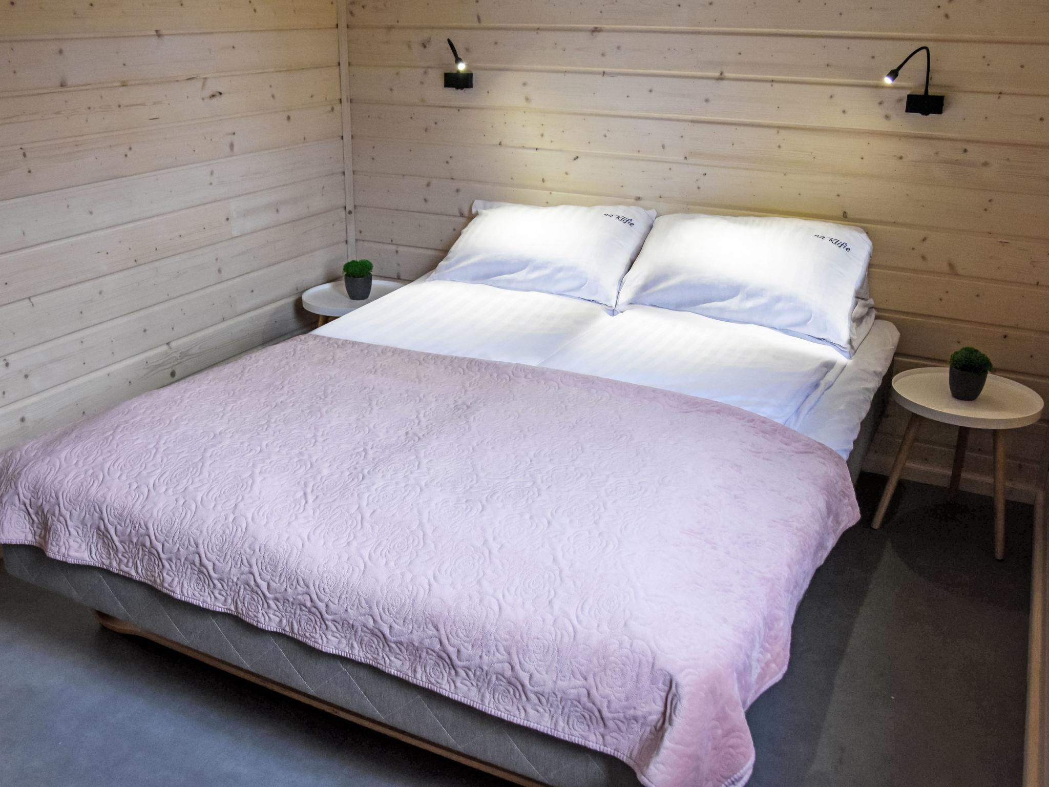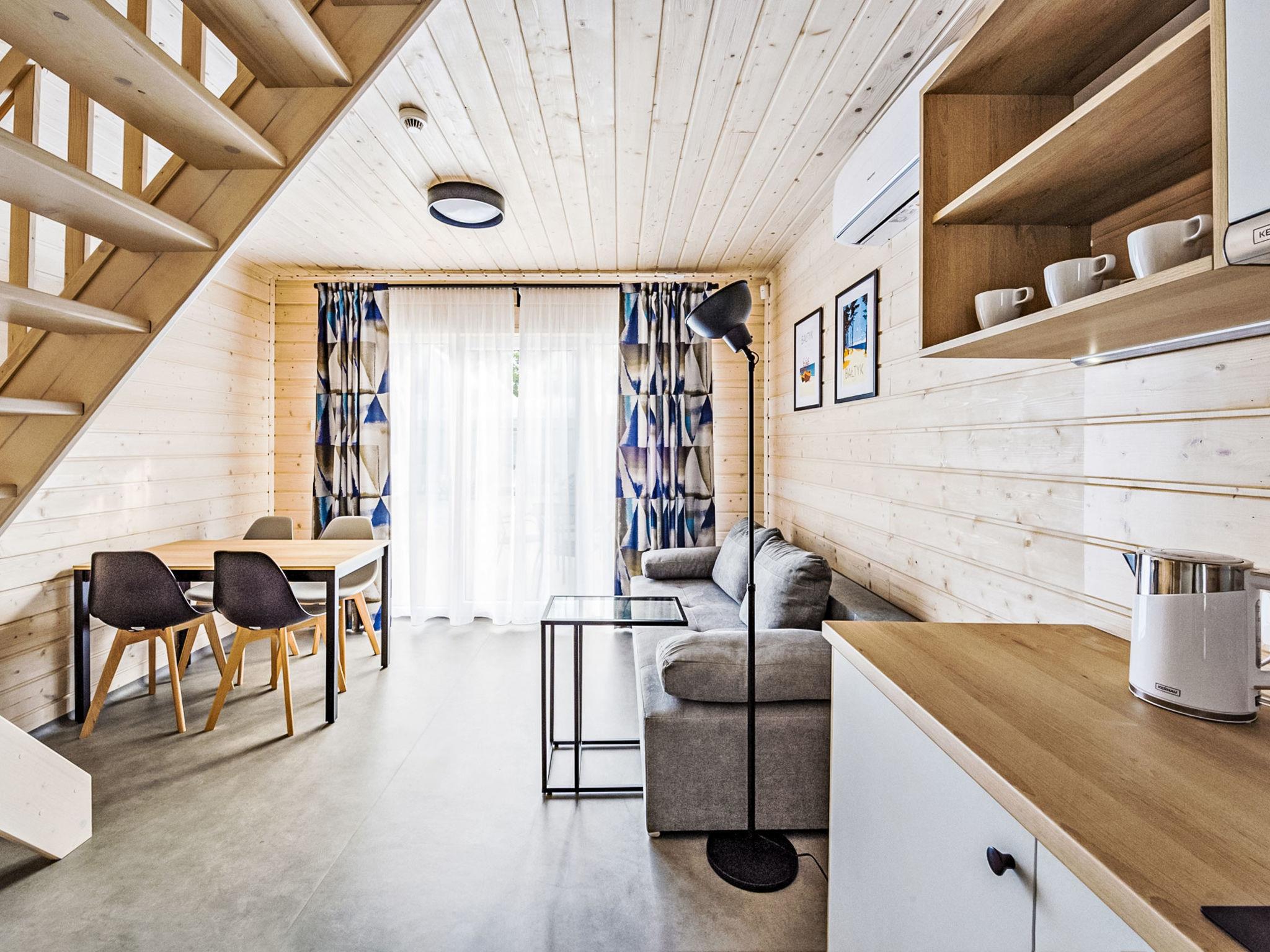 "Premium", 3-room house 35 m2. Comfortable and cosy furnishings: living/dining room with 1 sofabed and cable TV. Exit to the garden, to the terrace. Open kitchen (2 ceramic glass hob hotplates) with dining table. Shower/WC. Heating, electric heating. Upper floor: 1 room with 1 french bed (160 cm, length 200 cm). 1 room with 2 beds. Terrace 12 m2. Terrace furniture, deck chairs (2). Facilities: washing machine, hair dryer. Internet (WiFi). Parking at the house. Houses closest to the swimming pool area, with a 7-day stay, entry to the SPA area is free twice a week.