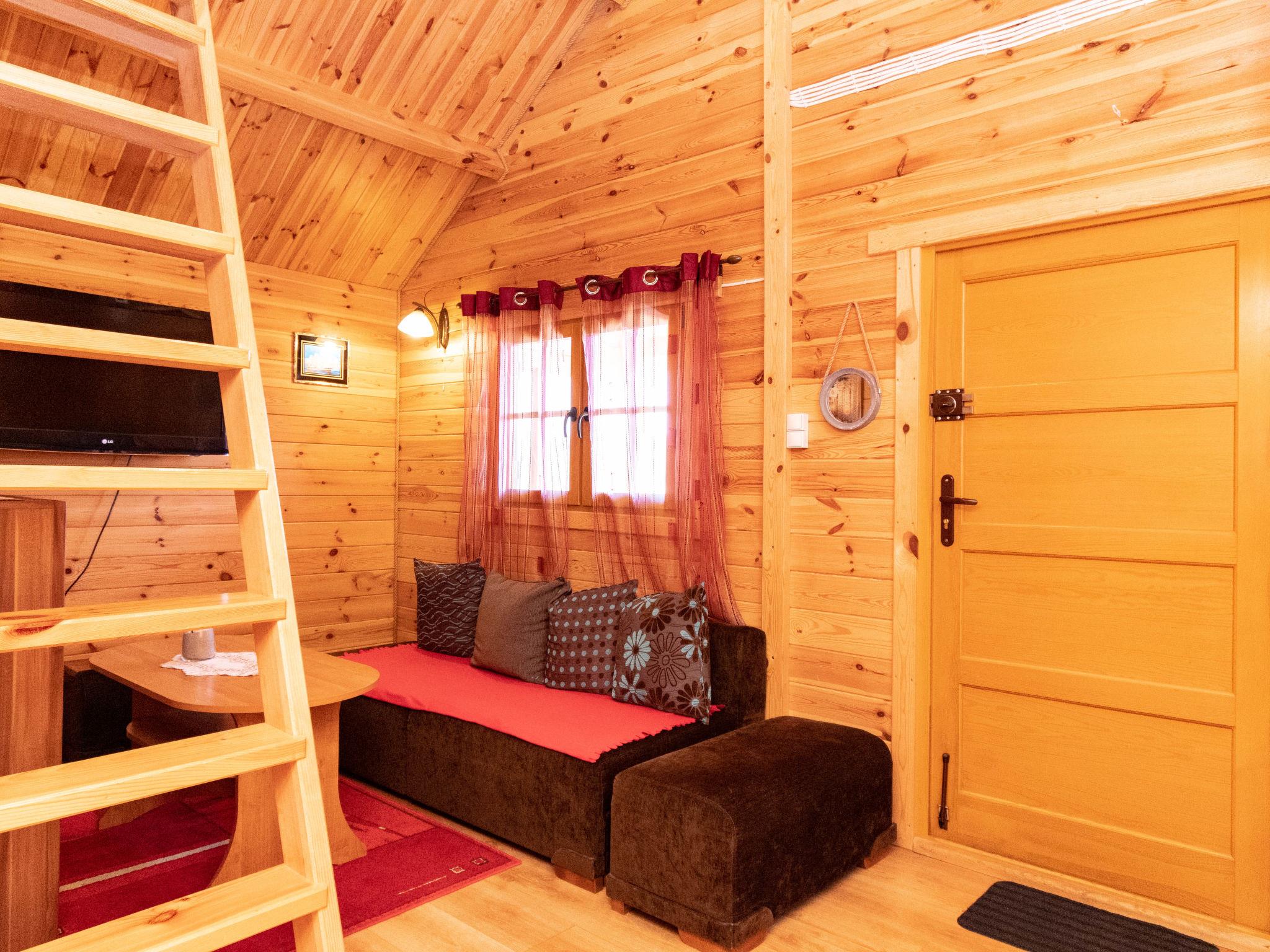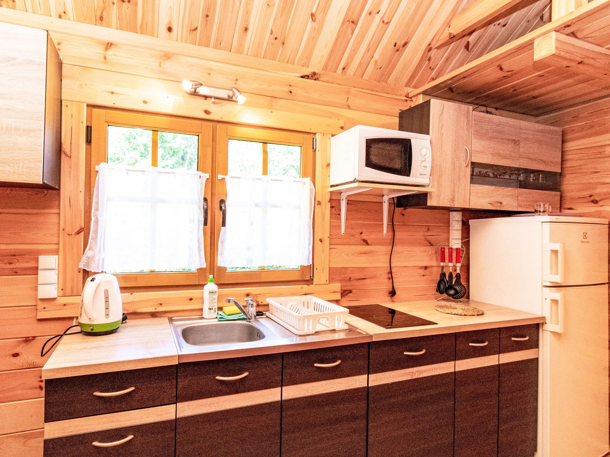 3-room house 35 m2 on 2 levels. Comfortable and cosy furnishings: living/sleeping room with 1 sofabed and satellite TV. Exit to the terrace. 1 room with 1 french bed. Open kitchen (2 ceramic glass hob hotplates, microwave, grill) with dining nook. Shower/WC. Heating, electric heating, boiler (80 litres). Top floor: (ladder) open gallery with sloping ceilings with 2 sleeping facilities. Terrace 10 m2. Terrace furniture, deck chairs (2). View of the resort. Facilities: dryer, iron, hair dryer. Internet (WiFi). Parking at the house. Please note: smoke alarm. The cottages may differ in the type of beds and kitchen equipment (double beds 140 cm or 2 single beds, kitchen equipped with a dining corner or table, gas stove or ceramic hob). Instead of an enclosed bedroom, some sleeping areas are located in an open-plan area (gallery, alcove, etc.).