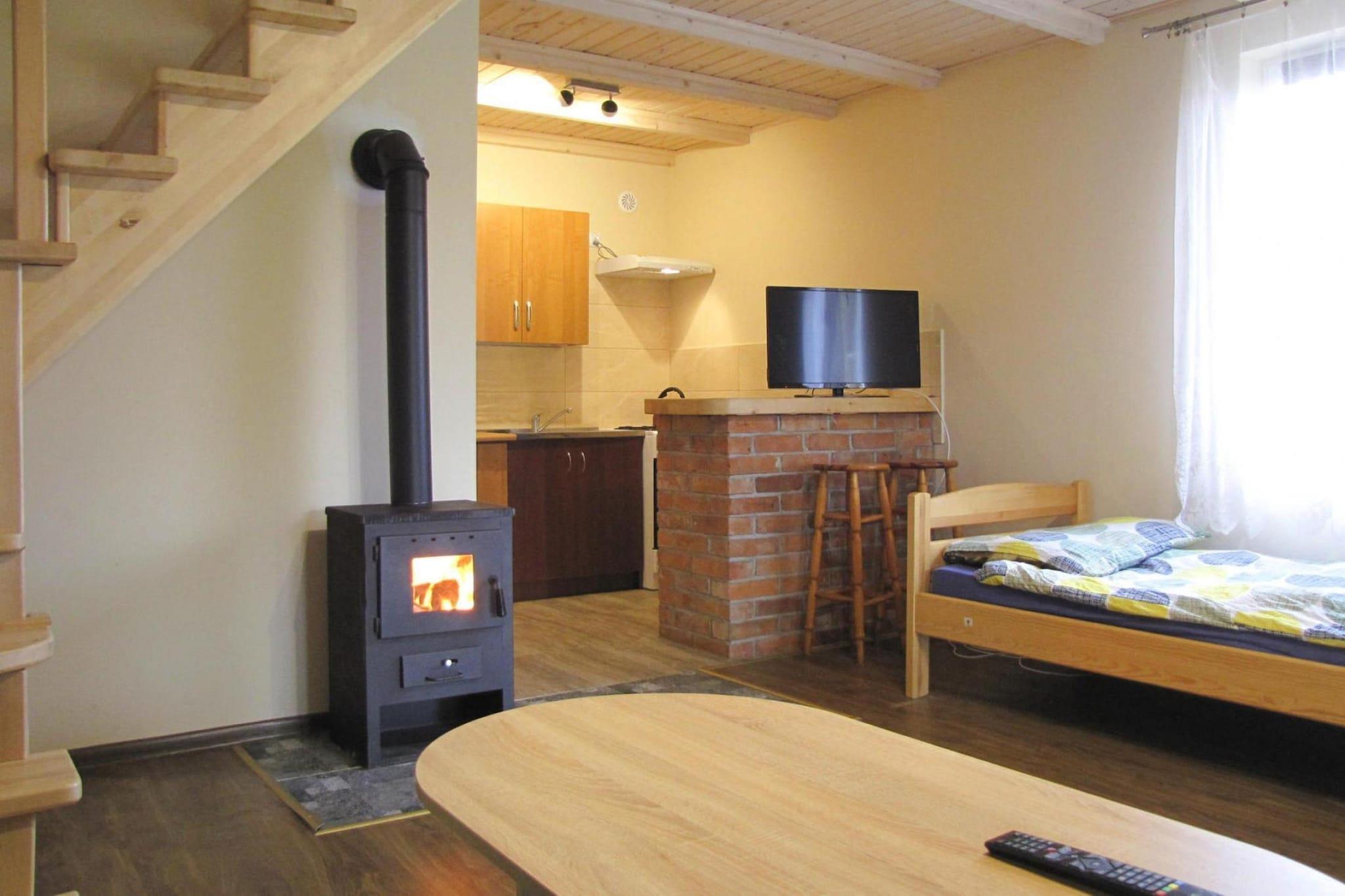 Hyggeligt feriehus for op til fem personer med pejs, få skridt fra Lake Olow. To komfortable soveværelser, et badeværelse med bruser og toilet samt en hyggelig stue med åbent køkken er fordelt på to etager. Bådene inkluderet i turprisen giver dig mulighed for at slappe af og udforske området fra vandet. Din udlejer driver en lille snackbar på stedet. Her får du 10% rabat Mellem søerne OlÓw og Rynskie ligger Ryn på en landtange. Gizycko, den største by i Landet med de tusinde søer, ligger mindre end 20 kilometer væk. Historien om din feriedestination går tilbage til det 14. århundrede. Selv i dag er slottet i centrum et minde om den lange og begivenhedsrige fortid. Slottet er nu omdannet til et moderne firestjernet hotel. Den lille havn ved Rynskie-søen og den udendørs pool på den sydlige bred af søen OlÓw er to populære mødesteder, især om sommeren. Detaljer: 2 kanoer 2 robåde Aktiviteter i nærheden: To søer i umiddelbar nærhed inviterer dig til at svømme eller gå en lang tur gennem landskabet præget af enge og skove. Veludviklede cykelstier danner grundlag for lange cykelture - her kan du opleve den næsten uberørte natur på tæt hold. Byen Gizycko ligger også kun omkring 18 kilometer væk. Husbåde, sejlbåde, motorbåde og kanoer, surfere, kajakroere og mere boltre sig på søerne omkring den historiske by. I sommermånederne er der mange udendørs og musikarrangementer. Den opsigtsvækkende fungerende vindebro over Gizycko Canal, en meget interessant objekt fra anden halvdel af det 19. århundrede, vel et kig værd, det er den eneste bygning af sin art i Polen og en af kun to i Europa.