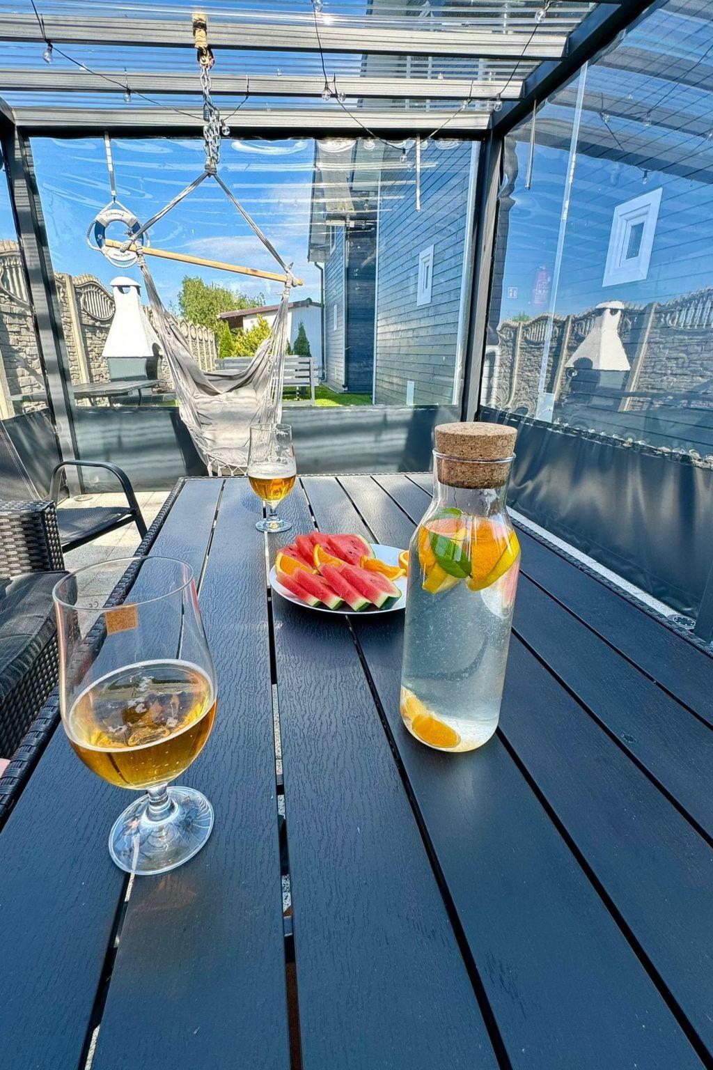 The property is monitored. We offer 1 parking space for each house on the property.In the common area: children's playground, sandpit with toys, bicycles and barbecue area.Individual terrace equipment: garden furniture (table + 6 chairs), awning.