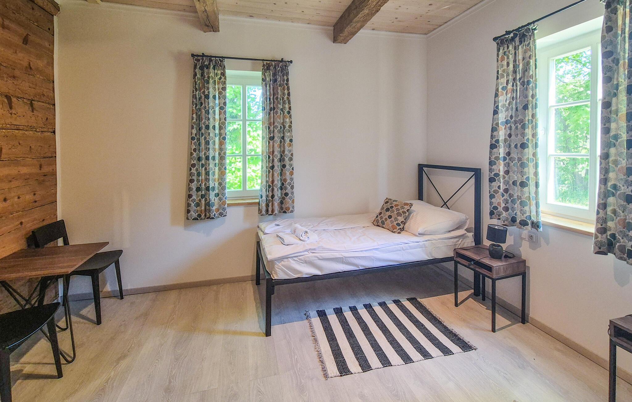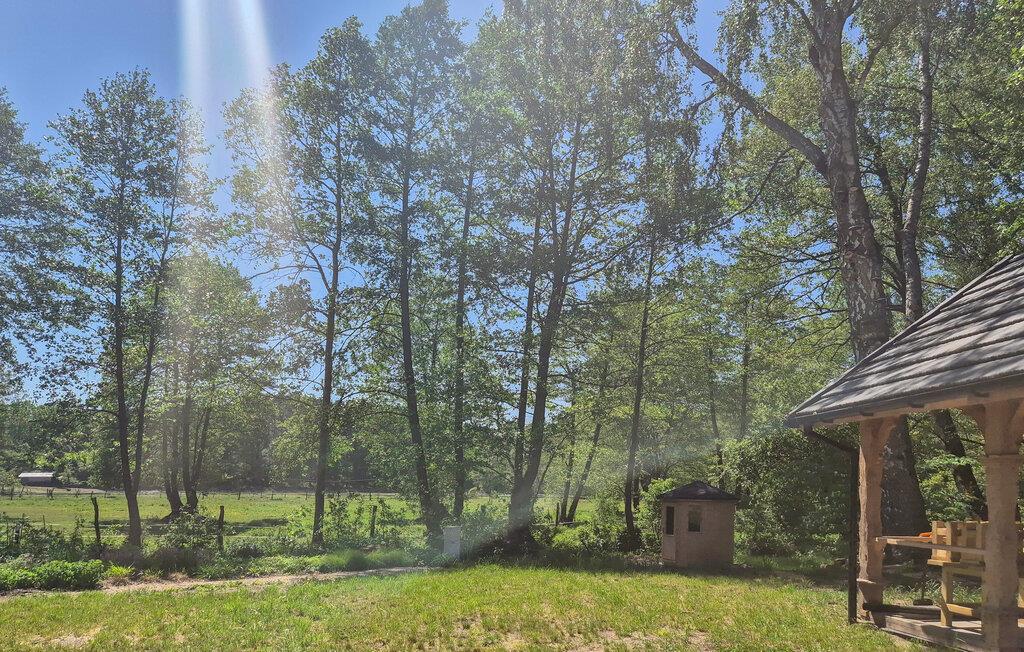 Dette charmerende træhus ligger kun nogle få meter fra bredden til en flod.