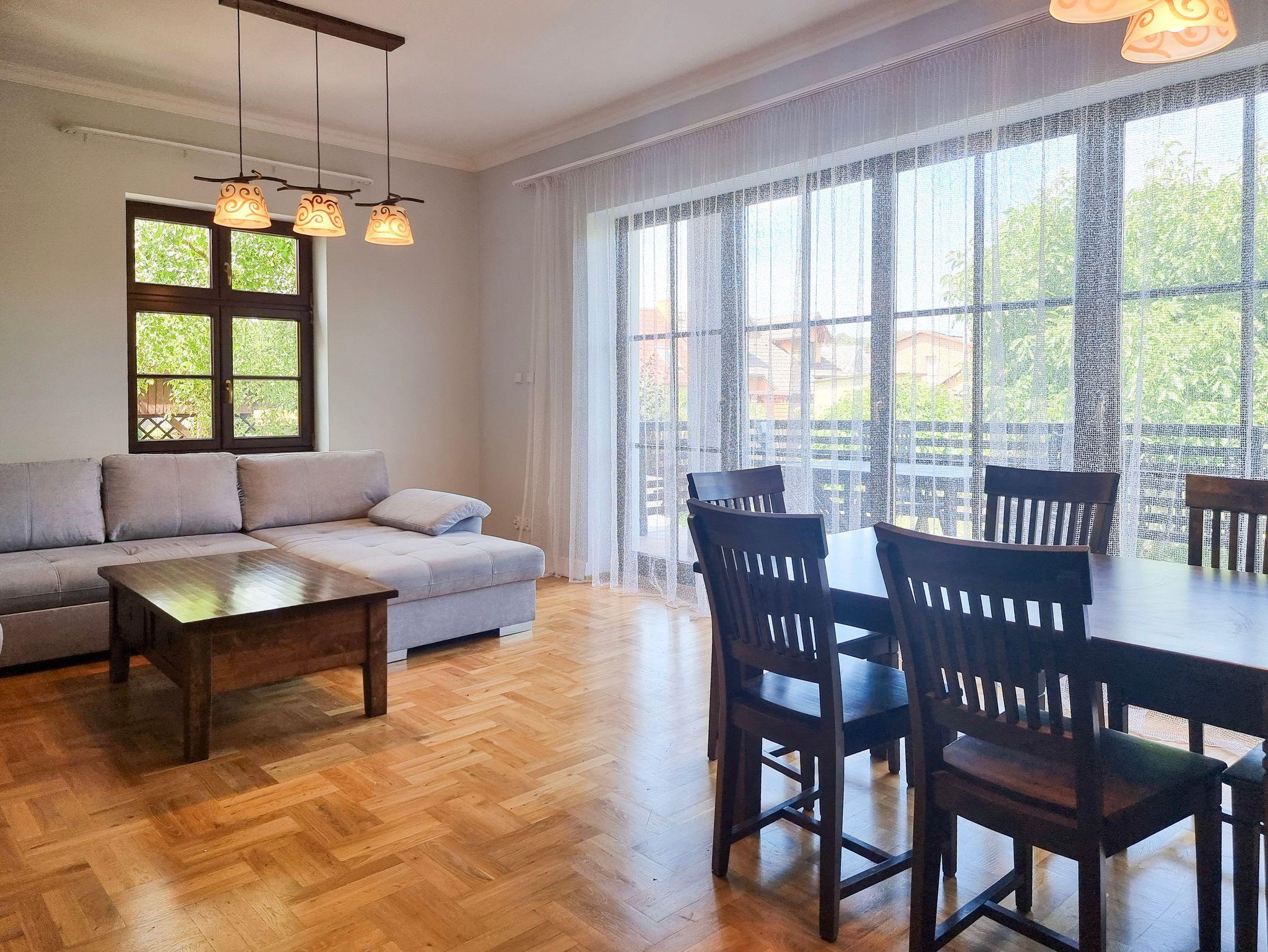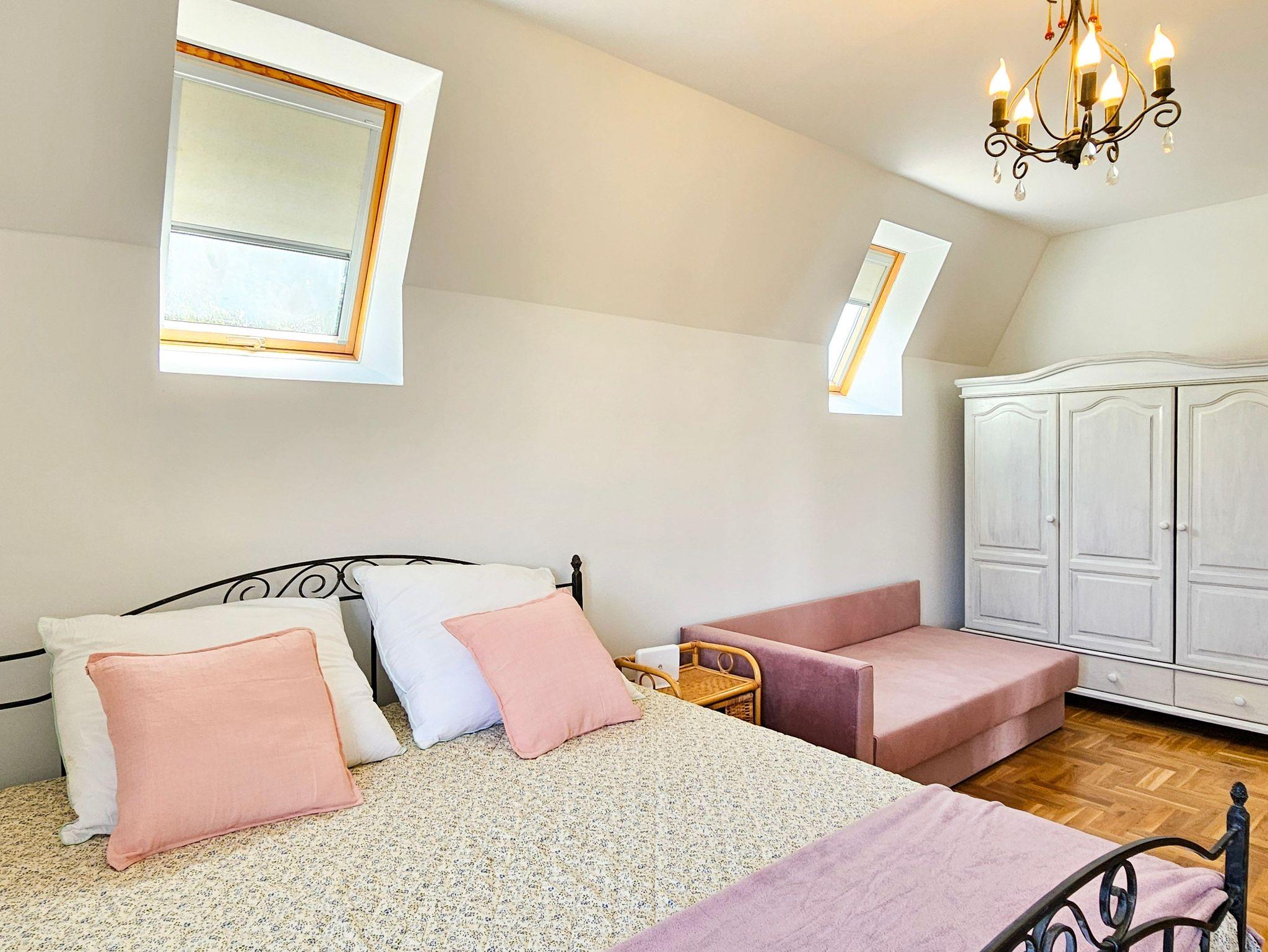 Großzügiges Wohnzimmer mit Zugang zur Terrasse. Für die Gäste: große Schlafcouch, zusätzliche 2-Sitzer-Couch, Tisch mit 6 Stühlen, Fernseher, Kommode. Auf der Terrasse befinden sich Gartenmöbel und eine Treppe zum Garten. Grillmöglichkeit vorhanden.