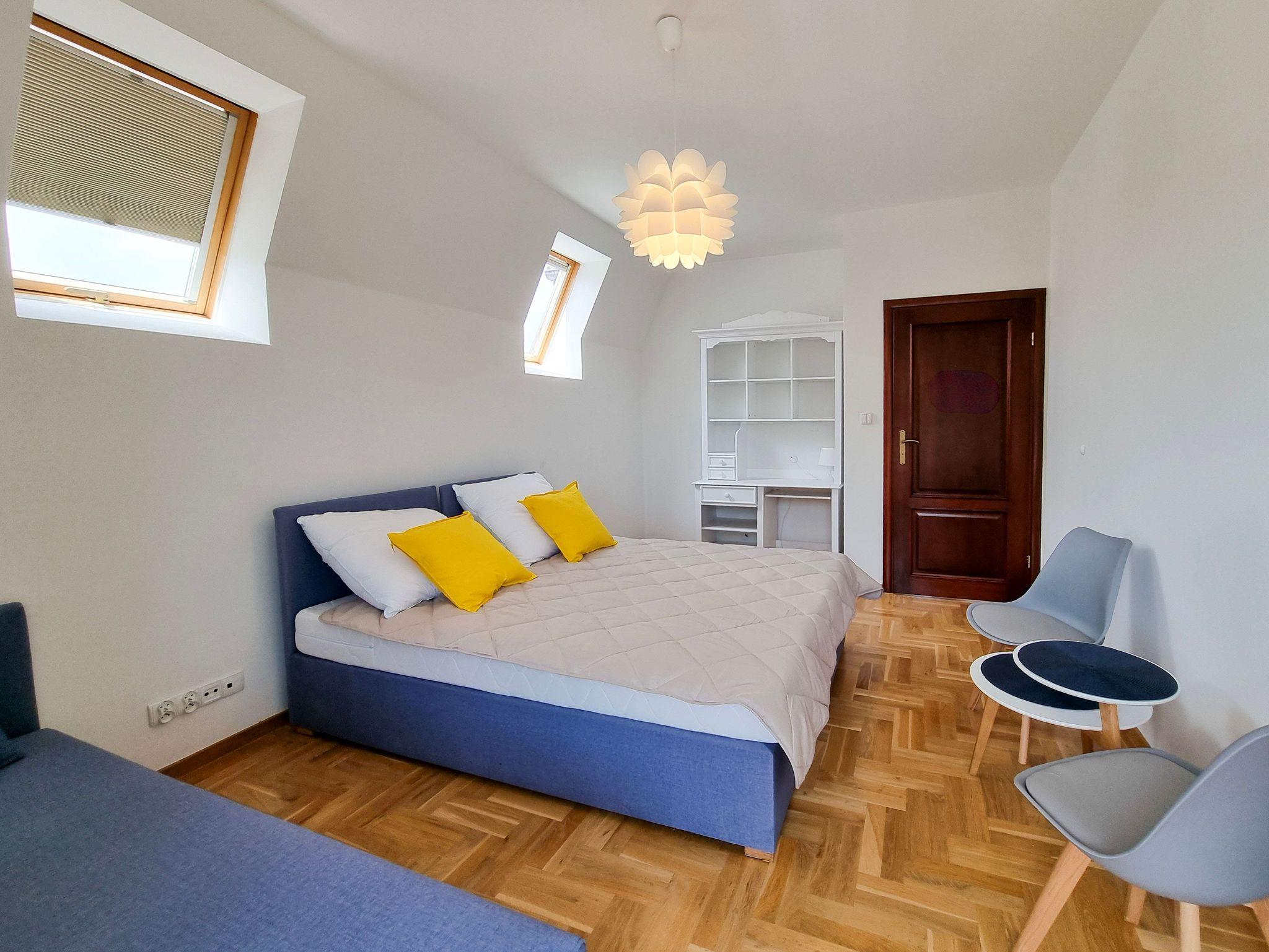 Schlafzimmer 4: Doppelbett, Einzelschlafsofa, Tisch mit 2 Stühlen, Regal.