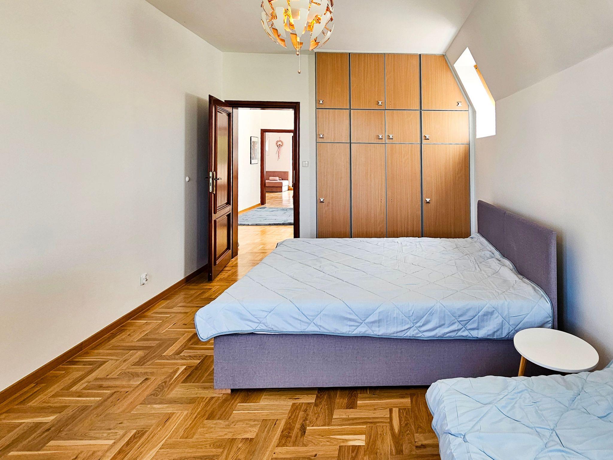Schlafzimmer 1: ausziehbares Doppelbett (2x 80x200 cm), Einzelschlafsofa, Tisch mit 2 Stühlen, Kleiderschrank, Zugang zum Balkon gemeinsam mit Schlafzimmer 2.