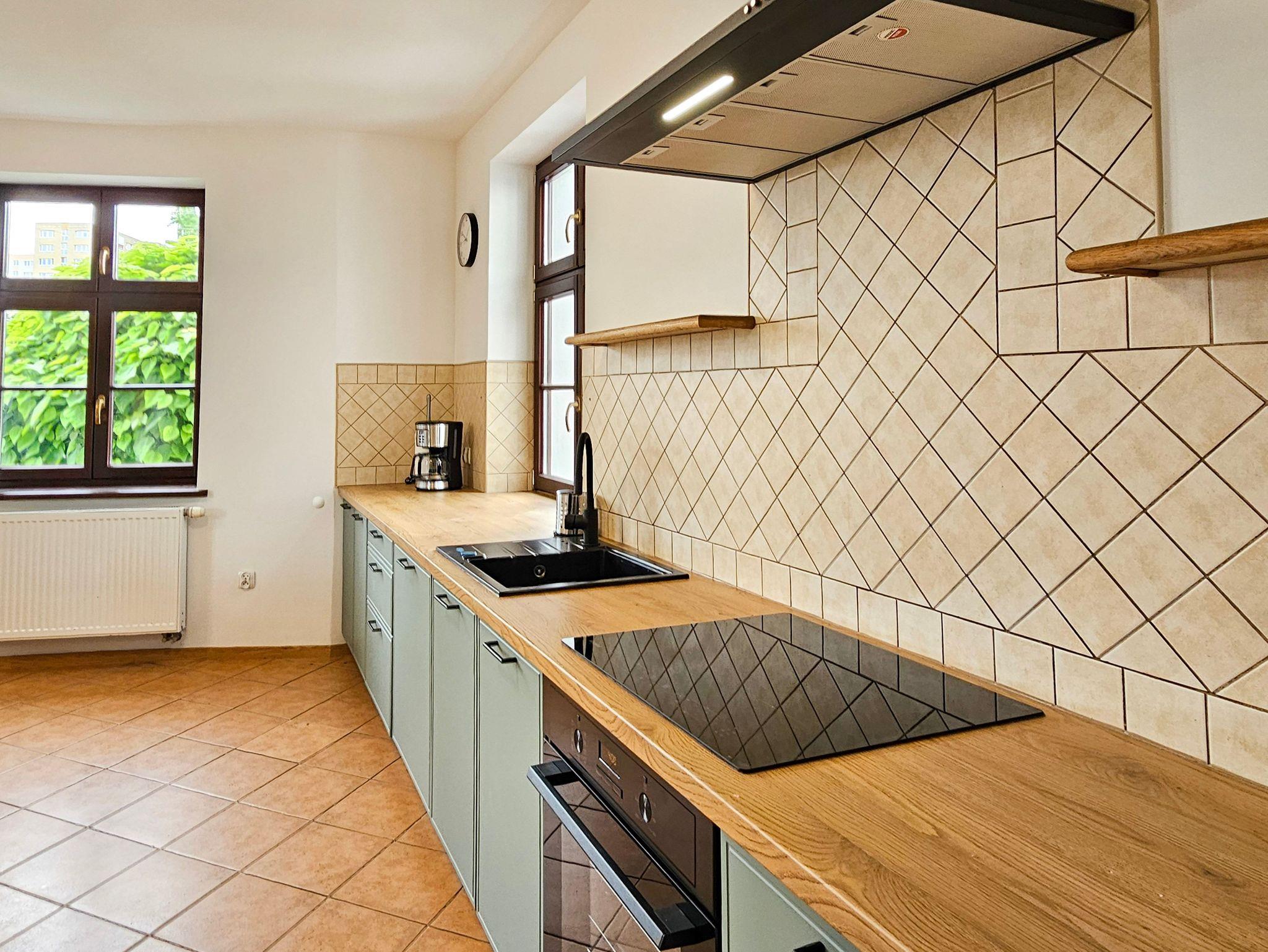 Großem Essbereich mit Küchenzeile ? ein heller Raum mit nach Süden ausgerichteten Fenstern. Den Gästen stehen zur Verfügung: ein ausziehbares, bequemes Doppelschlafsofa, ein Esstisch mit 8 Stühlen, eine voll ausgestattete Küchenzeile mit Dunstabzugshaube, Geschirrspüler, Backofen, Induktionskochfeld mit 4 Platten, Einzelspülbecken, Geschirr, Töpfe, Besteck sowie eine Speisekammer mit großem Kühlschrank mit Gefrierfach und Waschmaschine.