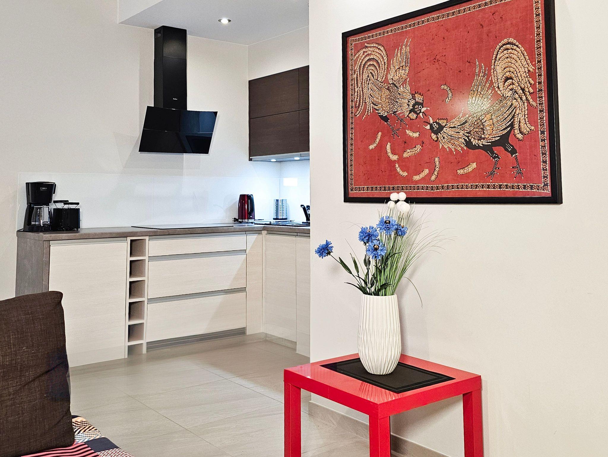 Zur Verfügung steht ein elektrischer Wasserkocher, eine Kaffeemaschine, ein Toaster, eine Spülmaschine, ein Kühlschrank, eine Mikrowelle und ein Elektroherd mit 4 Heizplätzen.