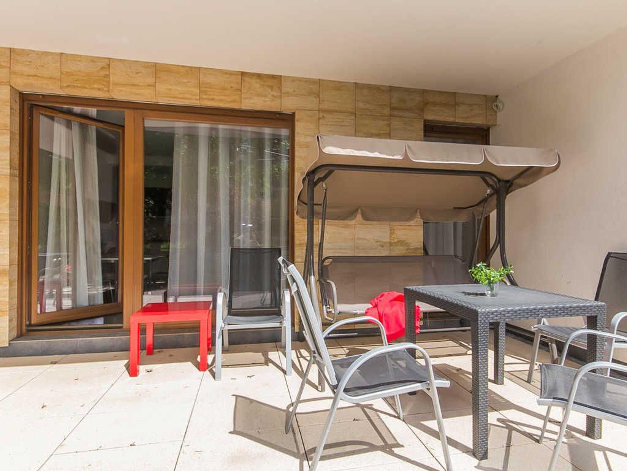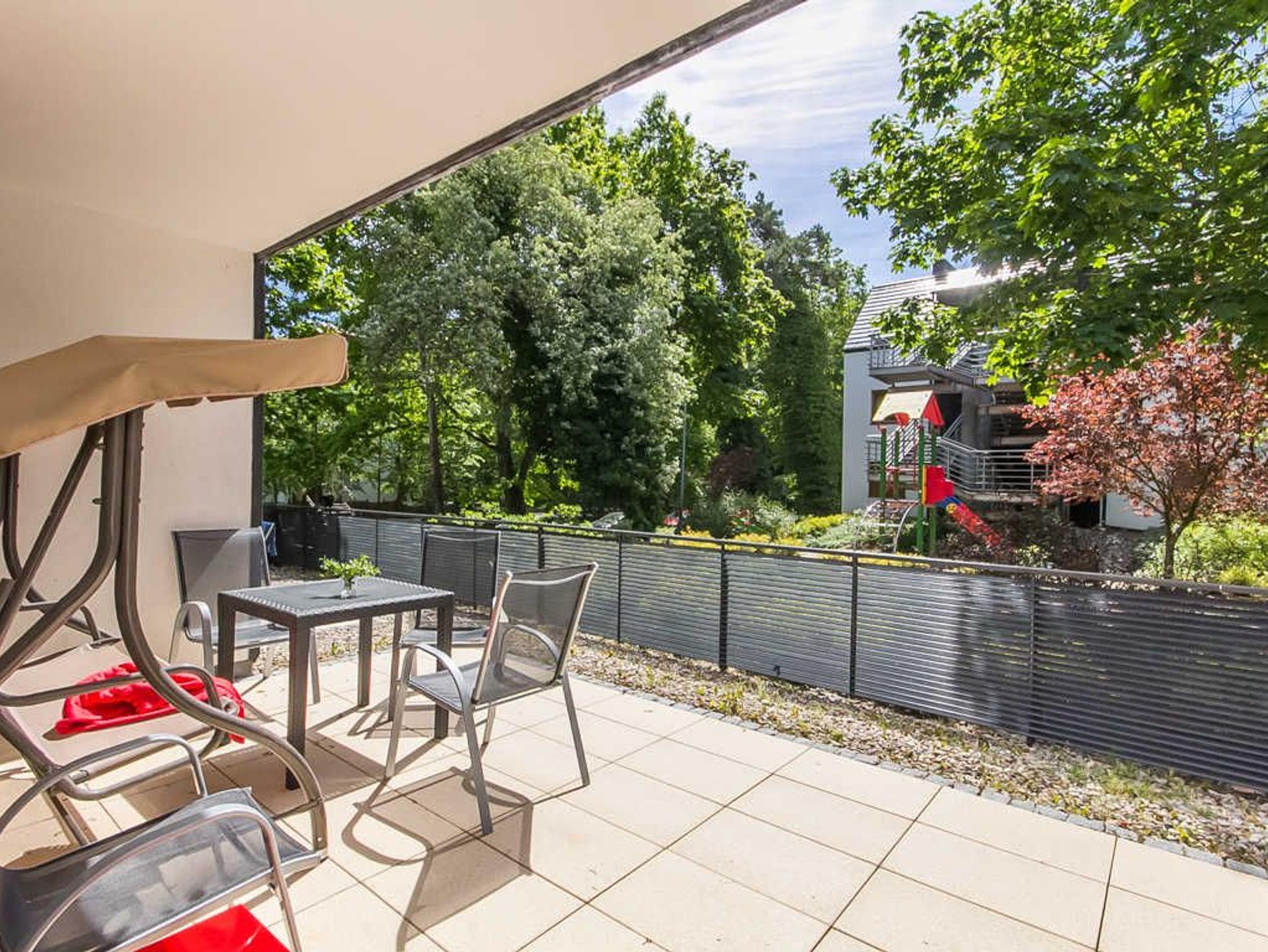 Vom Wohnzimmer aus können Sie auf die sonnige Terrasse mit Gartenmöbeln