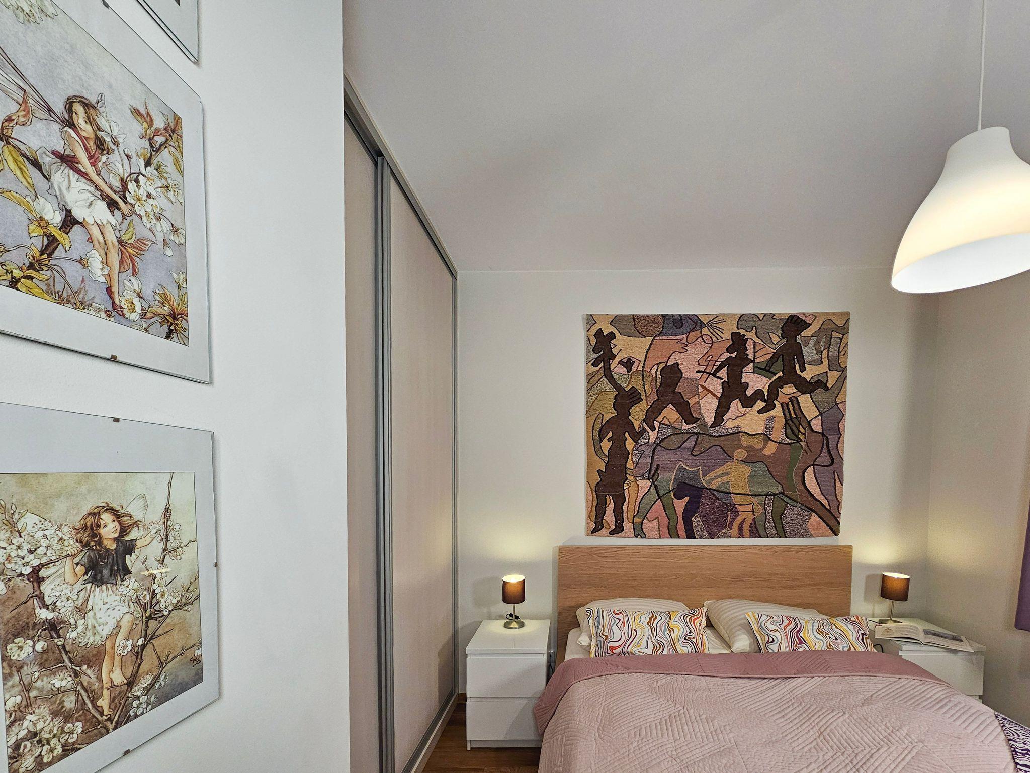Im Schlafzimmer steht ein Doppelbett, ein großer Kleiderschrank und eine Frisierkommode.