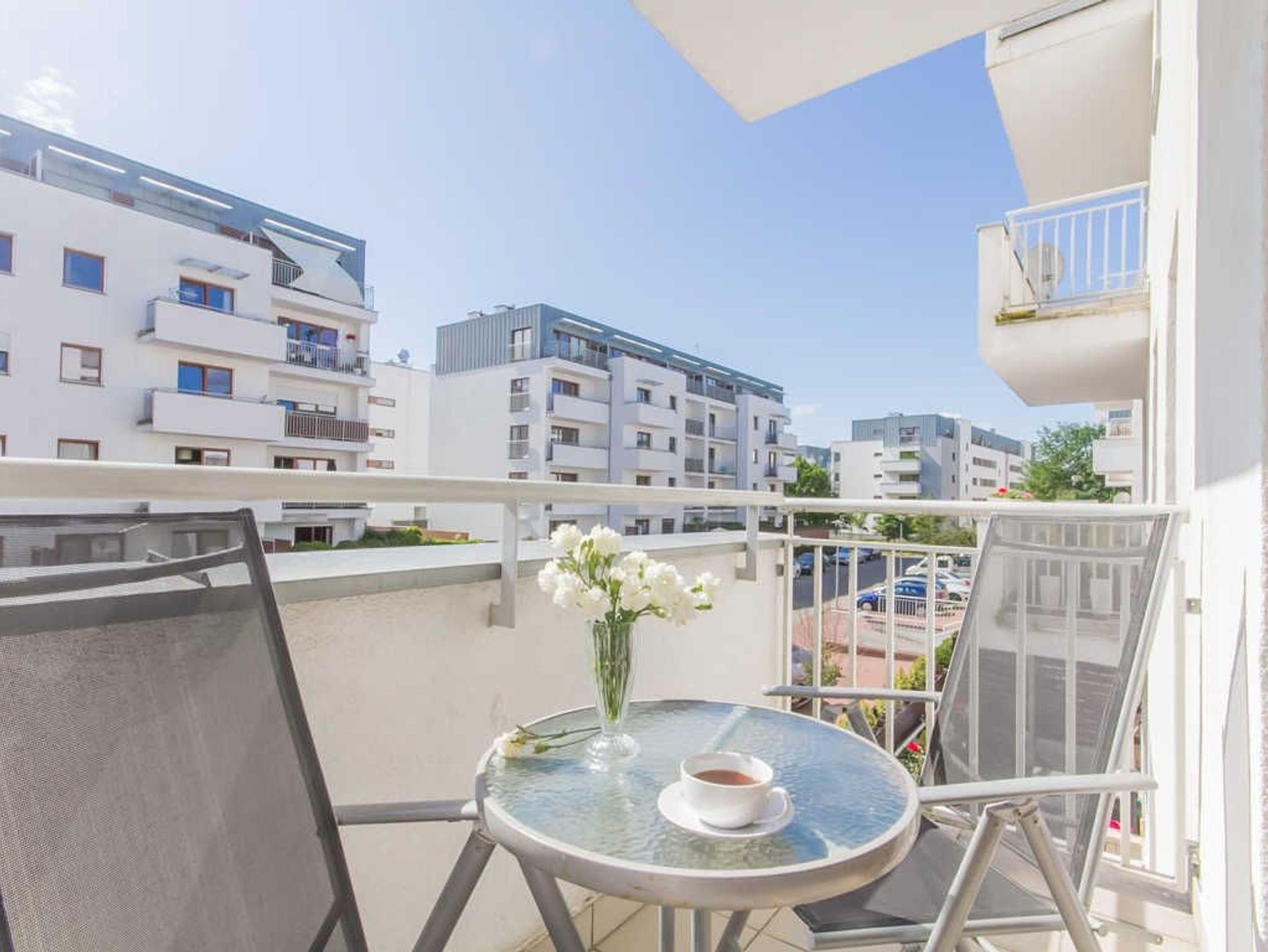 Die Wohnungsfenster öffnet sich auf einen Balkon (von der Ostseite), wo ein Tisch und zwei Balkonstühle zur Verfügung stehen.