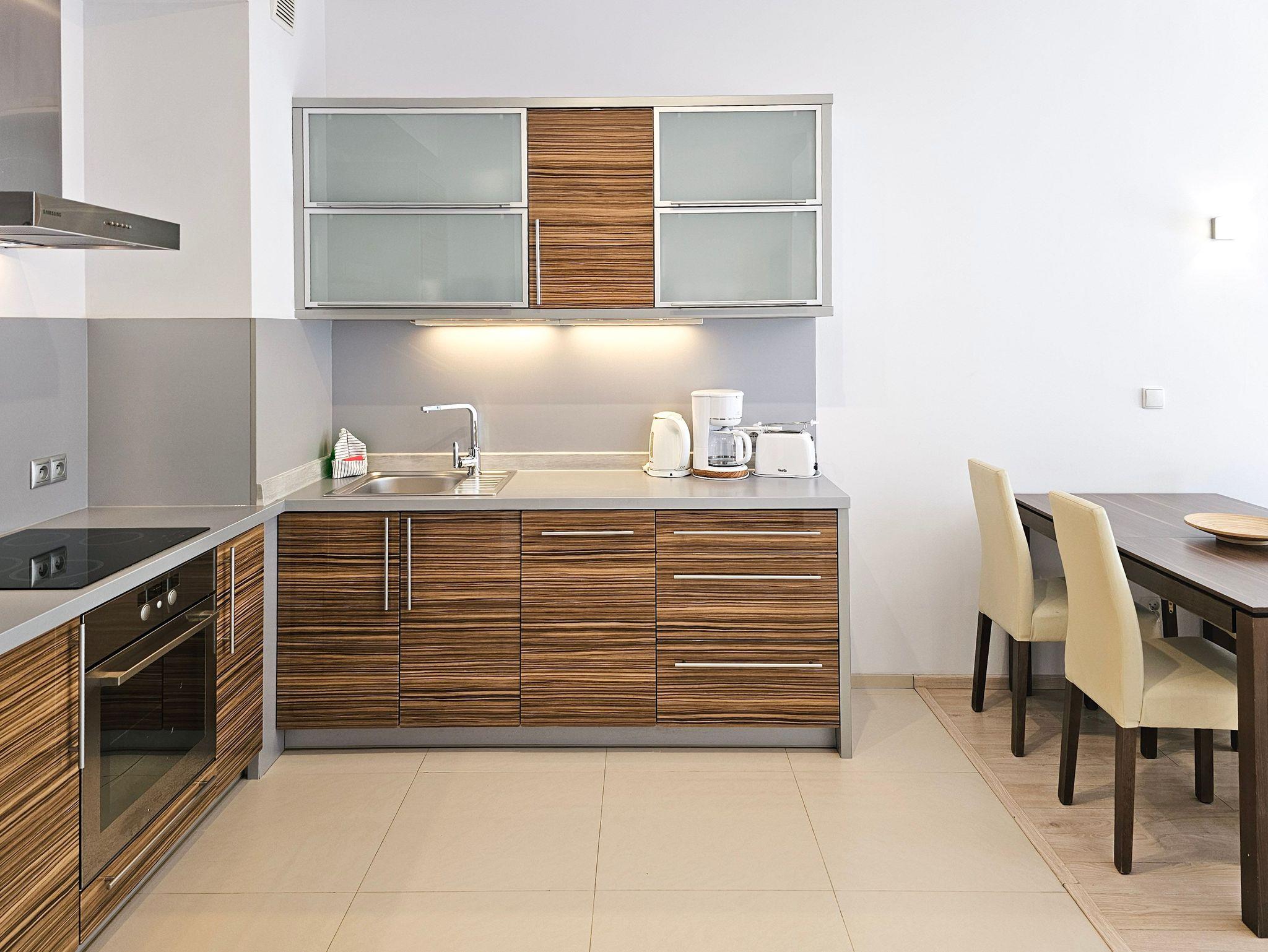 Die funktionelle, voll ausgestattete Küchenzeile verfügt über einen Kühlschrank mit Gefrierfach, Herd mit Ceranfeld, Backofen, Geschirrspüler, Wasserkocher, Toaster, Kaffeemaschine, Töpfe, Geschirr und Besteck.